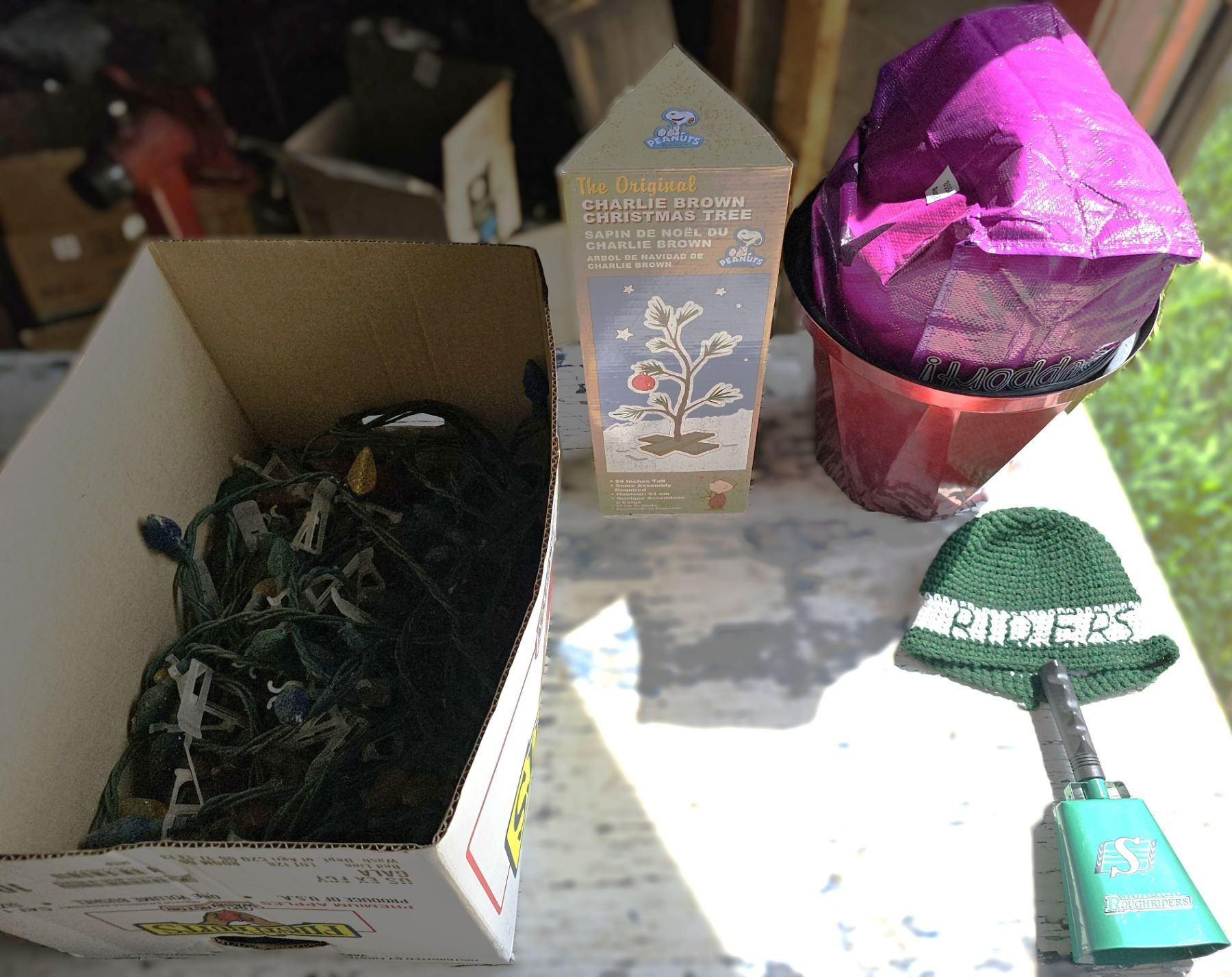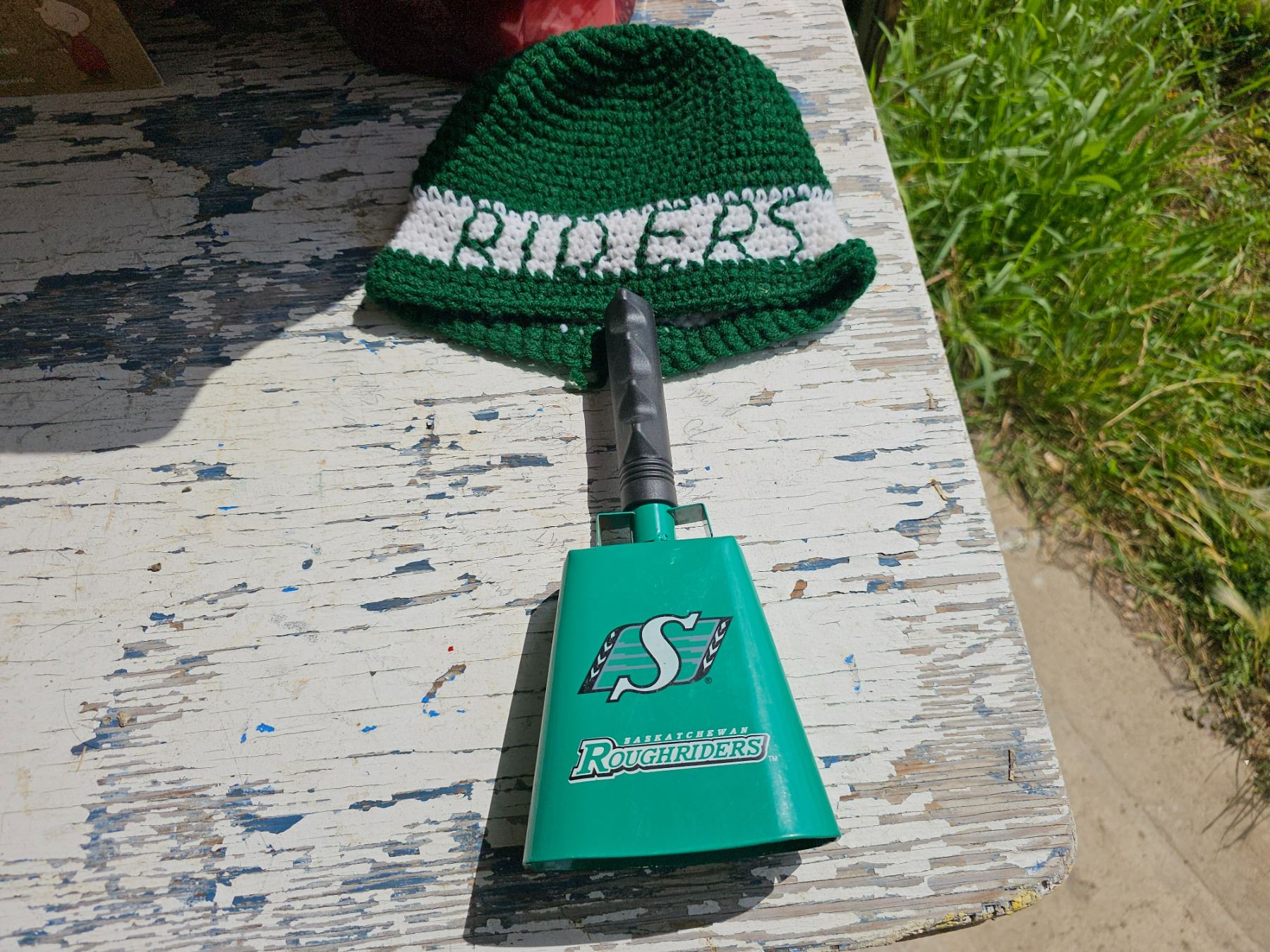 Box of Misc Stuff/Rider Crochet Toque/Rider Hand Bell