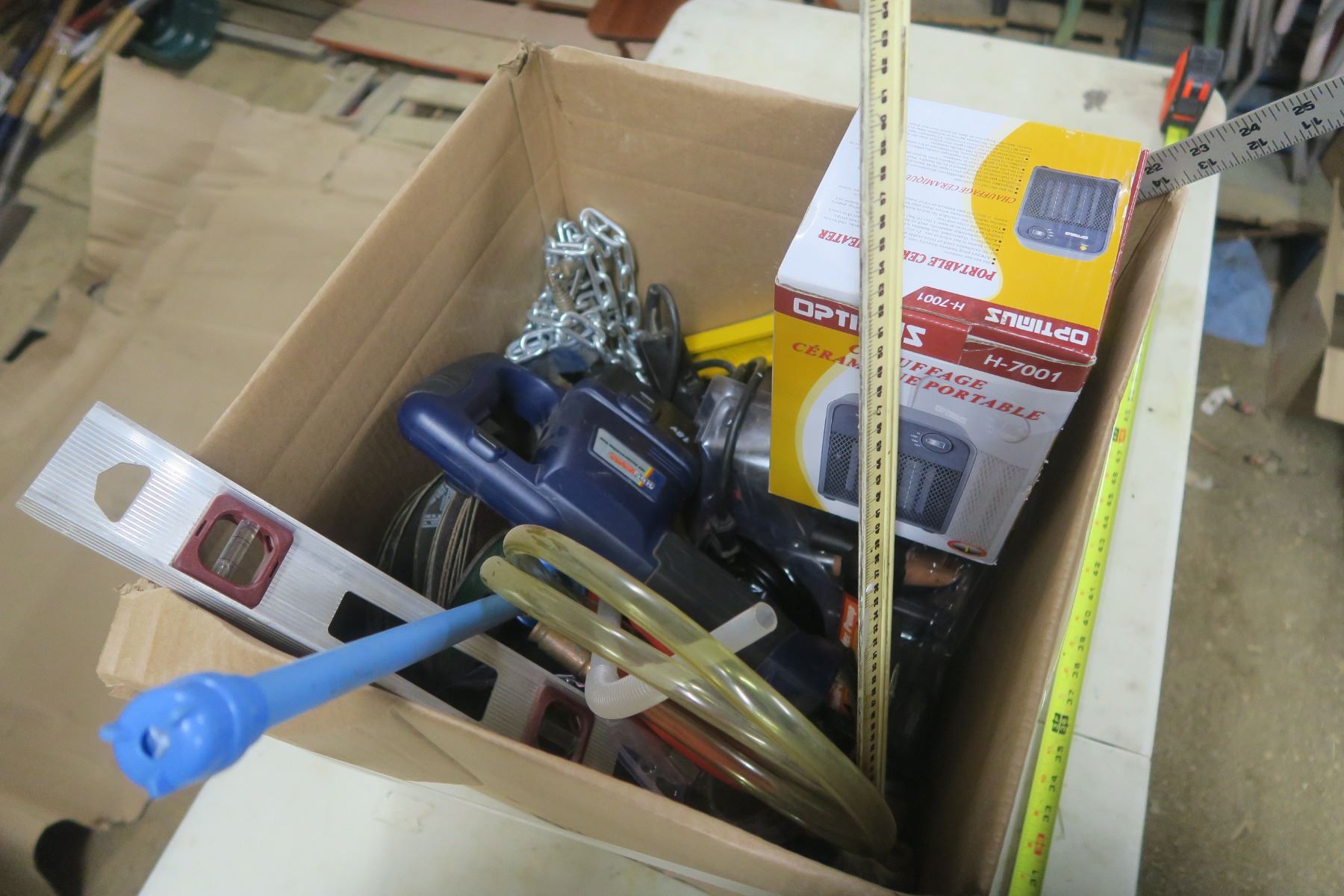 Box of Misc. Tools Including Levels, Rulers, Drill Press Vice & Much More