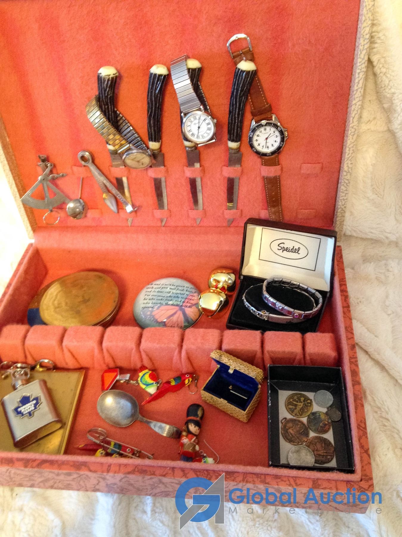 Box of Misc (Watches, Jewelry, Compacts, Old Tokens, etc)