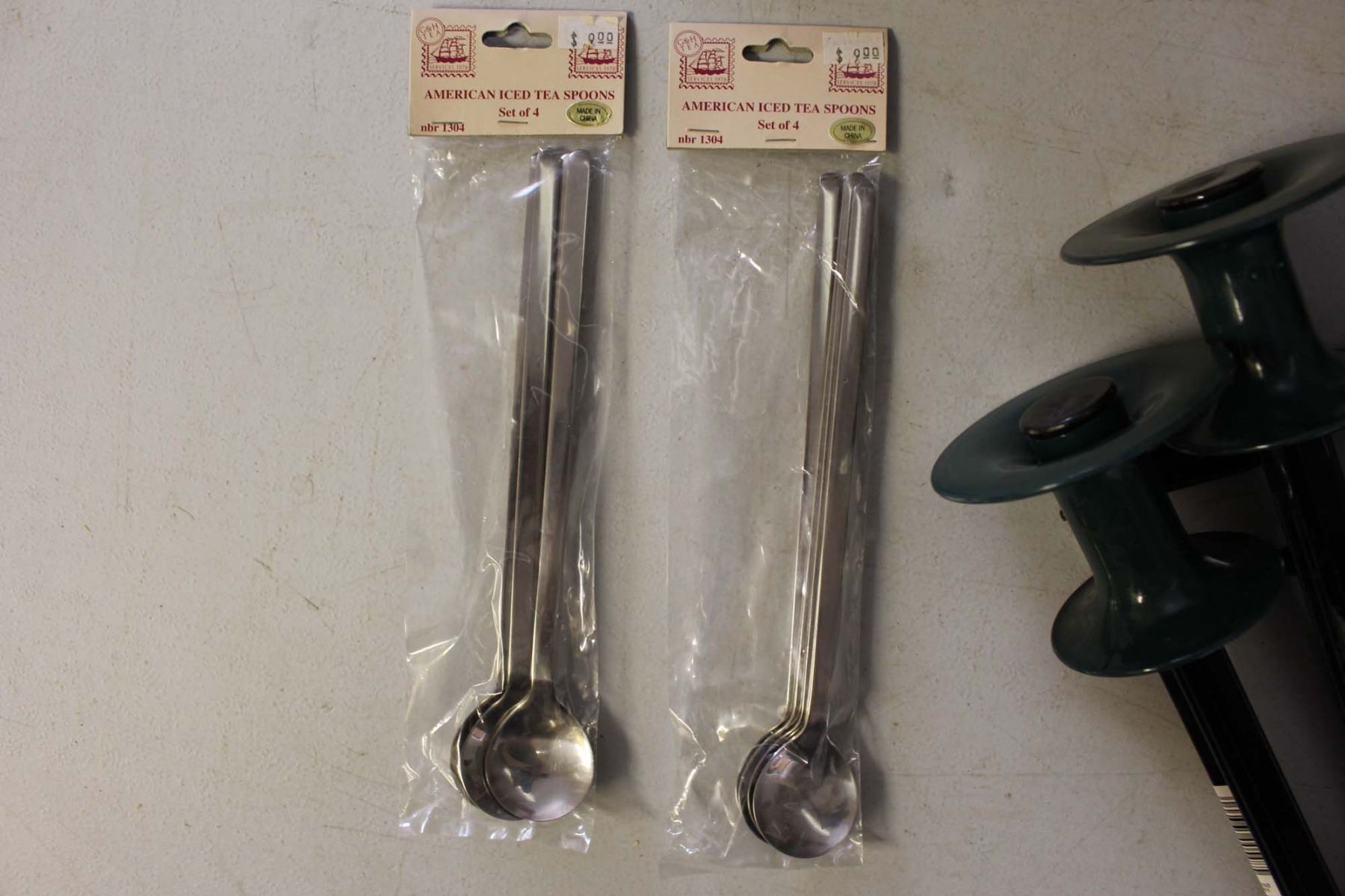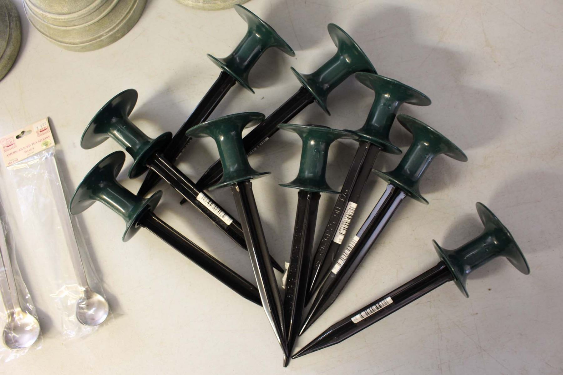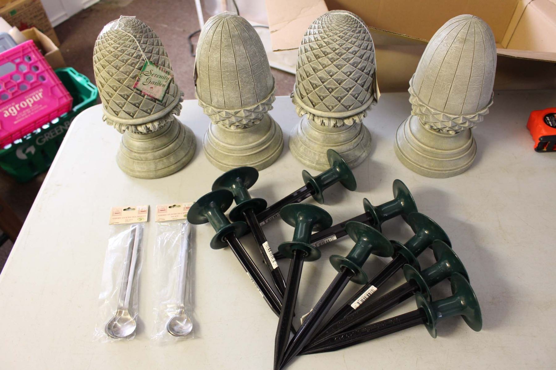 Box of Misc Yard Decor and Iced Tea Spoons