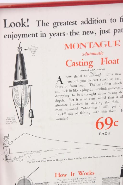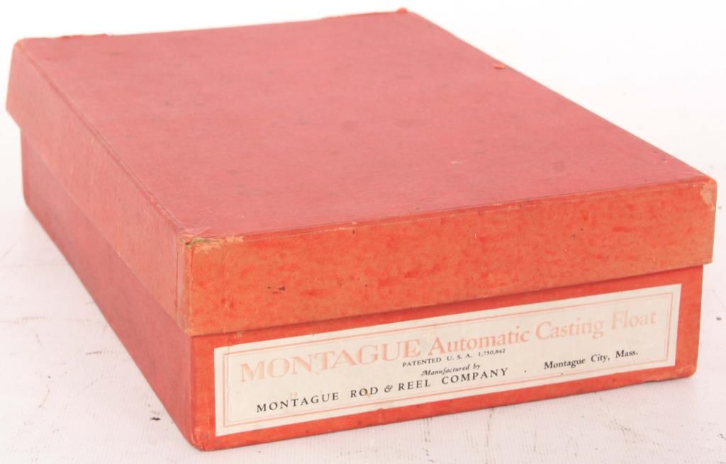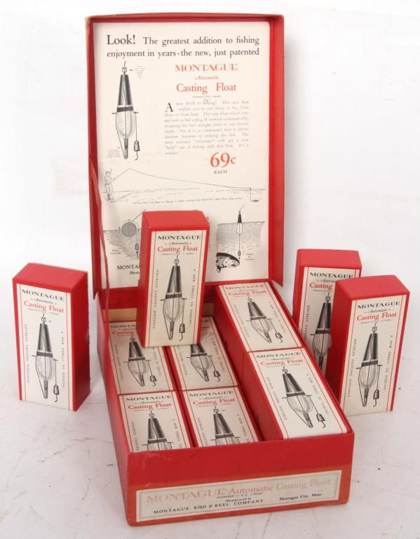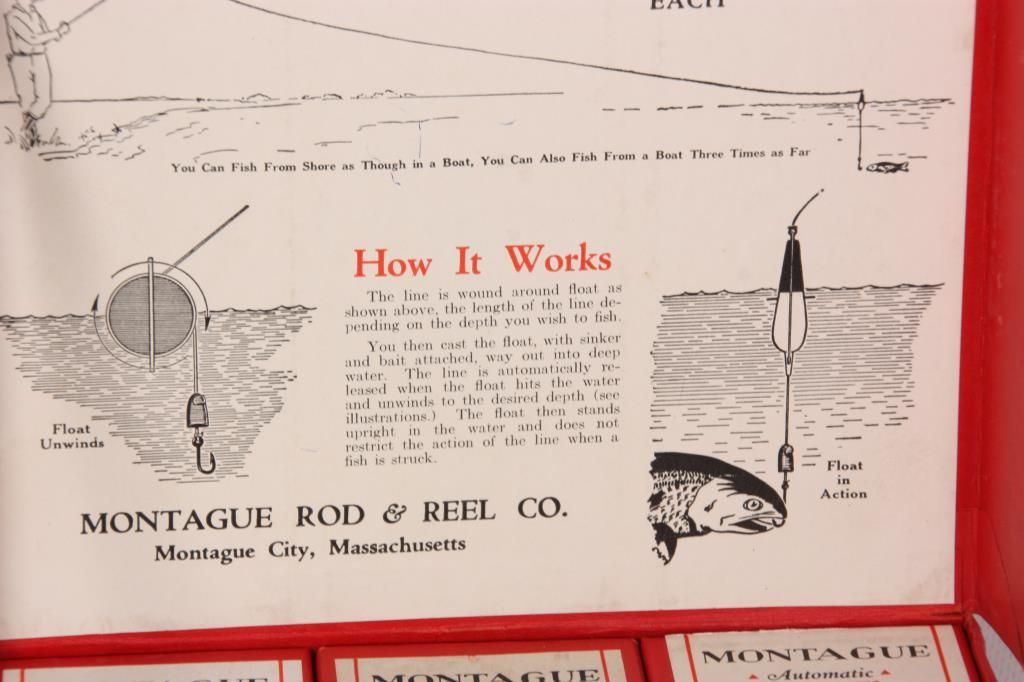 Box of Montague Automatic Casting Floats. Original box containing 12 original and unopened floats or bobbers; Made by the Montague Rod & Reel Company, Montague, Mass. U.S.A. Patent number 1,750,842. In excellent unused condition.
