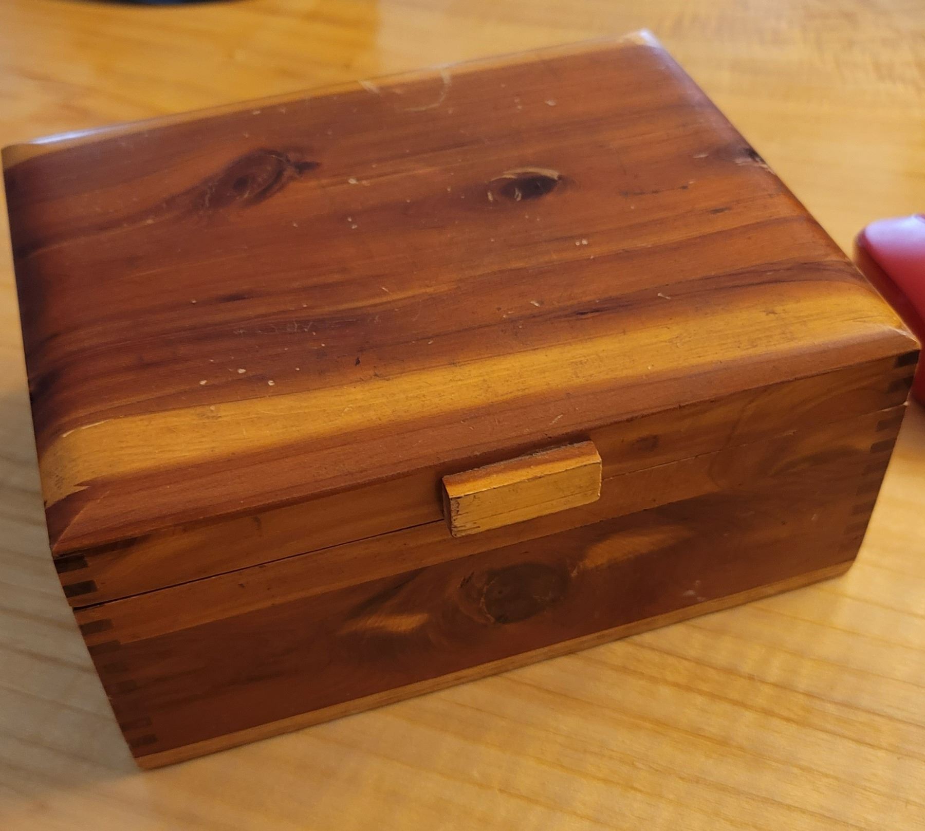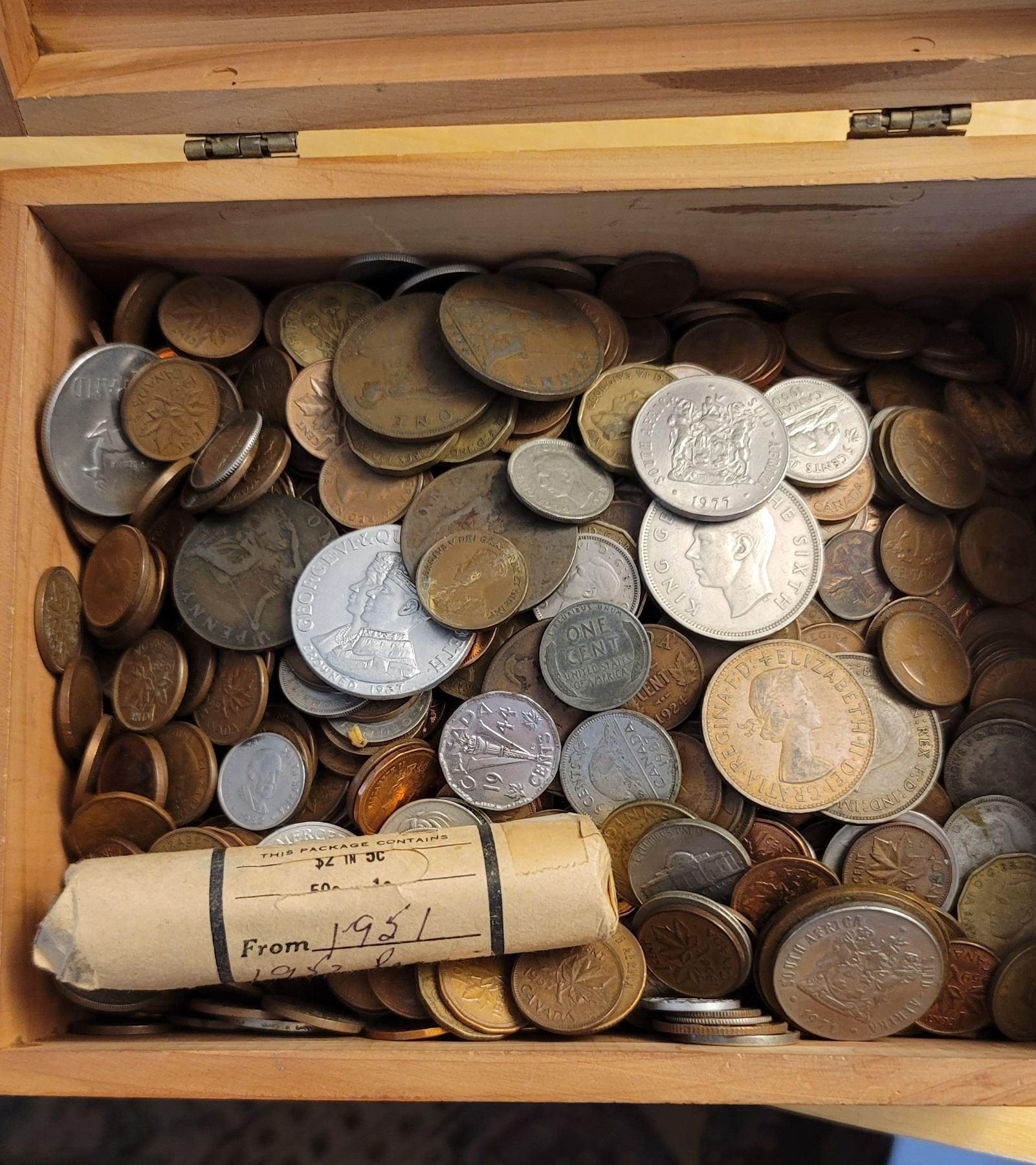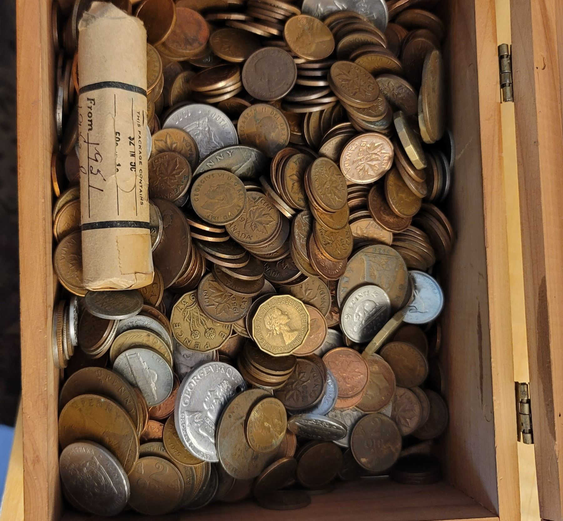 Mostly Canadian coins. Box is made of cedar wood. Including coins from 1800s to 1970s.