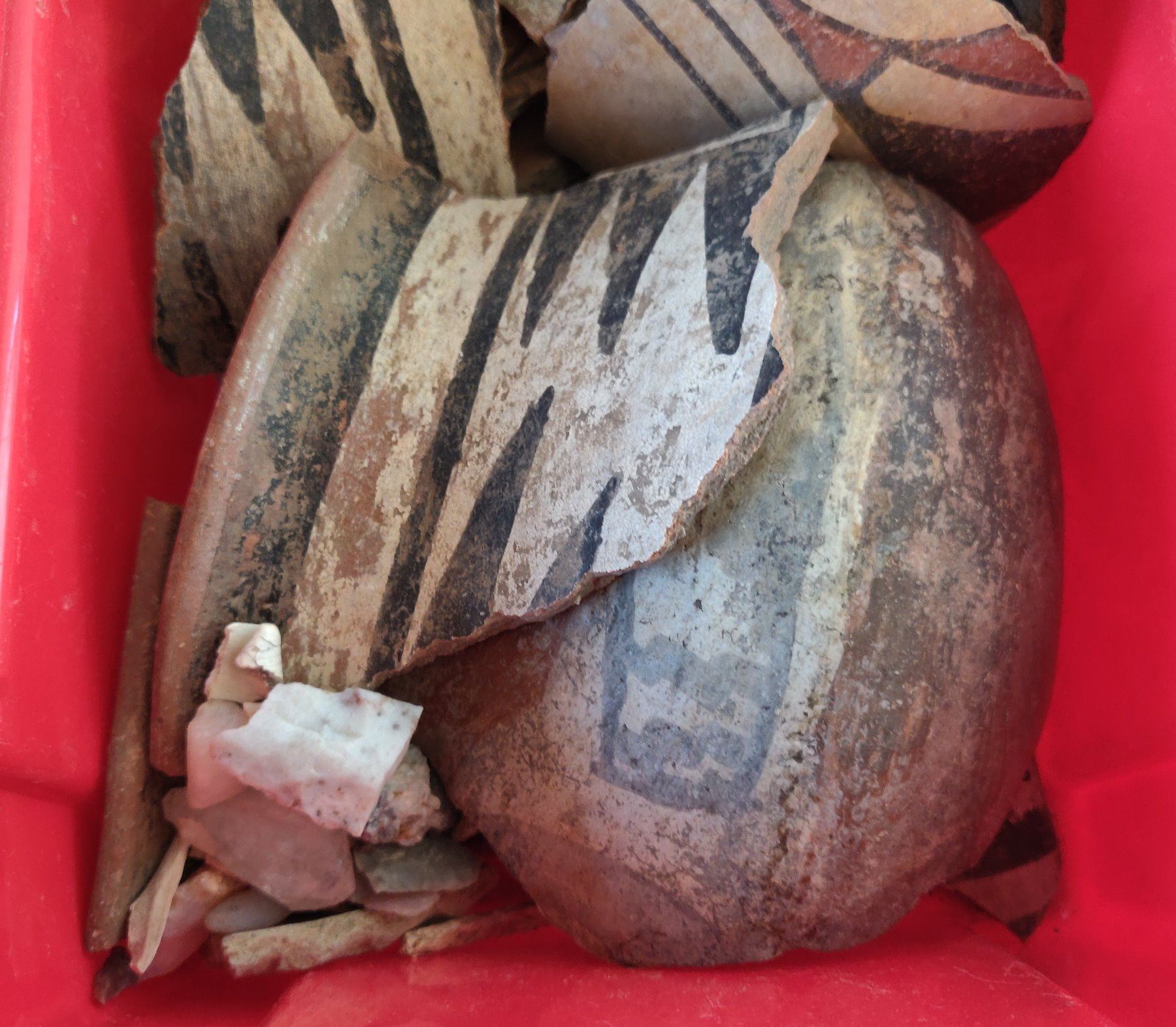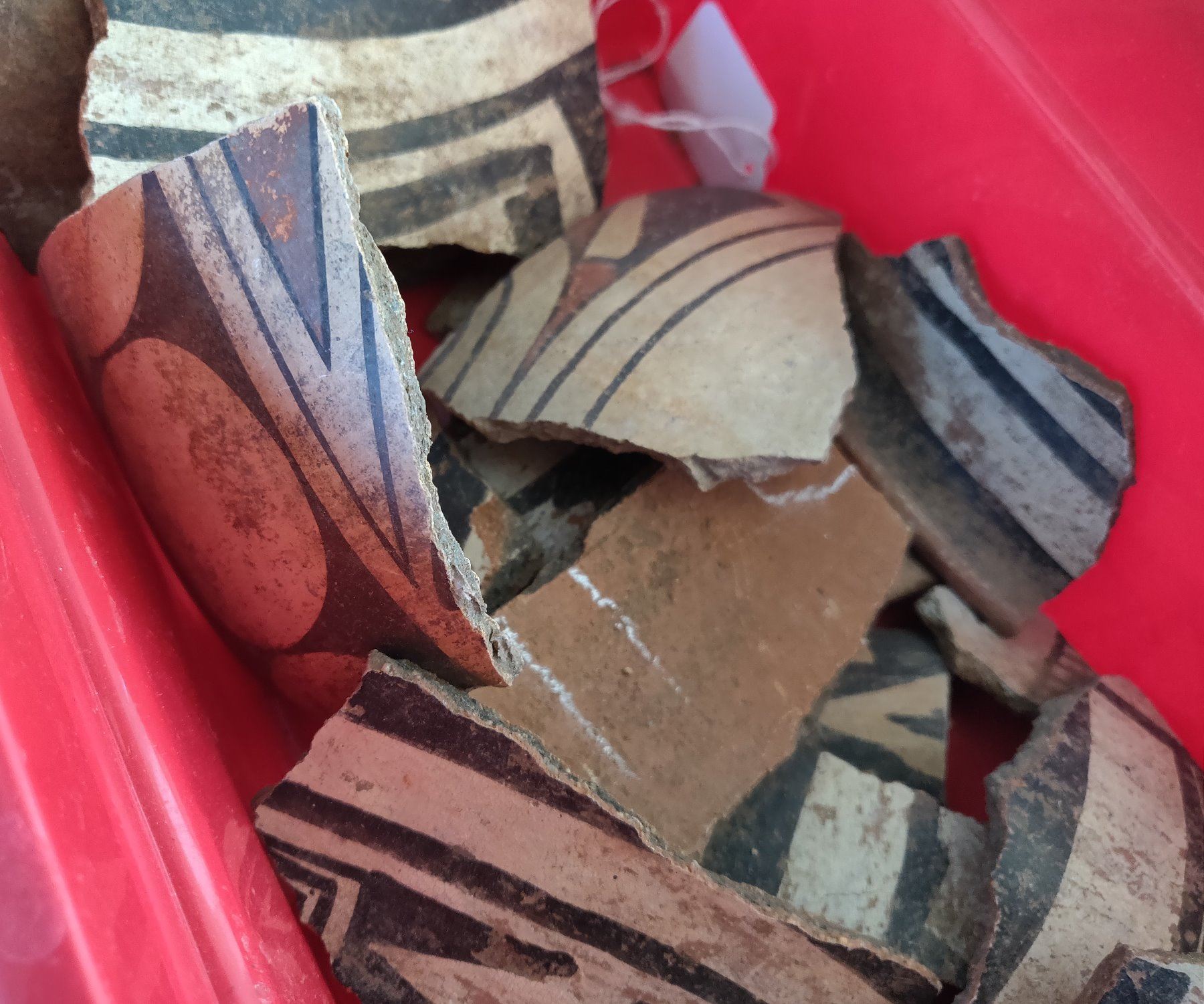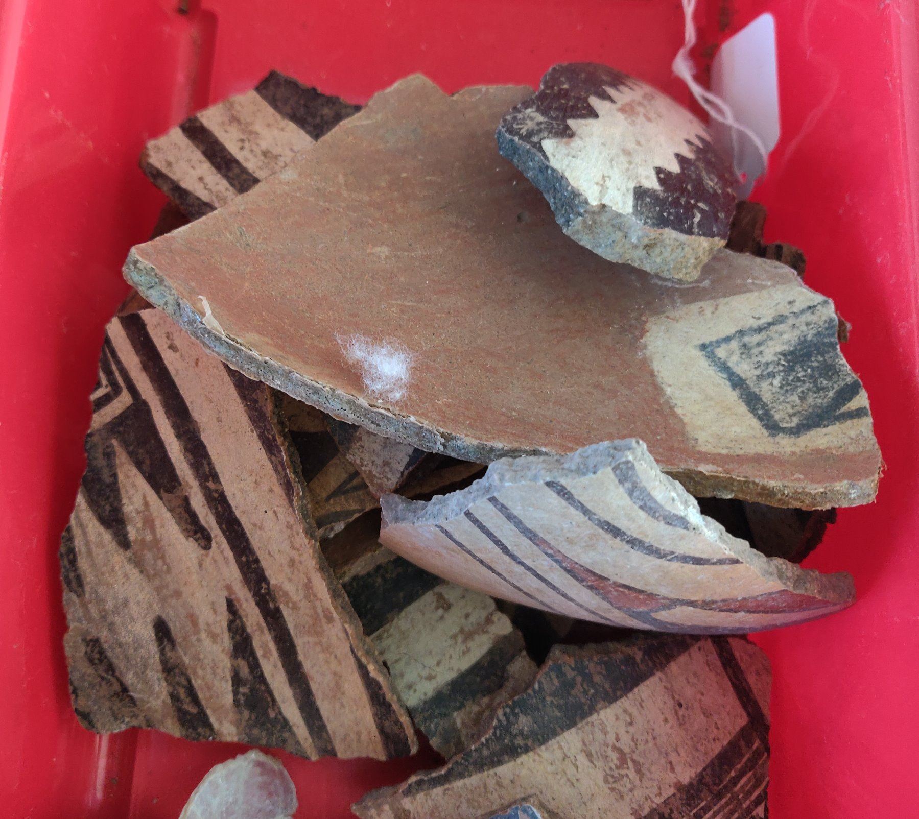 Box of Painted Potsherds, pre-historic items. Made of clay and paint, the largest measures 5" x 5". Southern New Mexico. Box not included. Condition: All broken pieces, see images. Shipping: $28.50 w/insurance and signature, due to value and size.