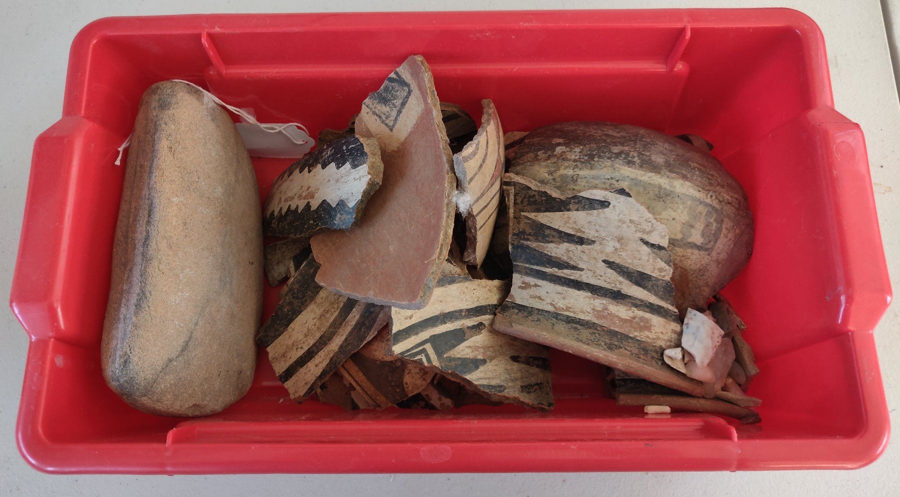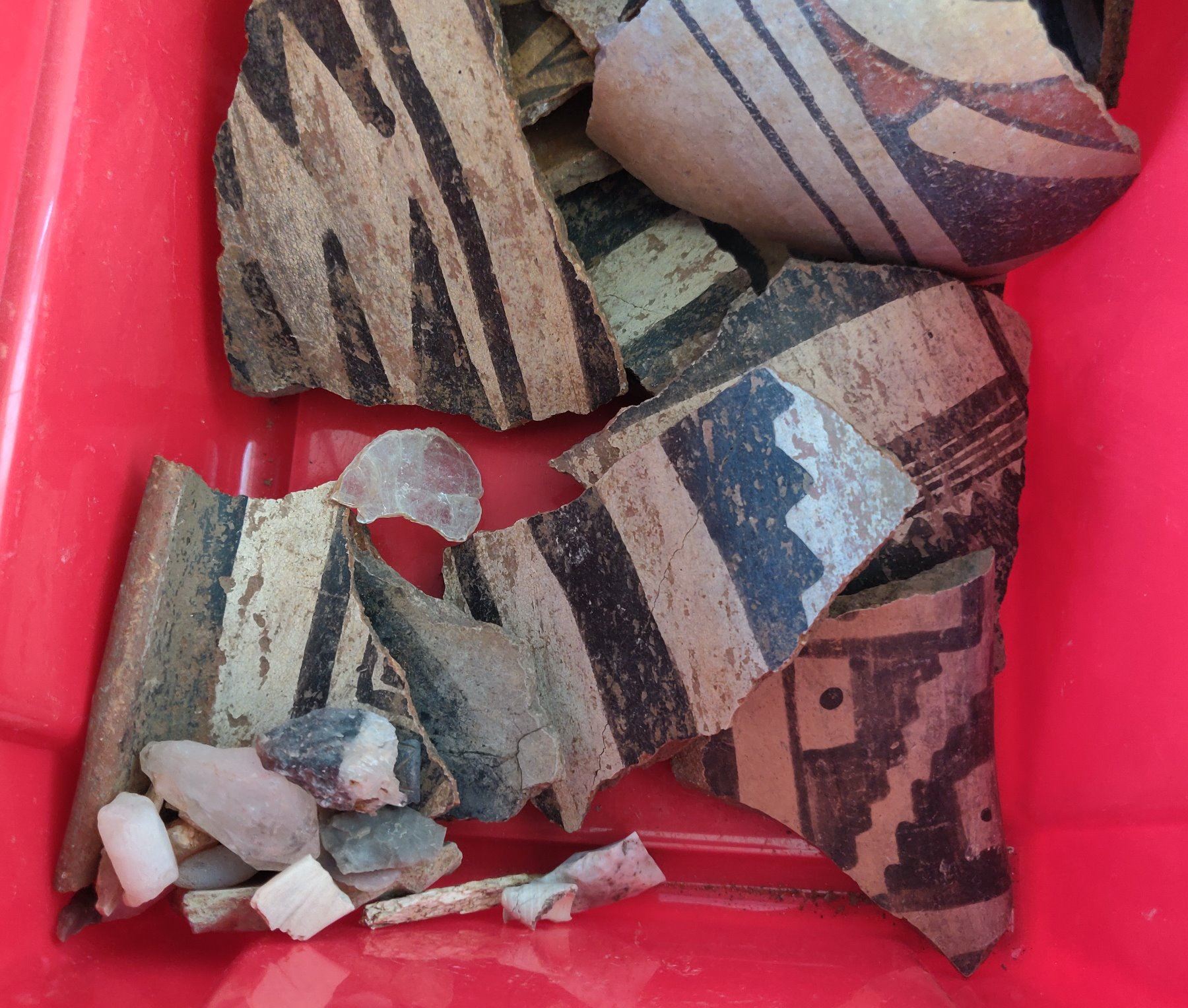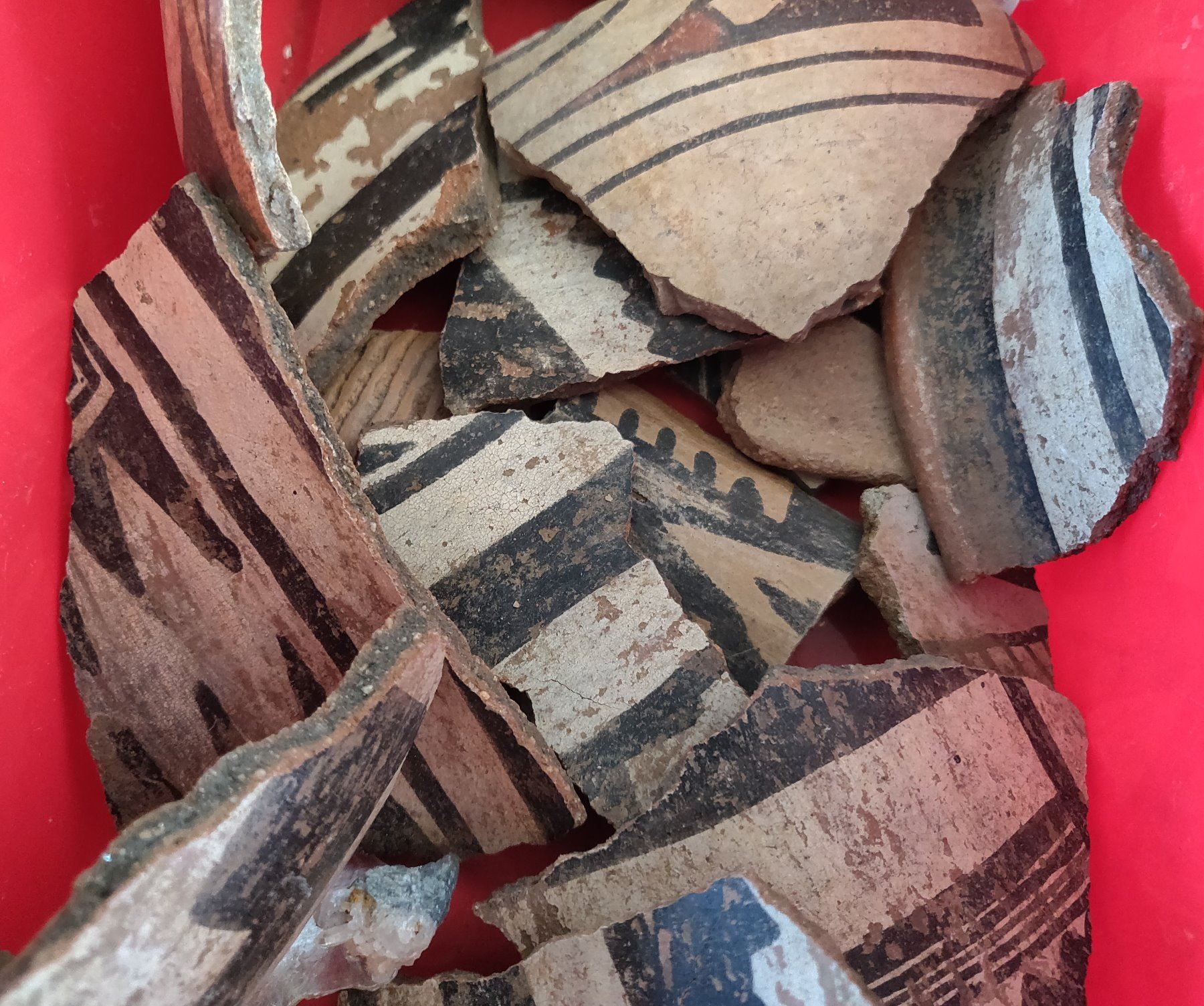 Box of Painted Potsherds, pre-historic items. Made of clay and paint, the largest measures 5" x 5". Southern New Mexico. Box not included. Condition: All broken pieces, see images. Shipping: $28.50 w/insurance and signature, due to value and size.