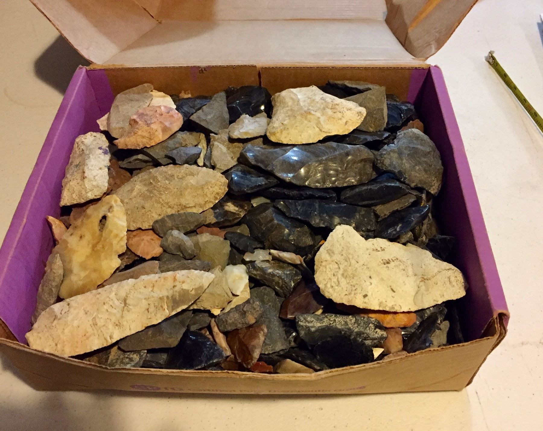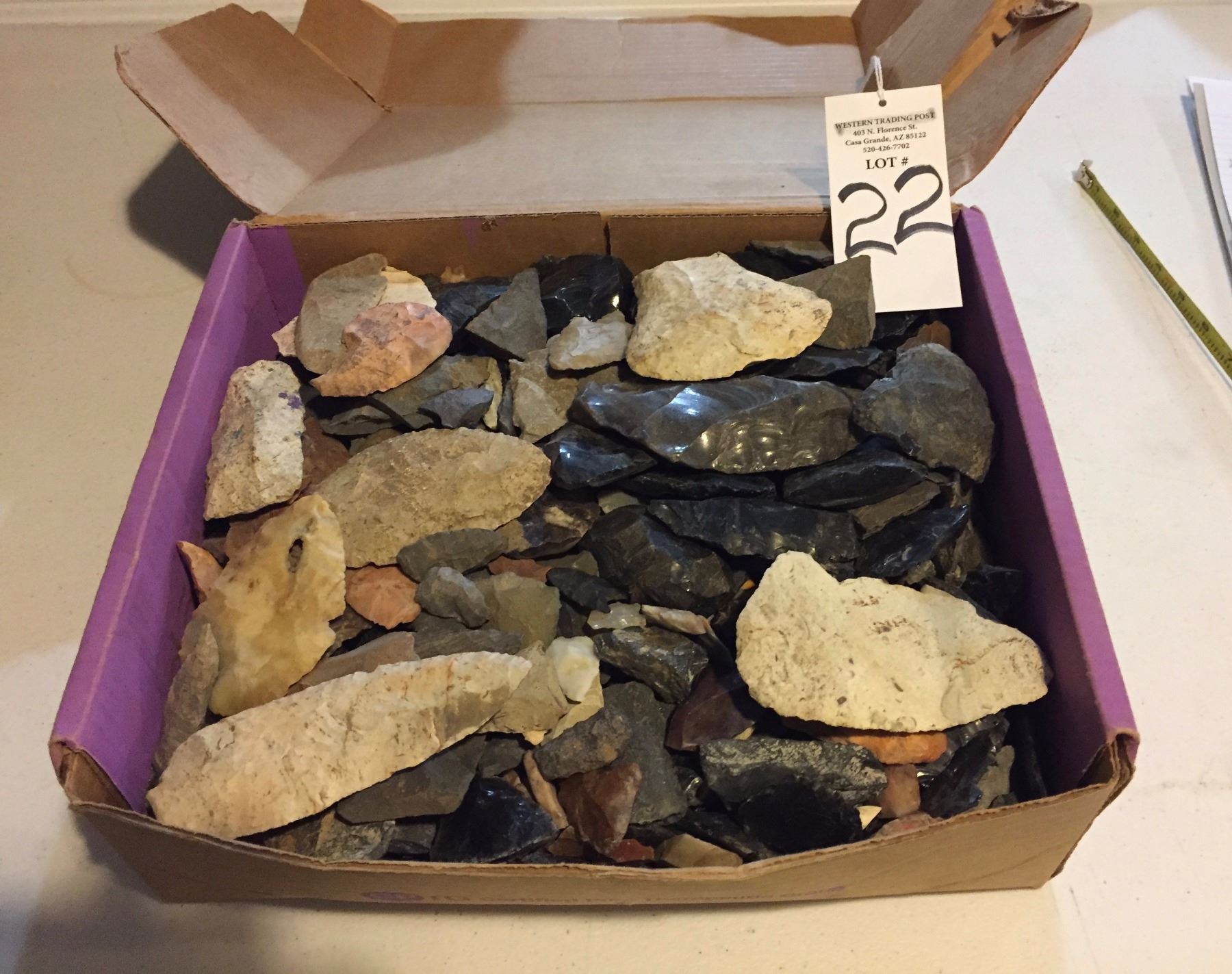 Description: Box full of various prehistoric stone knapping items. Maker: Various, unknown. Approx. Age: Prehistoric. Size: Various sizes, box weighs over 23 lbs. Condition: AS FOUND. Please look closely at the pictures - they are an important part of our description. Shipping: There will be a $5 handling / packaging fee for shipping this lot. The actual cost of postage will be added on top of that.