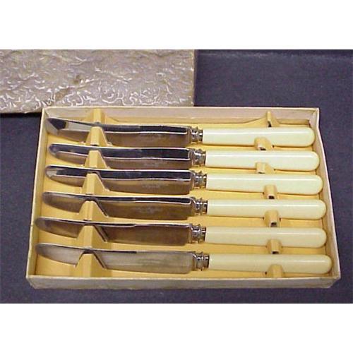 This is very lovely boxed set of 6 luncheon knifes , Made by Sheffield of England in early 1900's, The handles are made what is called "bone" but it is very early hard plastic that resembles bone .- The set comes in original cardboard box that shows age, but still very much usable. - Excellent used but not abused condition, US Buyer please pay 8.00 for shipping lus insurance.Thanks