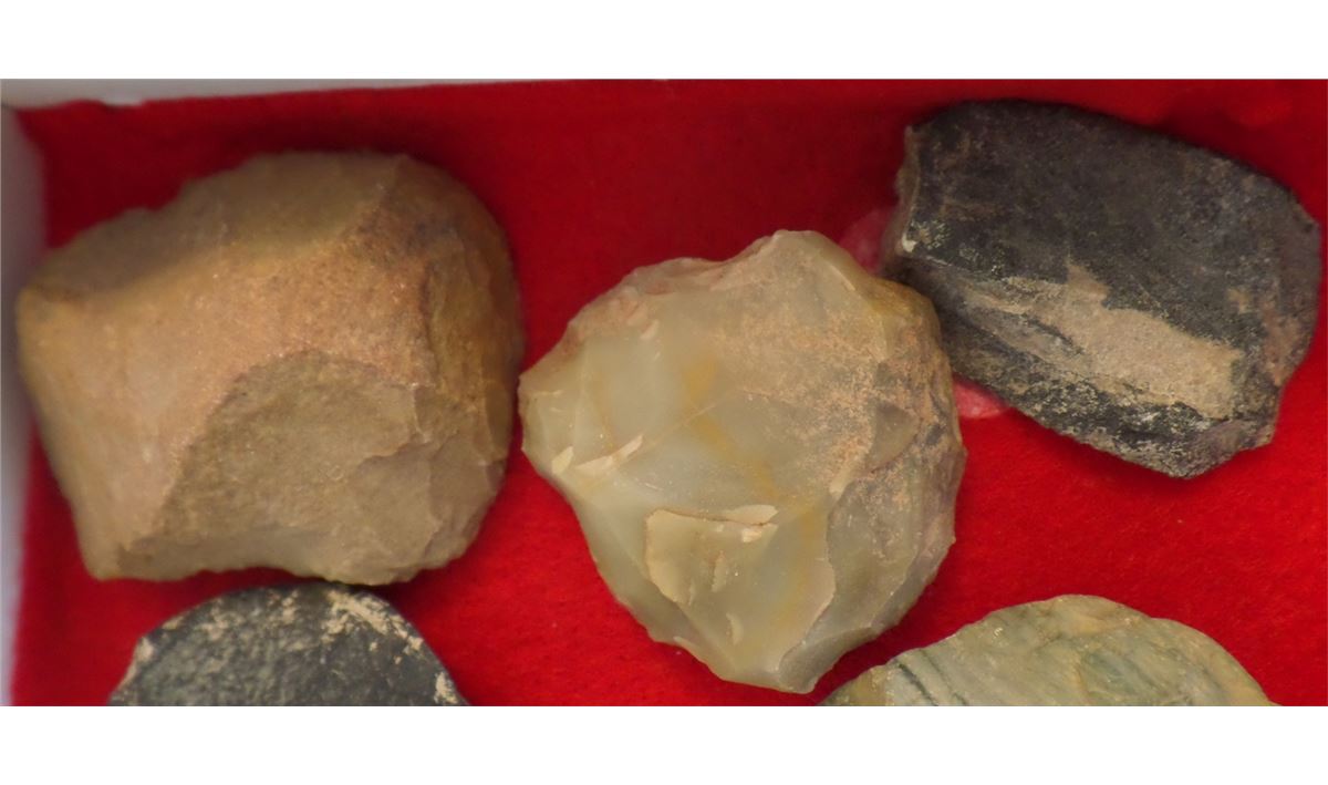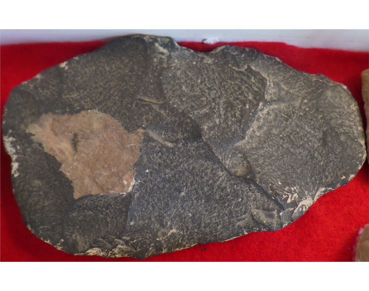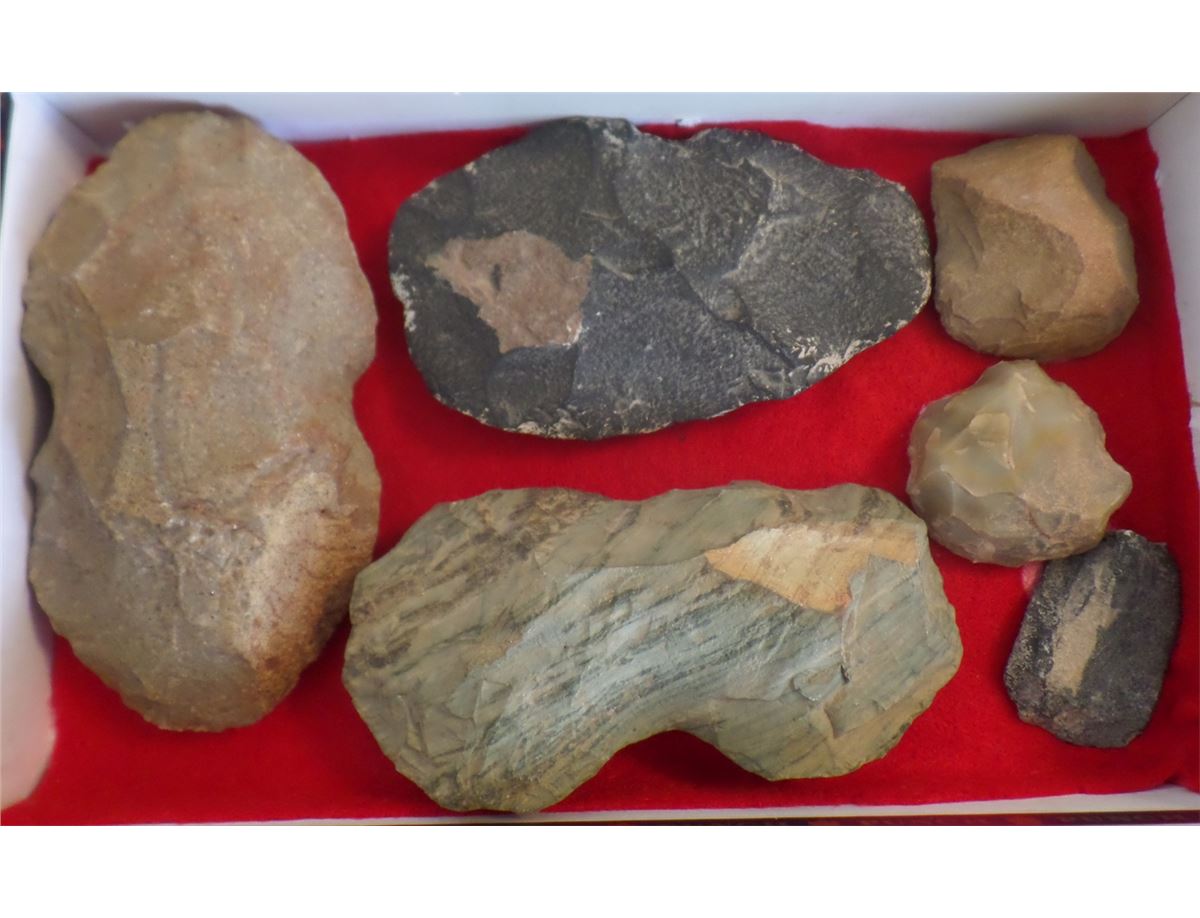 Box of six flint artifacts. These Anasazi items measure 2 to 5 inches are in good condition. There are Celts, knife and scrapers. Shipping: $20