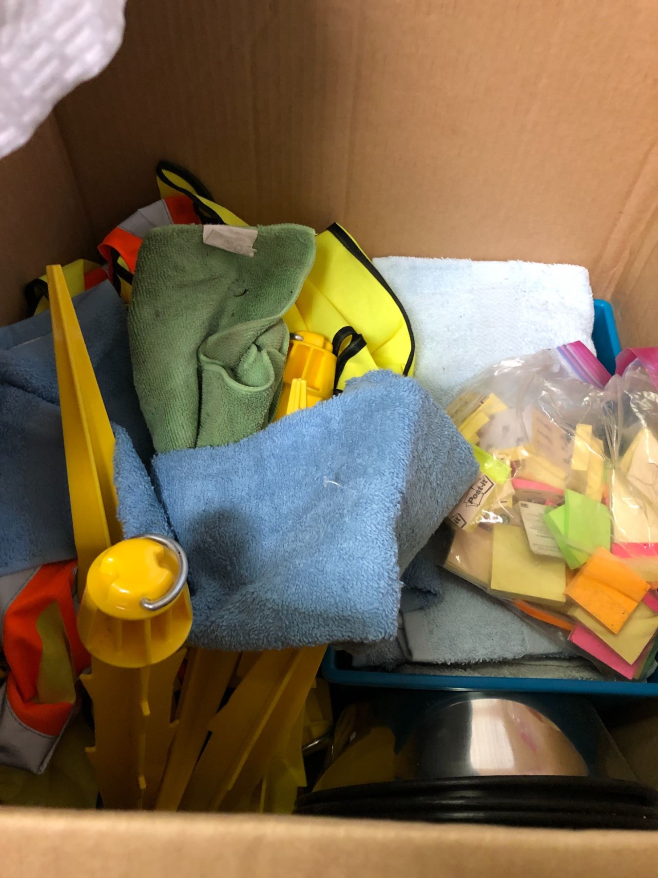Box of Stainless Dog Bowls, Safety Vests, K9 Training Tools, Yard Stakes, Rope and towels plus bag of Post-it Notes