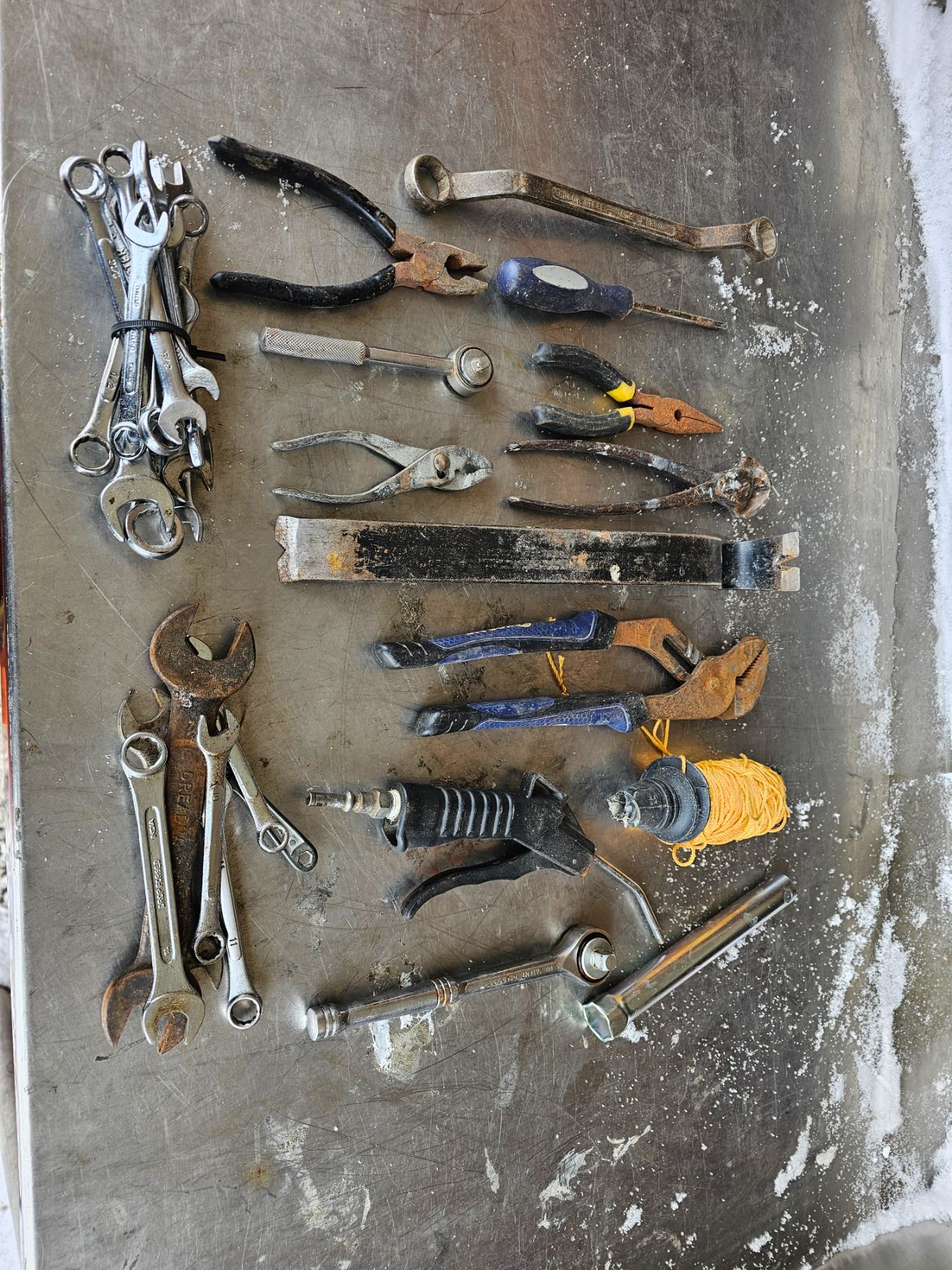 misc. sized wrenches, misc. pliers, prybar, couple rachets, roll of string, screwdriver, air blow nozzle.