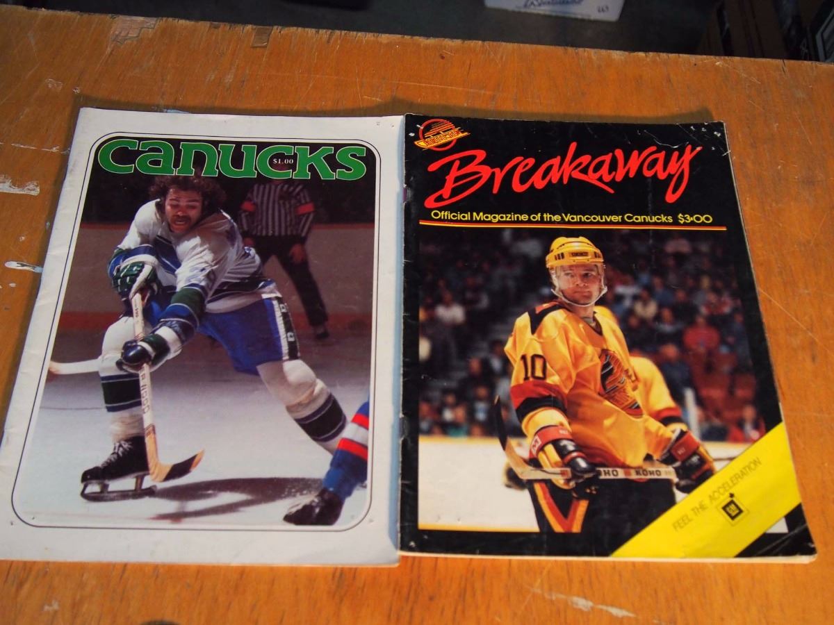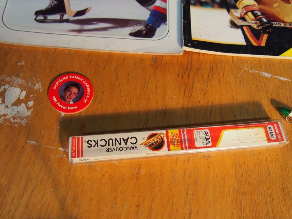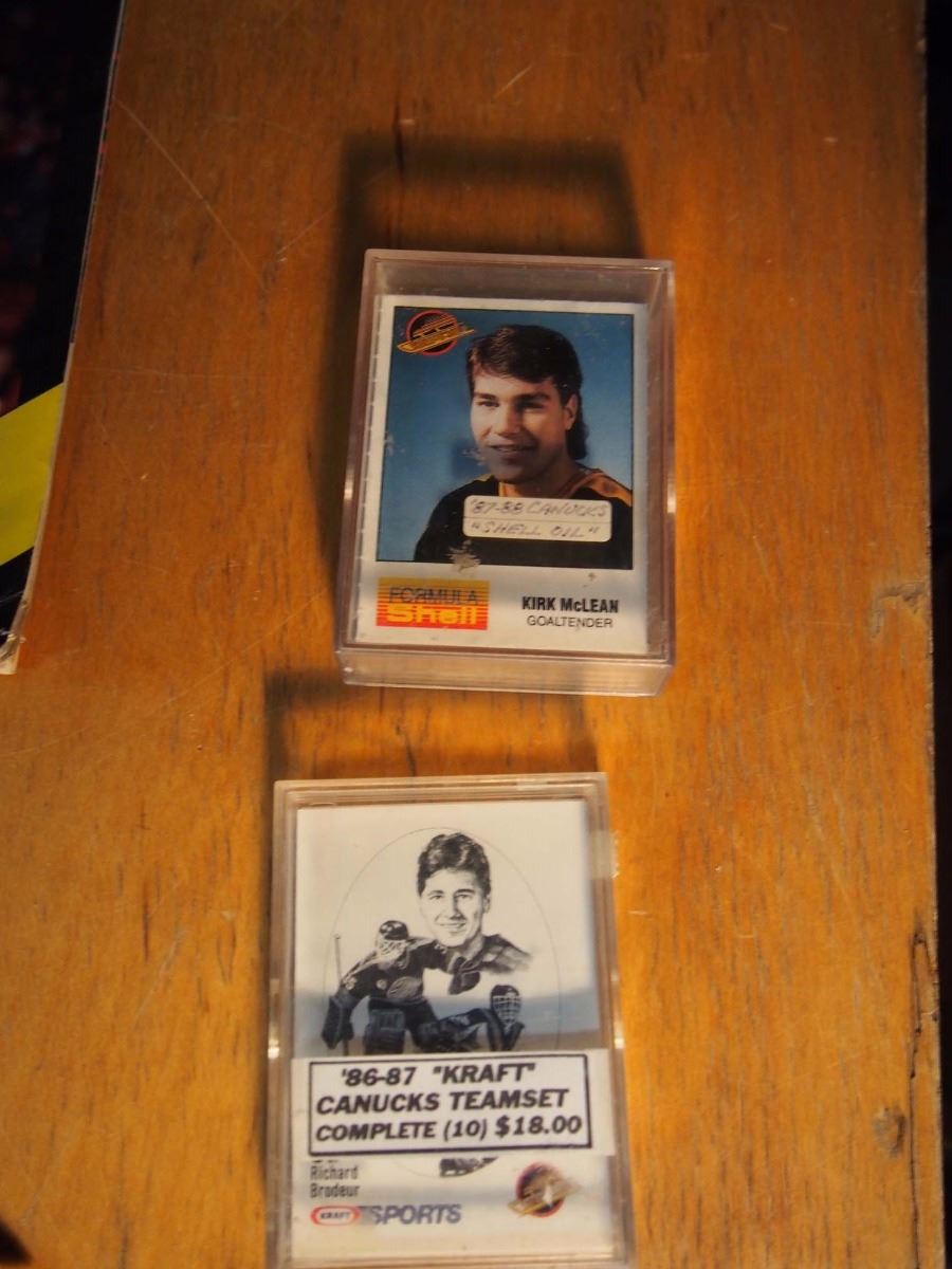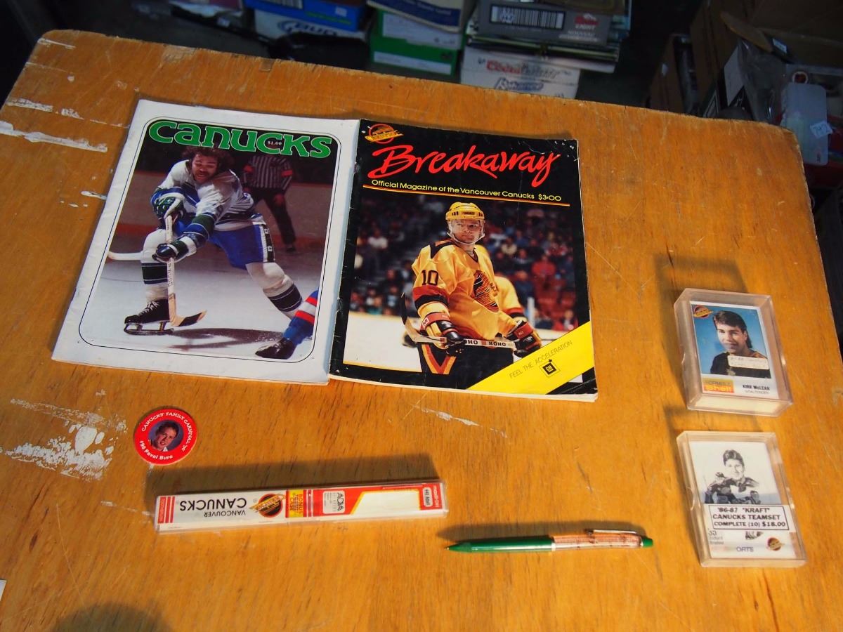 Box of Vancouver Canucks Memorabilia, Motion Pen, 1986-87 Kraft Cards Team Set, 1987-88 Cunucks She