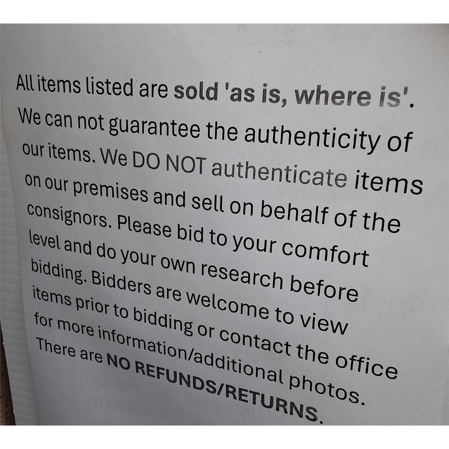 All advertising is a GUIDE ONLY. Buyers must satisfy themselves to the condition, identity and authenticity prior to bidding on an item and shall not make objections after the sale.