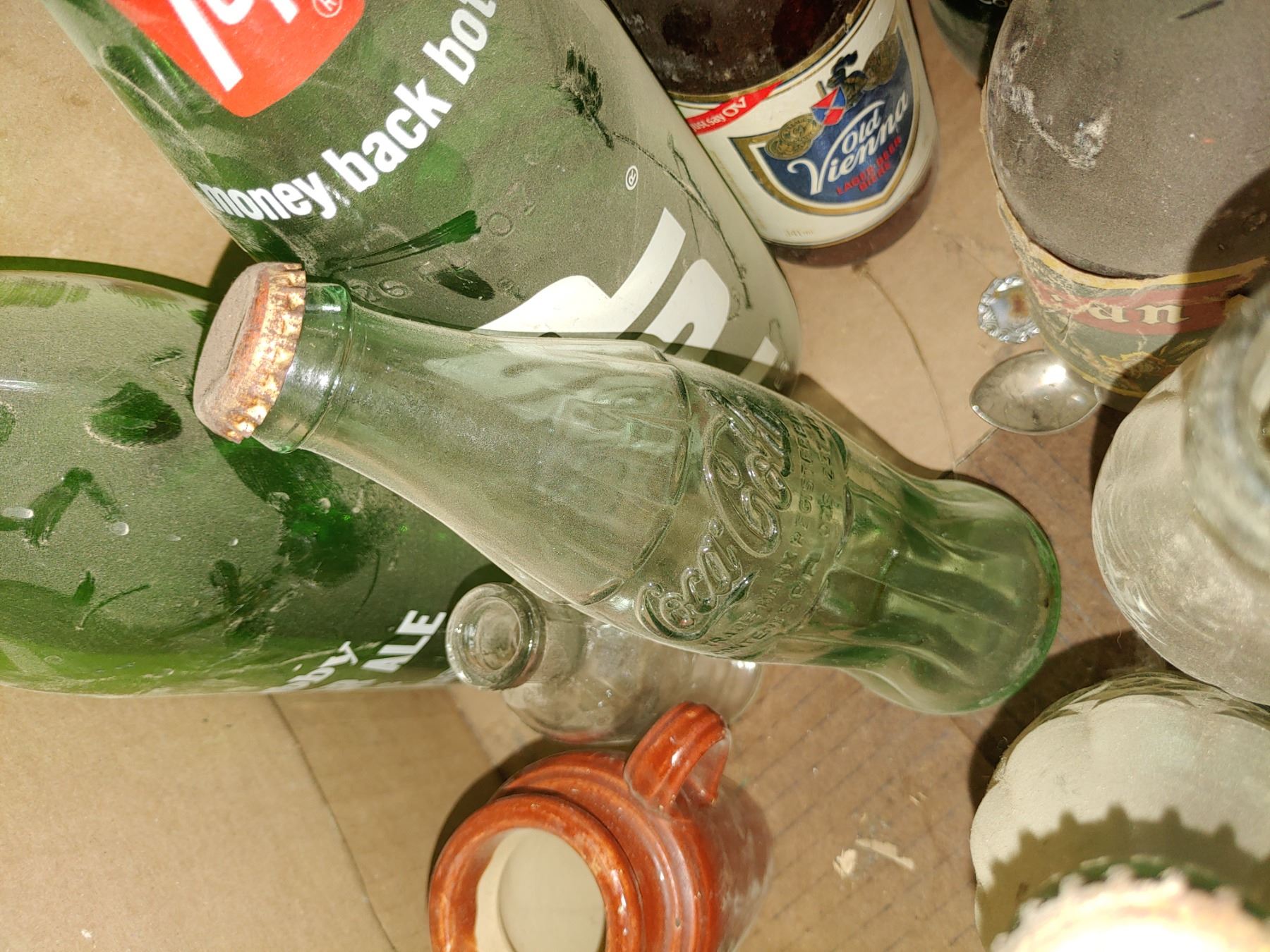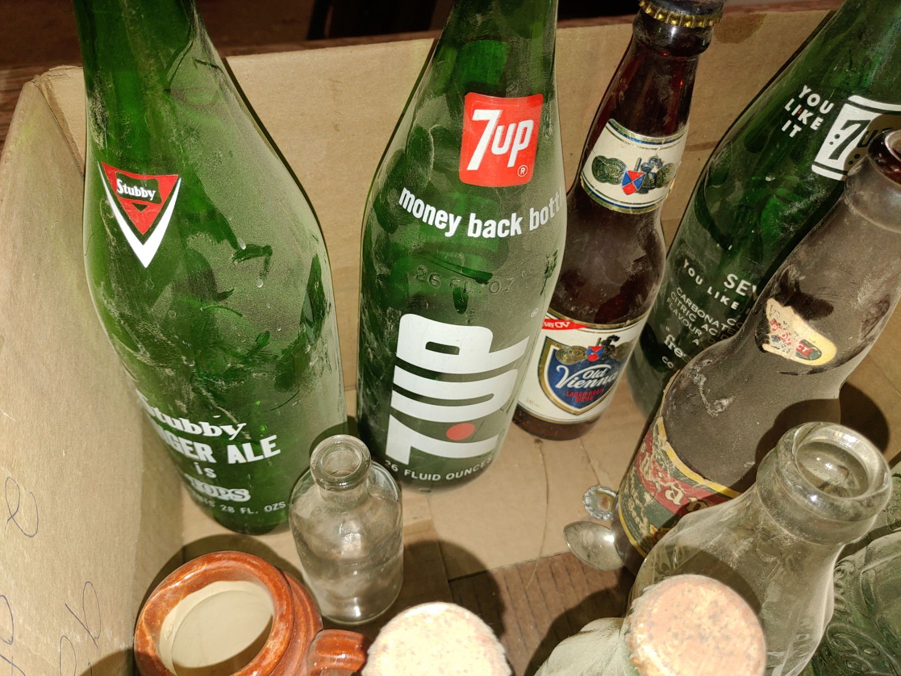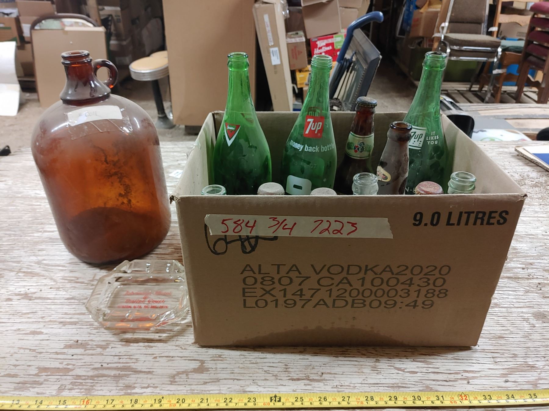 Box of Vintage Bottles and 1 Gallon Glass Jug