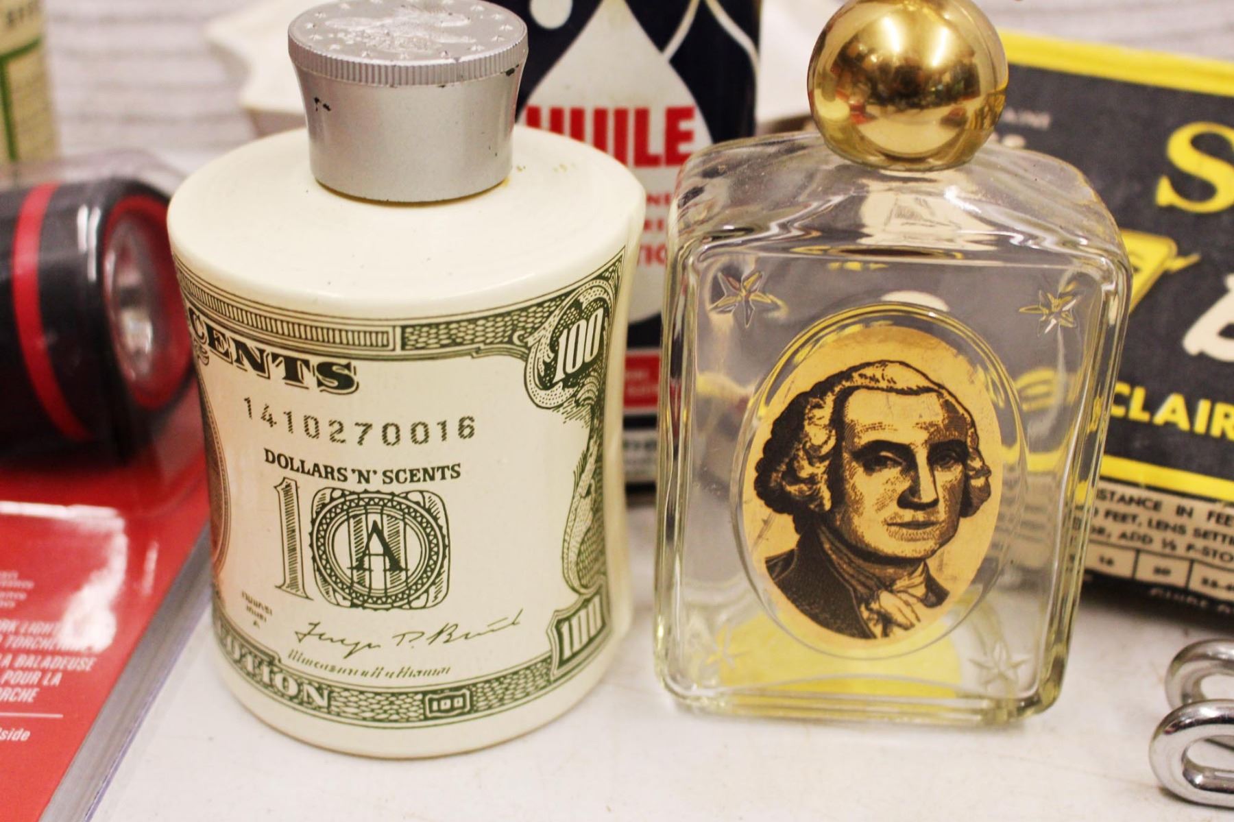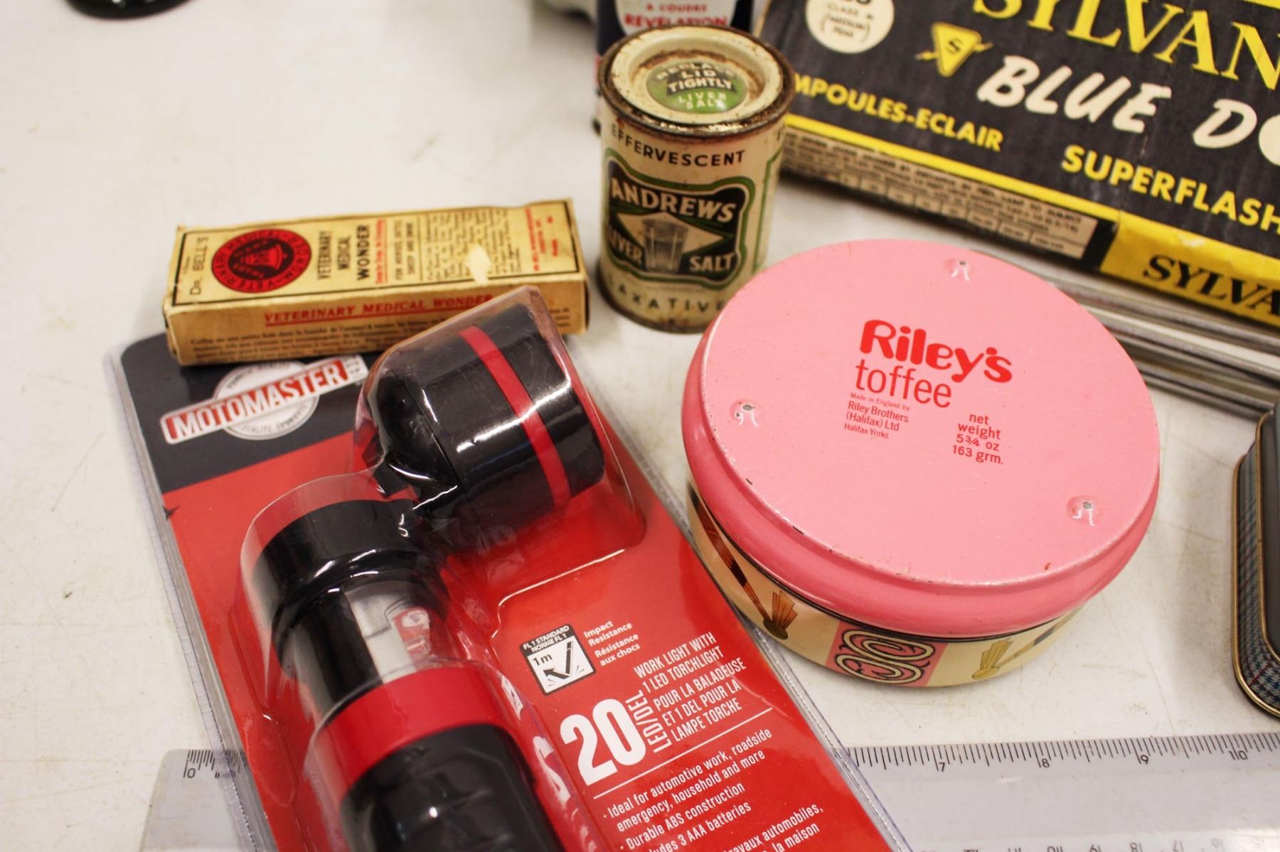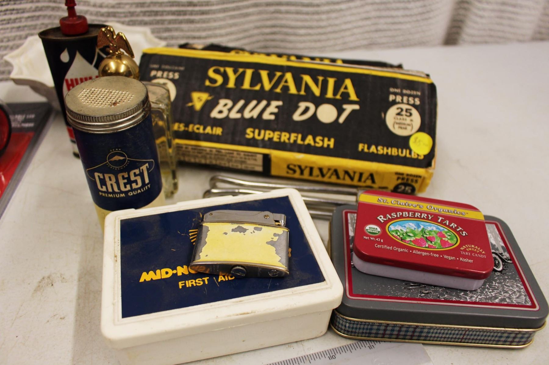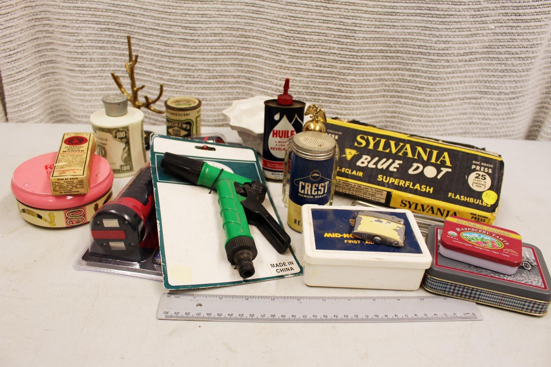 Box of Vintage Misc (Flash Bulbs, Garden Nozzle, Tins, Aftershave, Work Light)