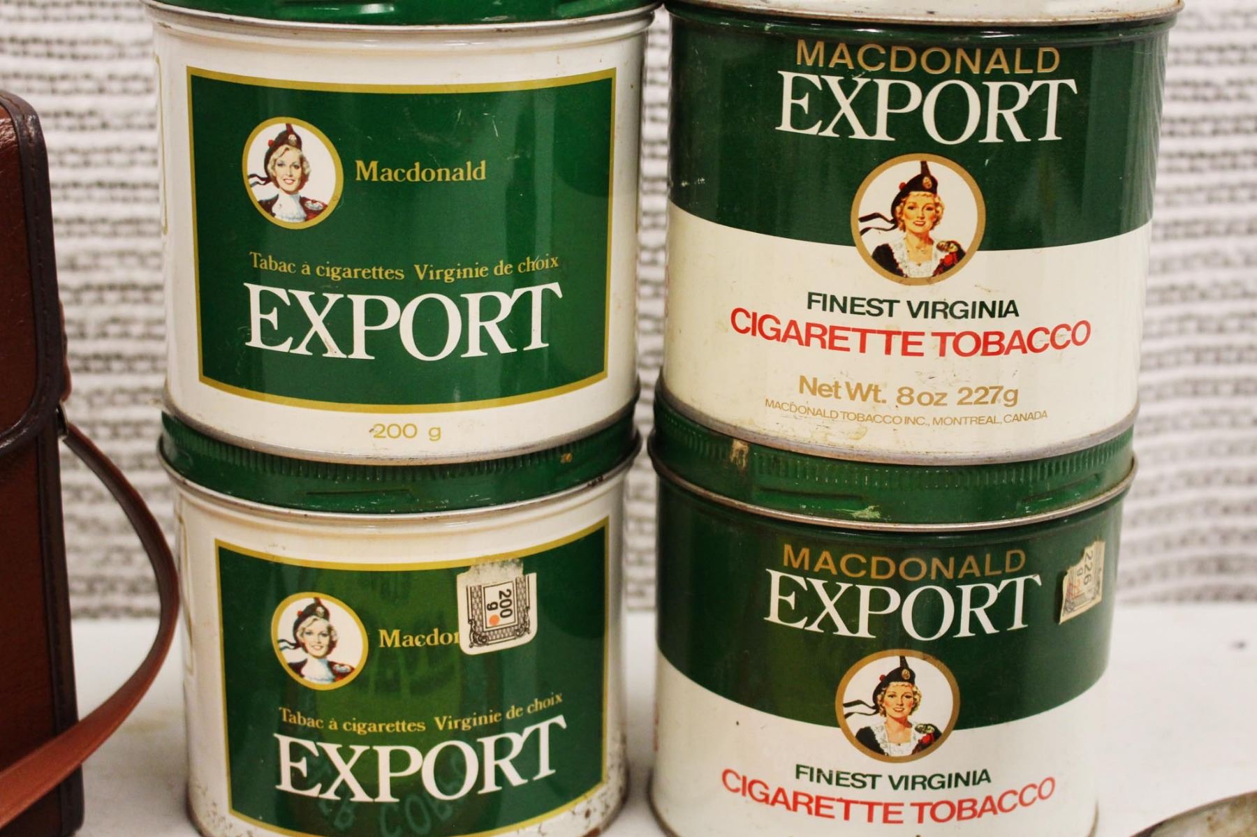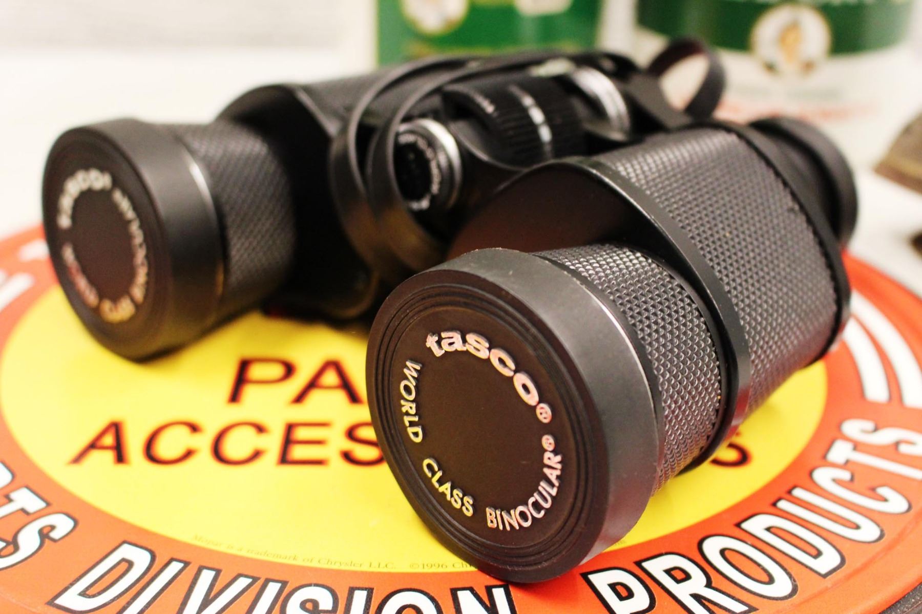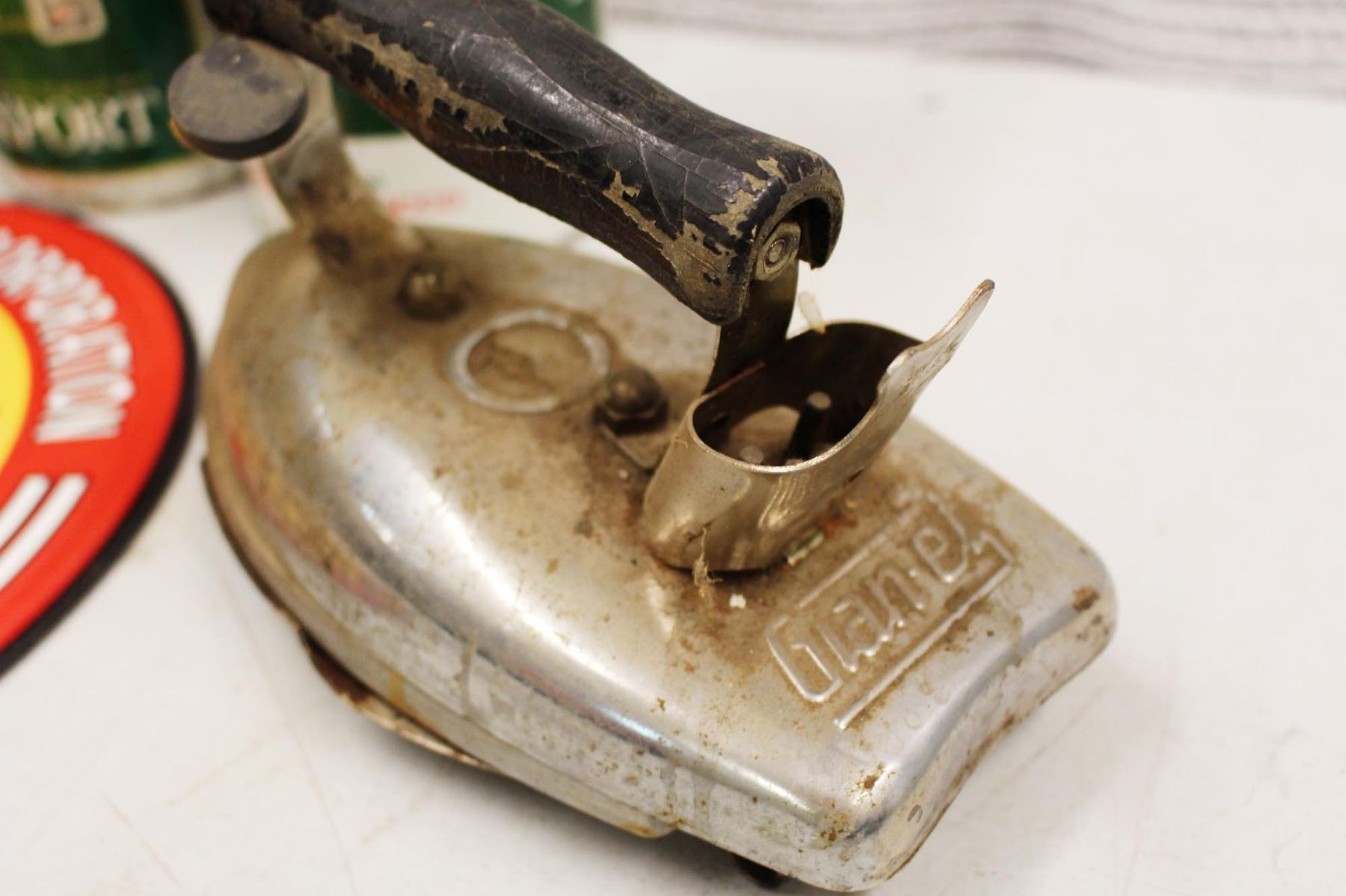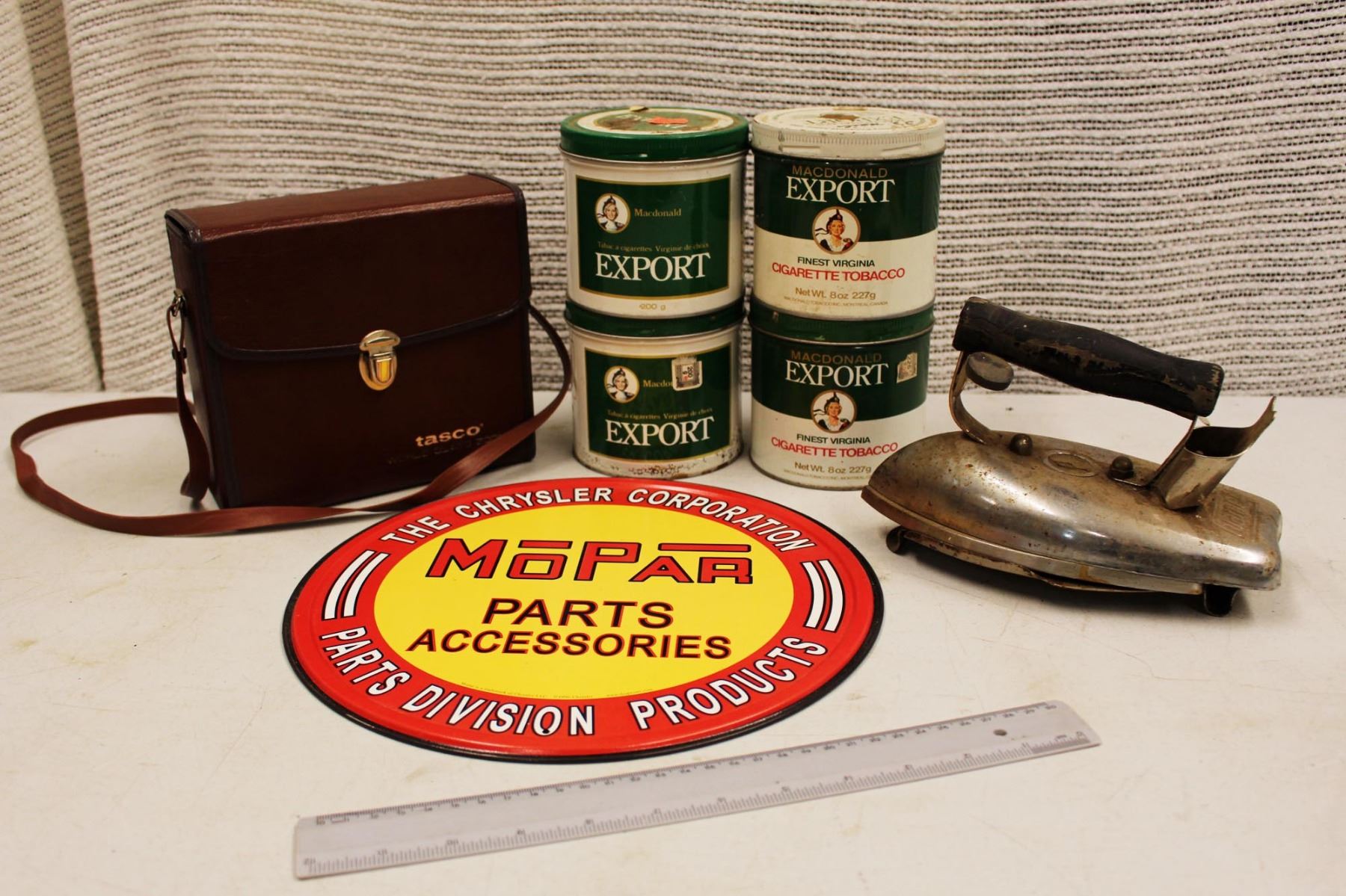Box of Vintage Misc (Tobacco Tins, Binoculars, Sad Iron, Chrysler Sign)