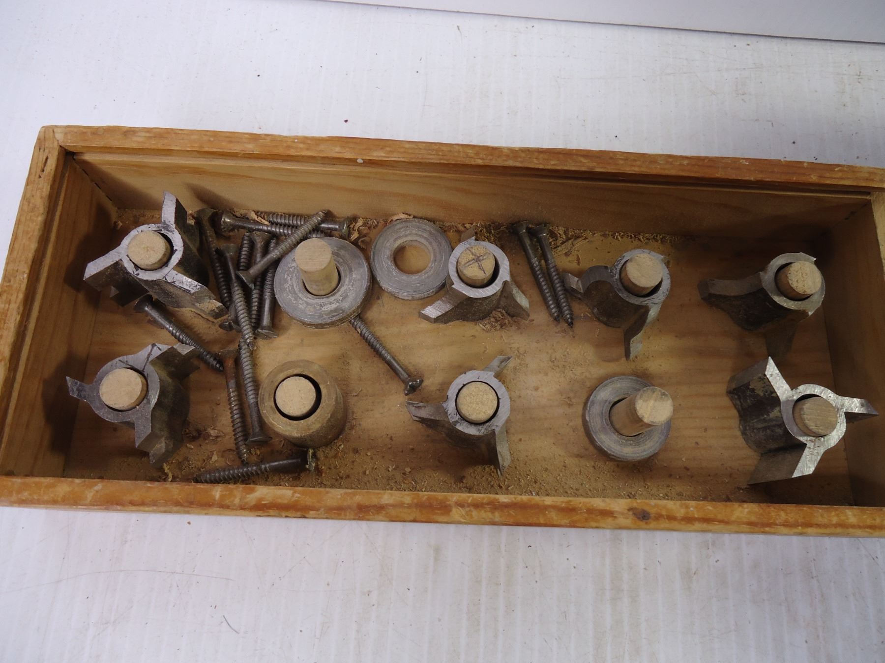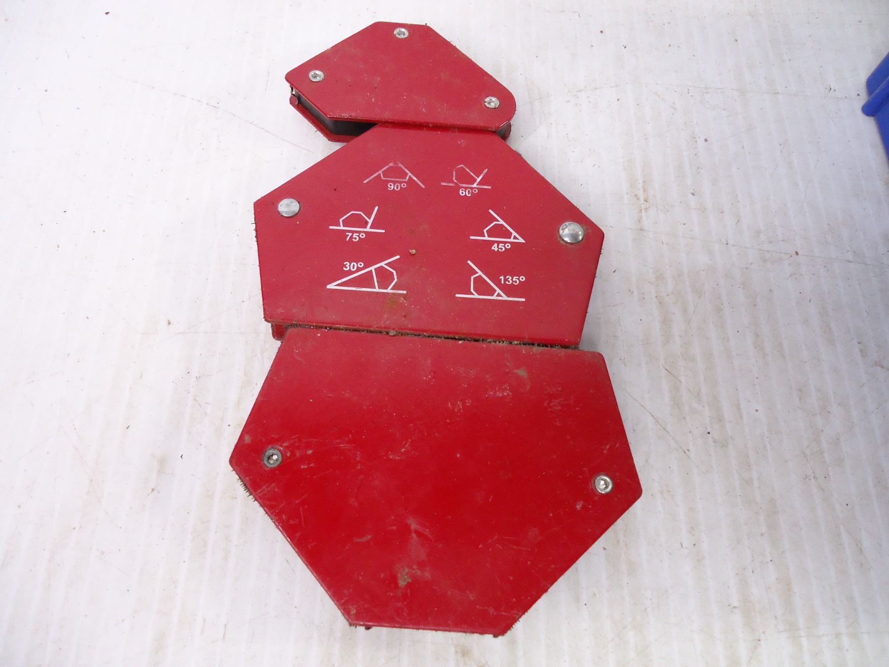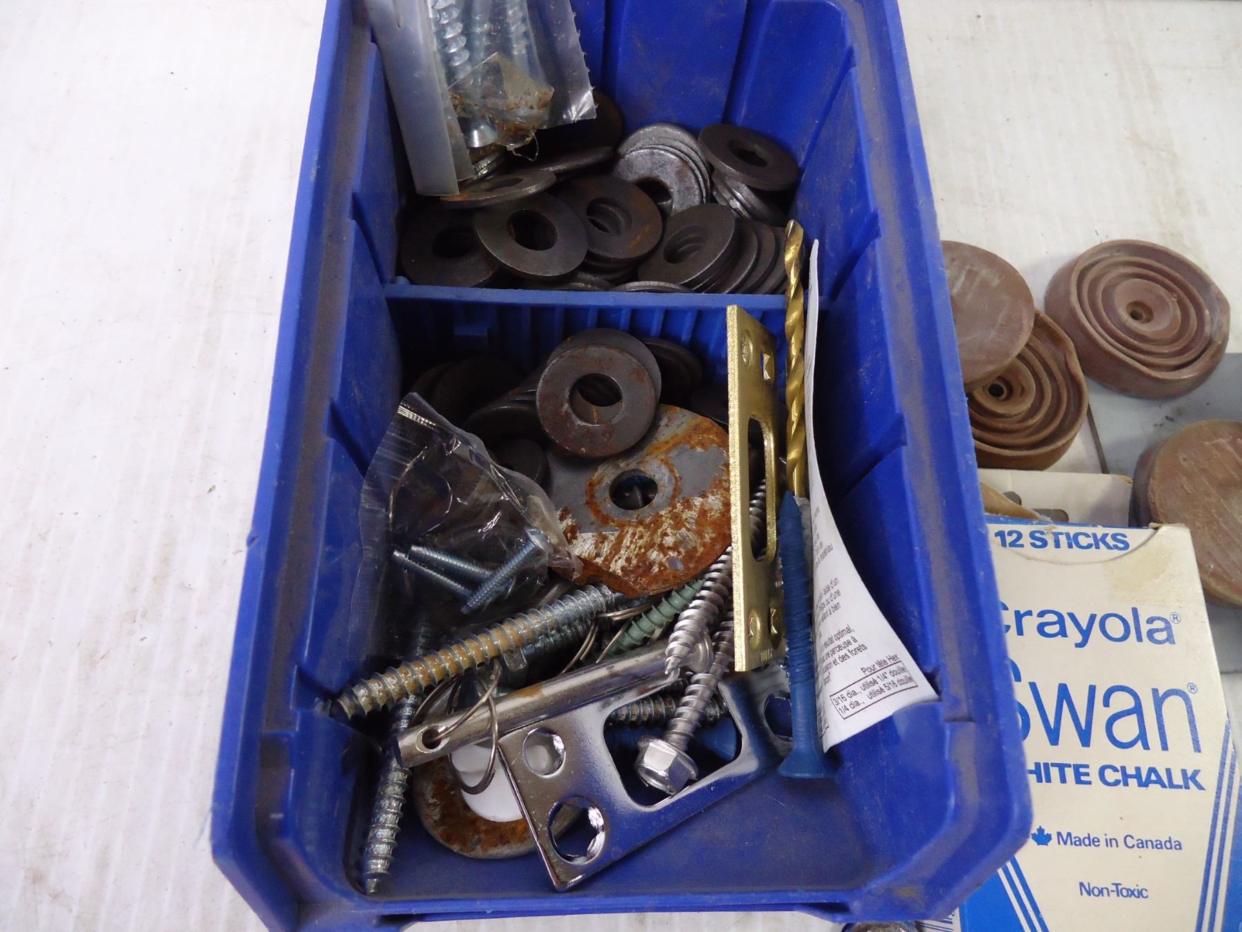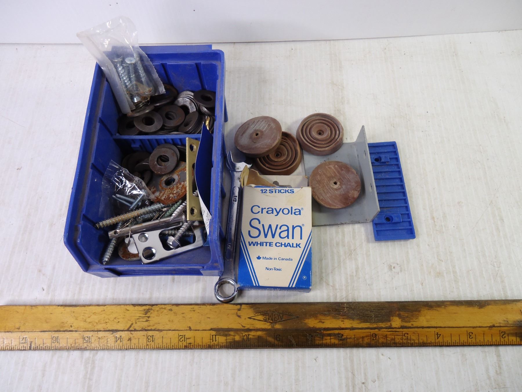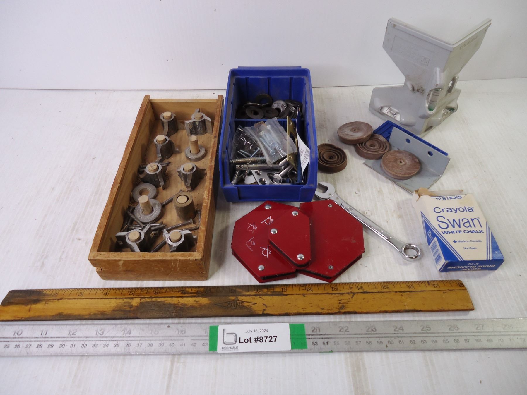 Box of Wood Plug Cutter Drill Bits,(3) Welding Magnets, Level, Chalk and Container of Hardware