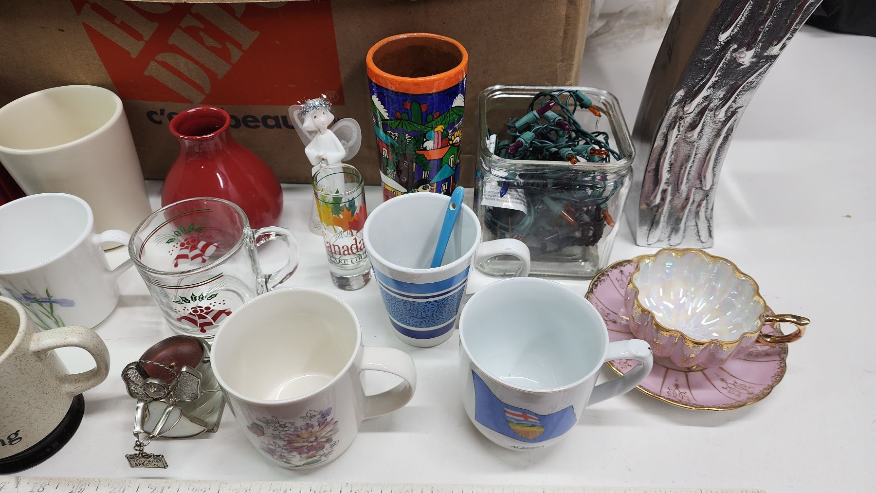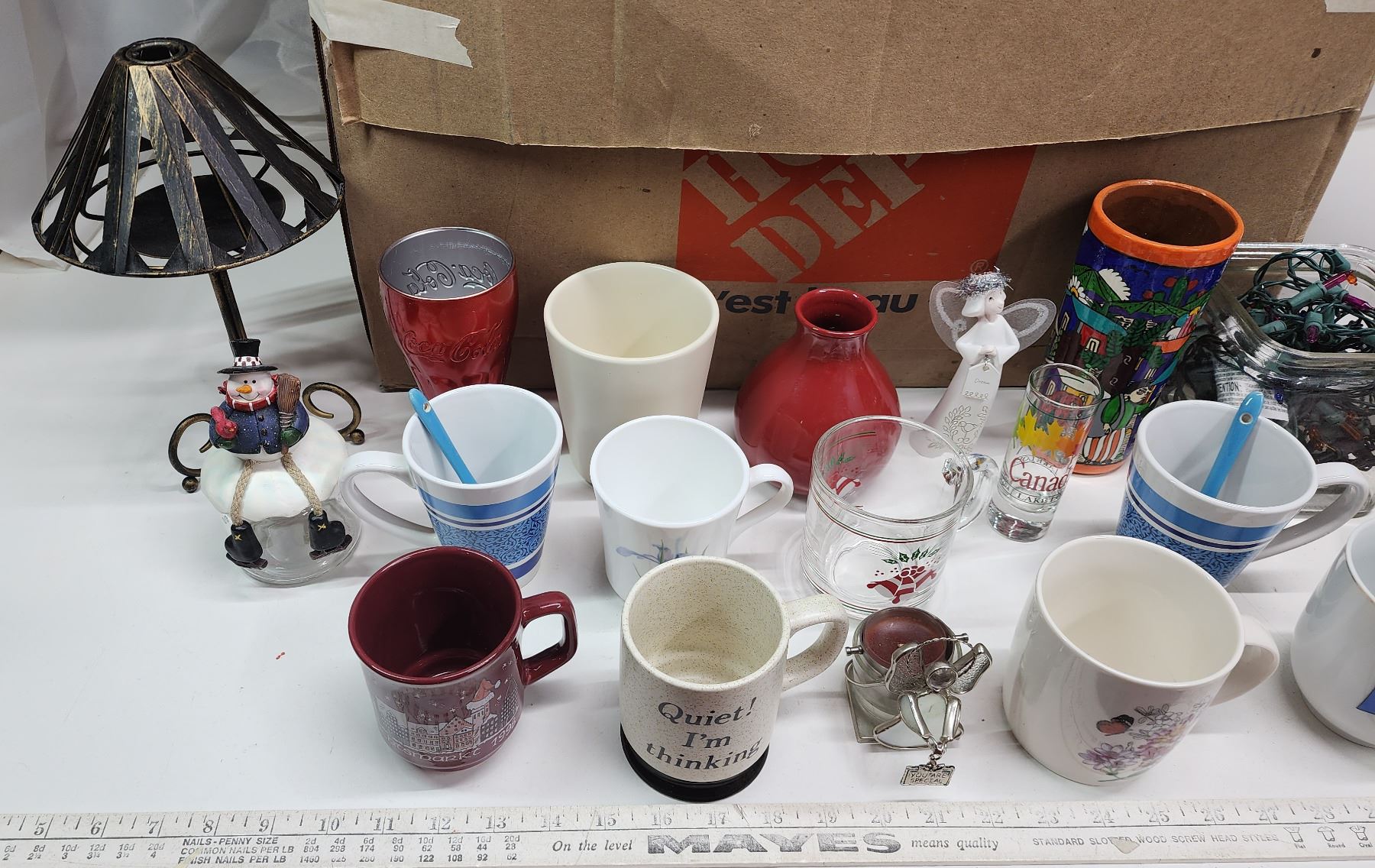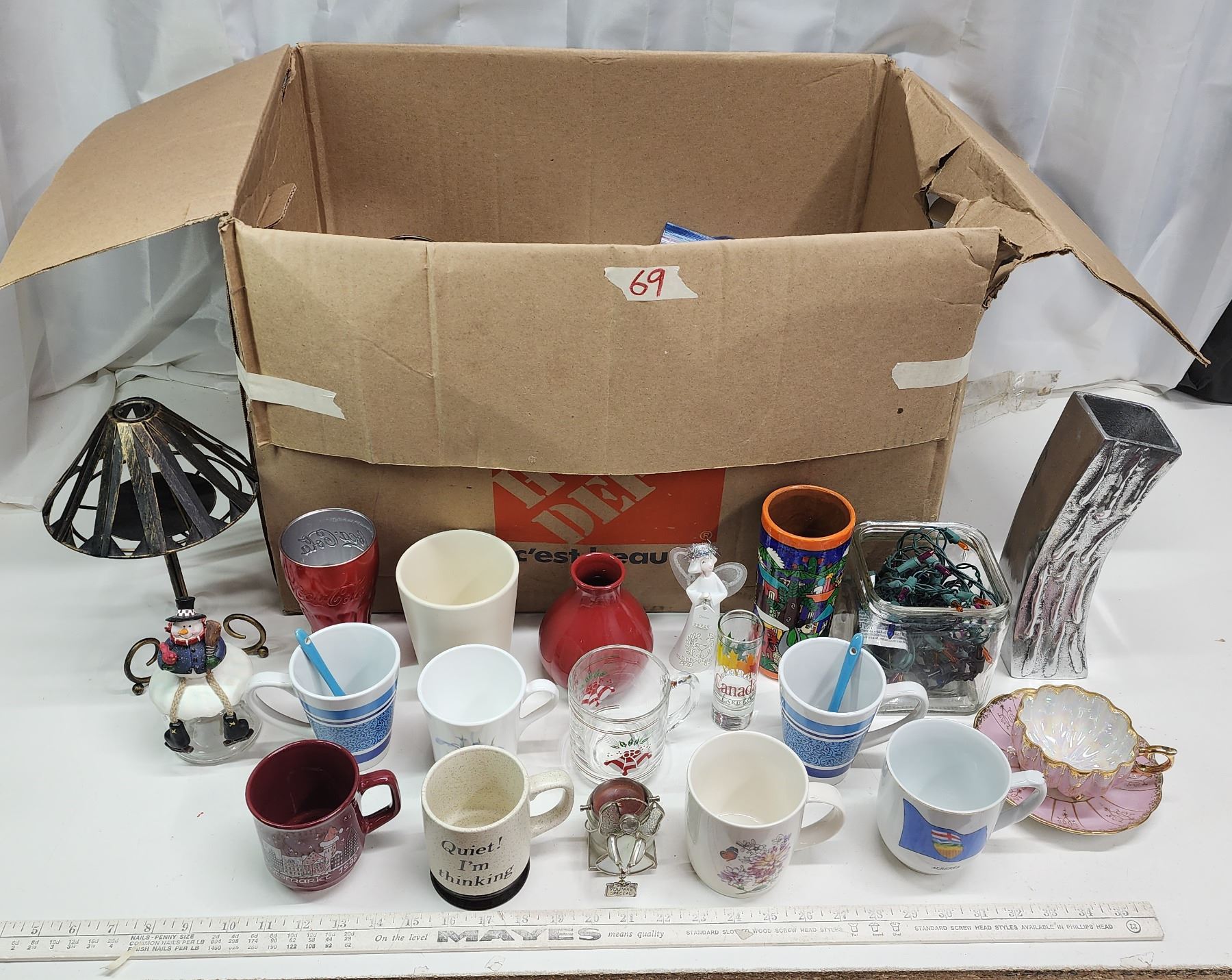 Box of assorted items - Coffee cups, candle holders, ornaments, vases, knick knacks, etc.