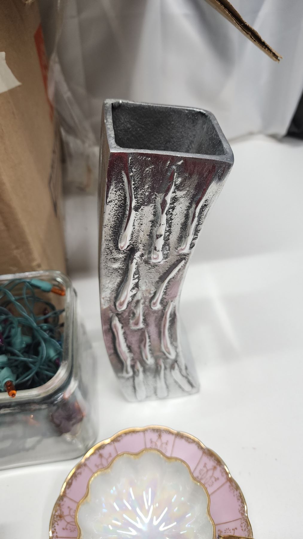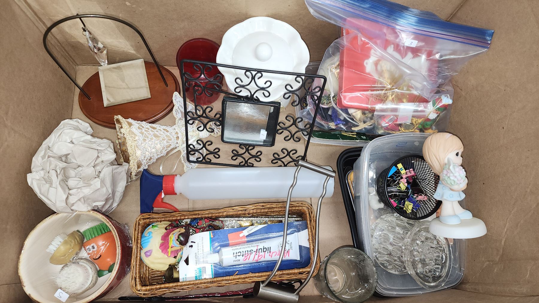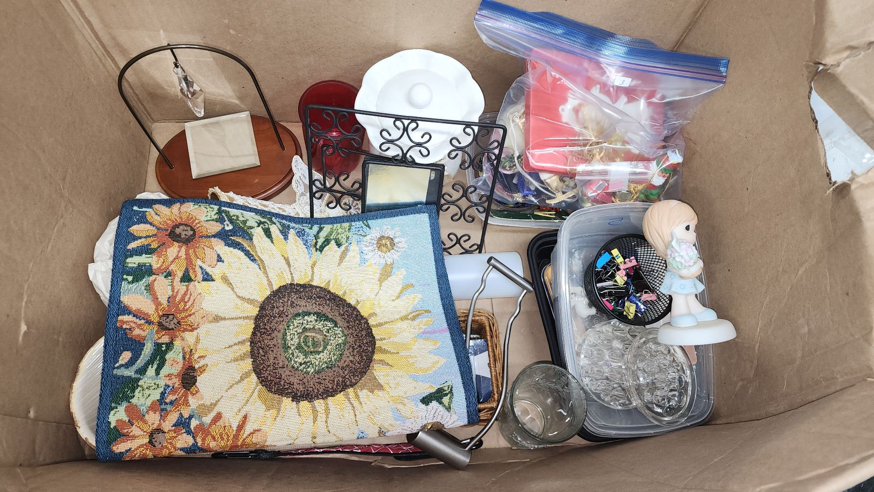 Box of assorted items - Coffee cups, candle holders, ornaments, vases, knick knacks, etc.