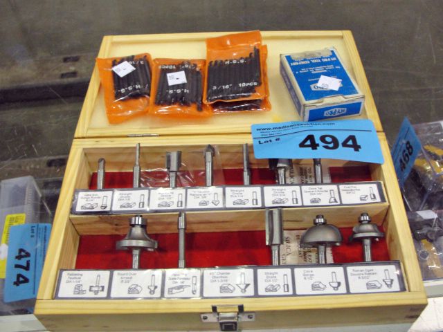 Box of assorted router bits, drill bits, etc