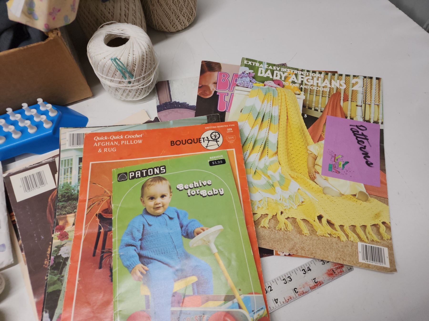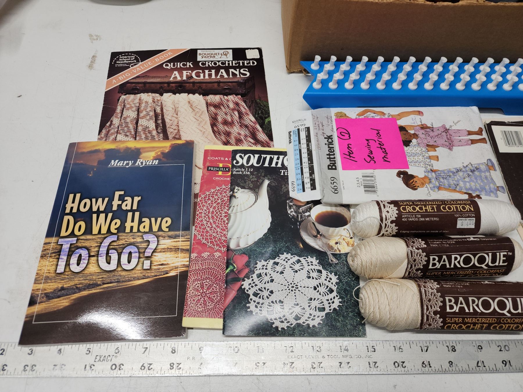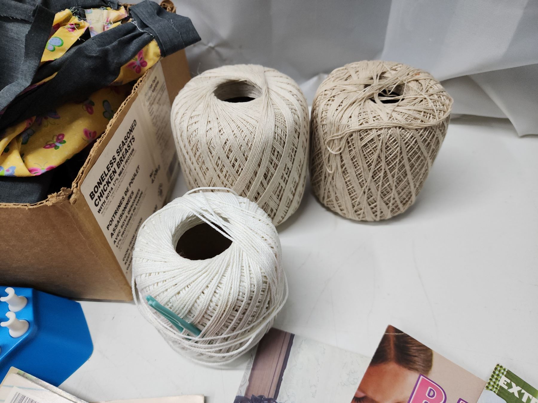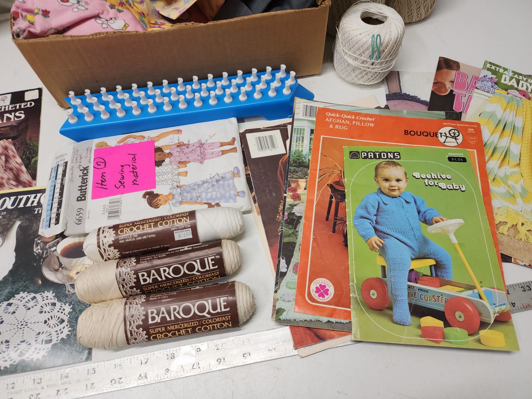 Box of assorted sewing items - Crotchet cotton, string, patterns, etc.