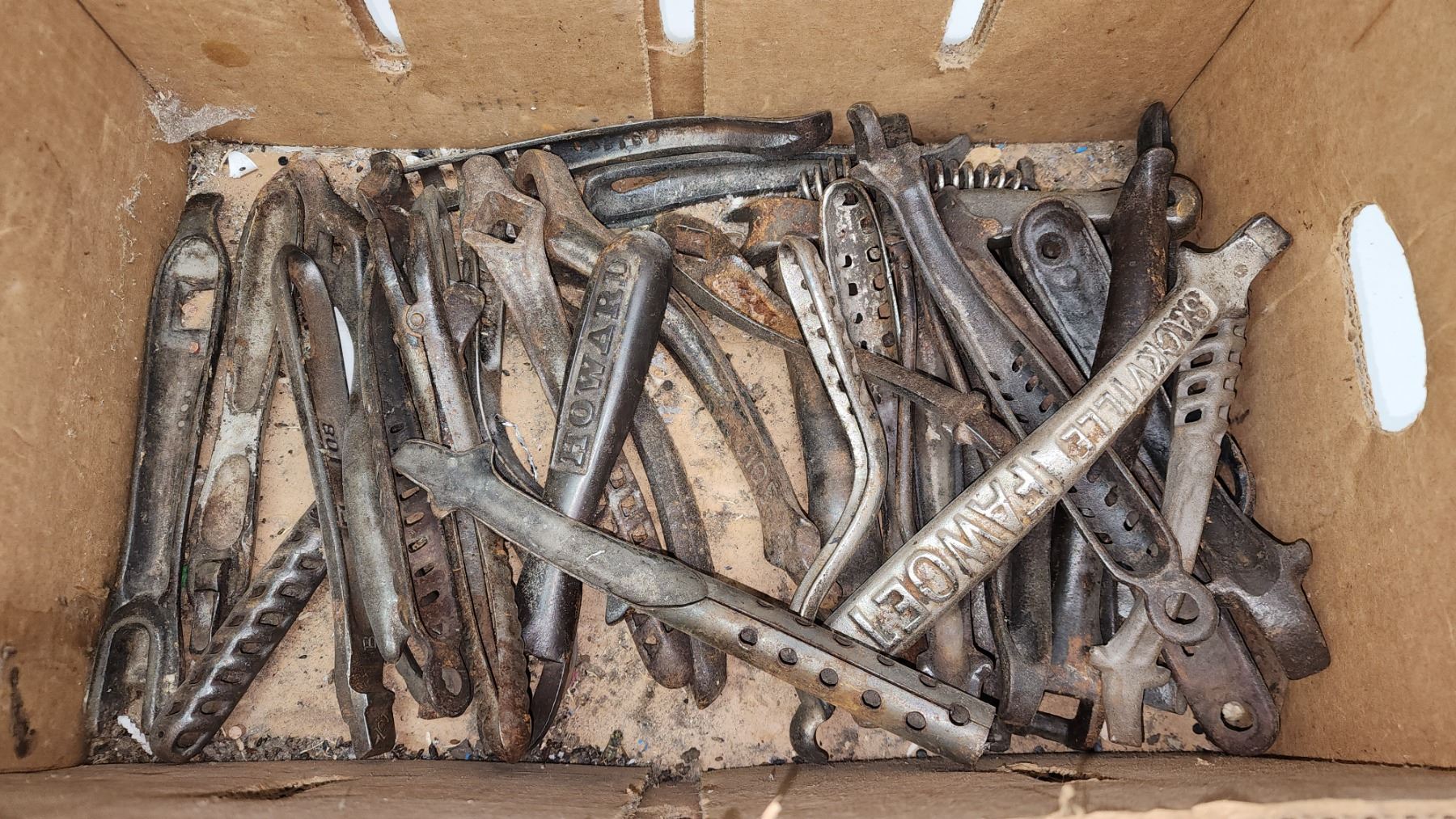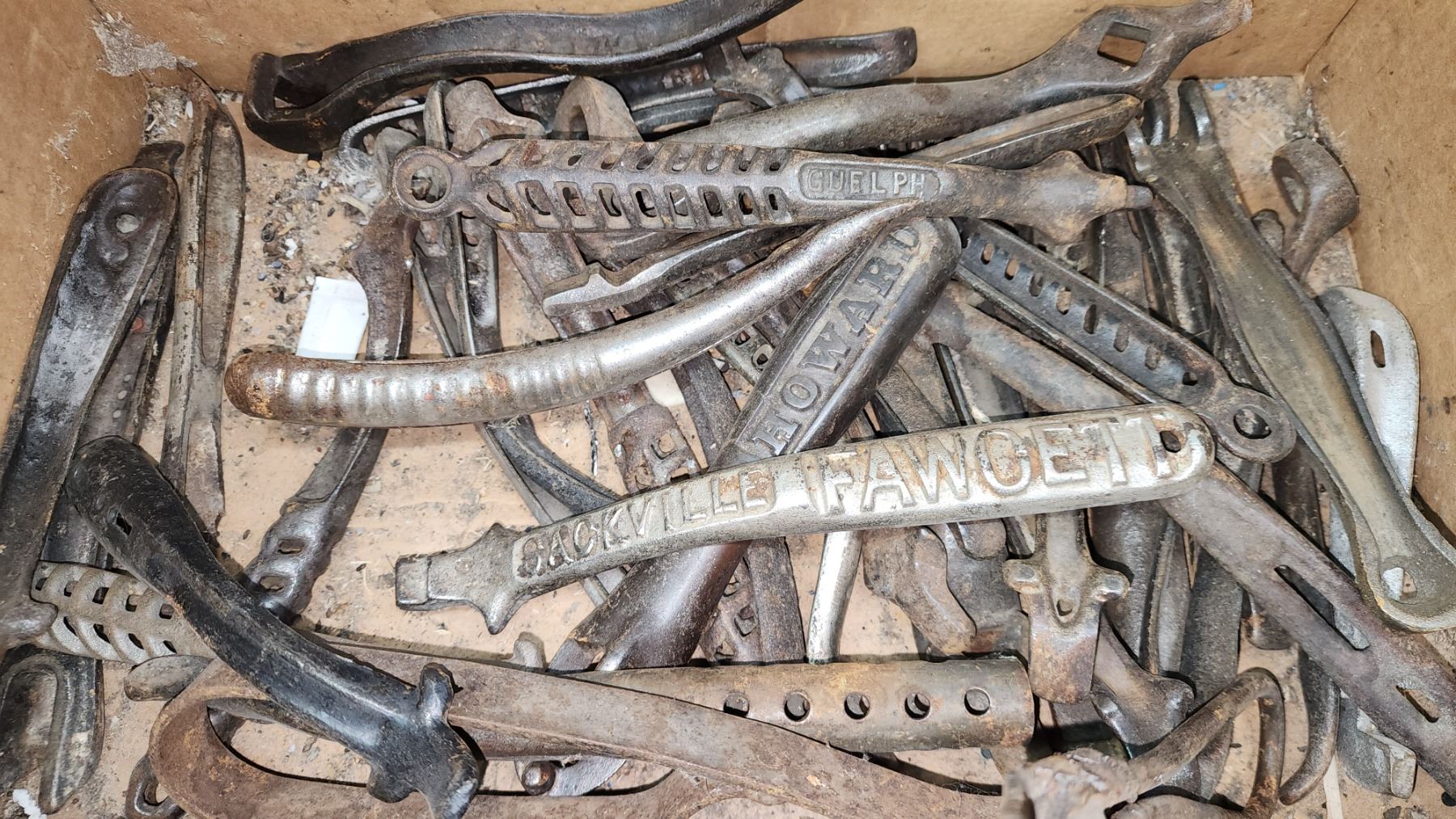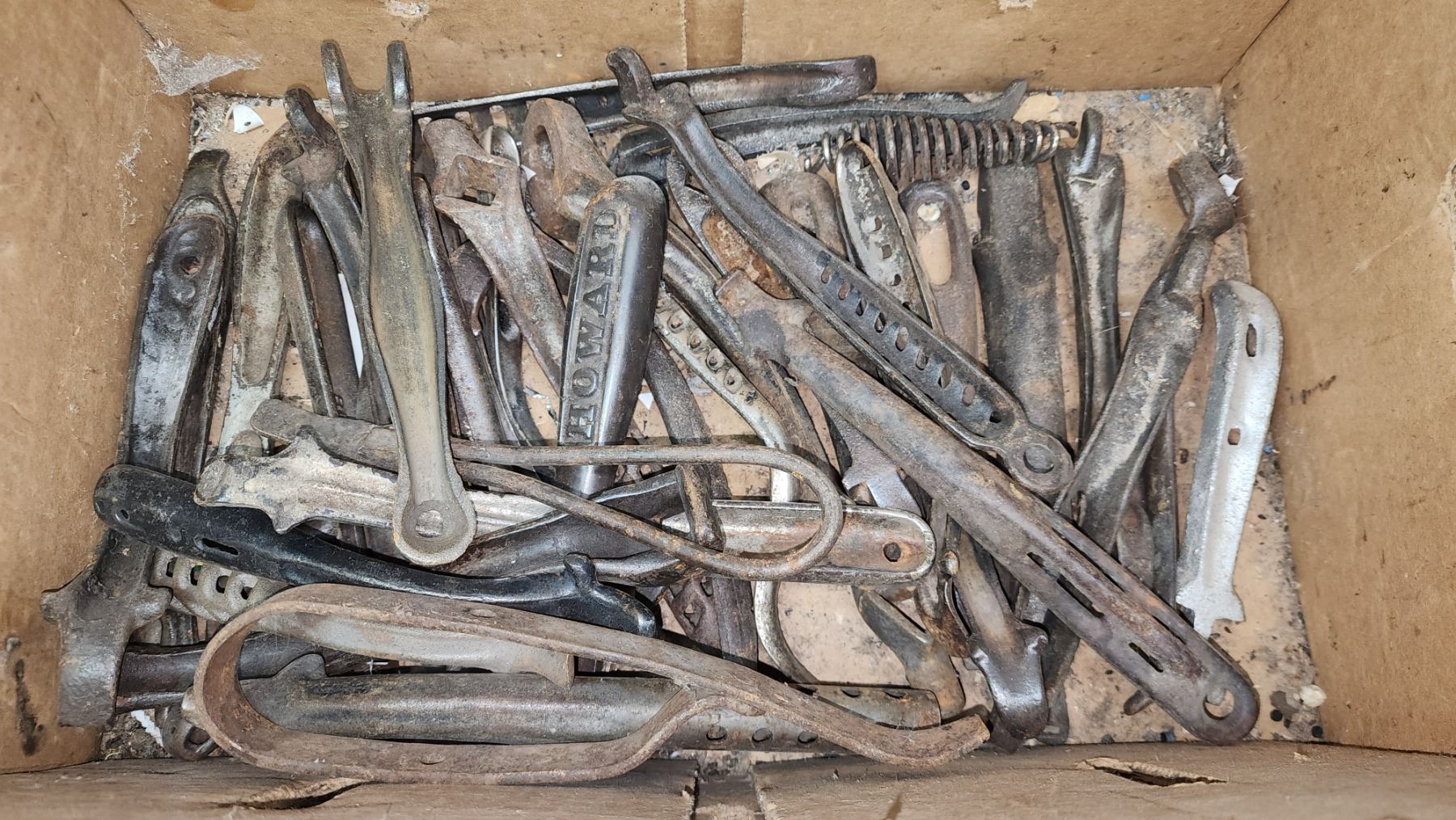 Box of assorted, vintage cast iron handles - various sizes and markings