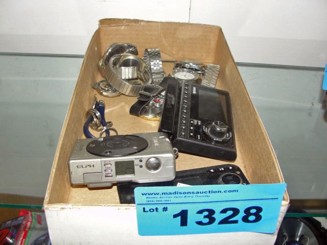 Box of assorted wrist watches, cameras, sirius