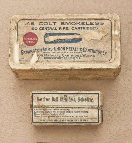 Box of cartridges marked 12 revolver ball cartridges, reloading, manufactured at Frankford arsenal, no date. Box tattered. Opening on ends. Other information not legible. Also an opened box of .45 Colt smokeless cartridges by Remington UMC. Approx. 20 cartridges. Some tatters, small losses. Est: $100 - $150