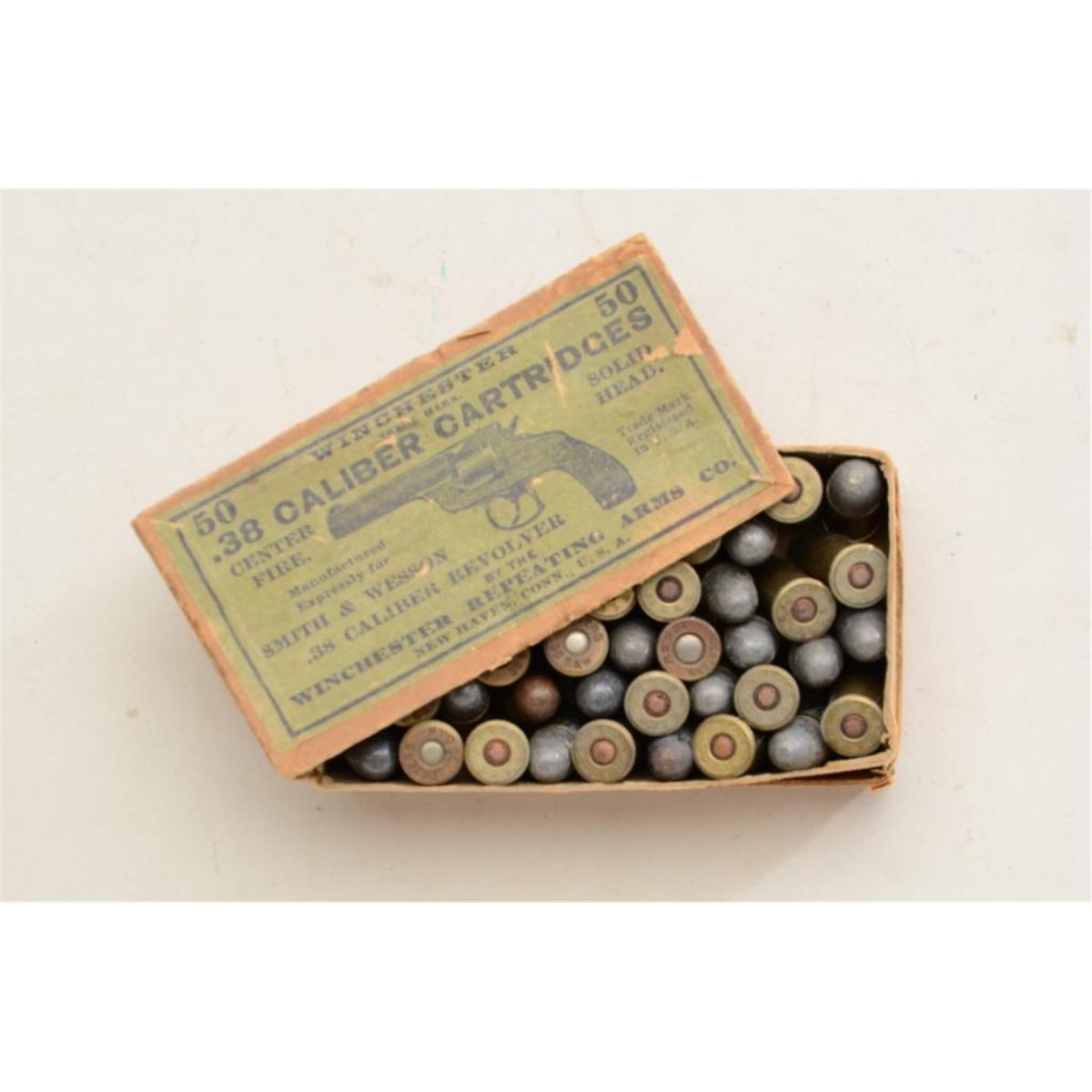 Box of collector ammo by Winchester, .38 caliber; box needs repair but cover label with S&W top break pocket revolver picture is complete; mixed head stamp rounds plus a small vial of loose collector rounds in .22cal., etc. Est.: $25-$50.