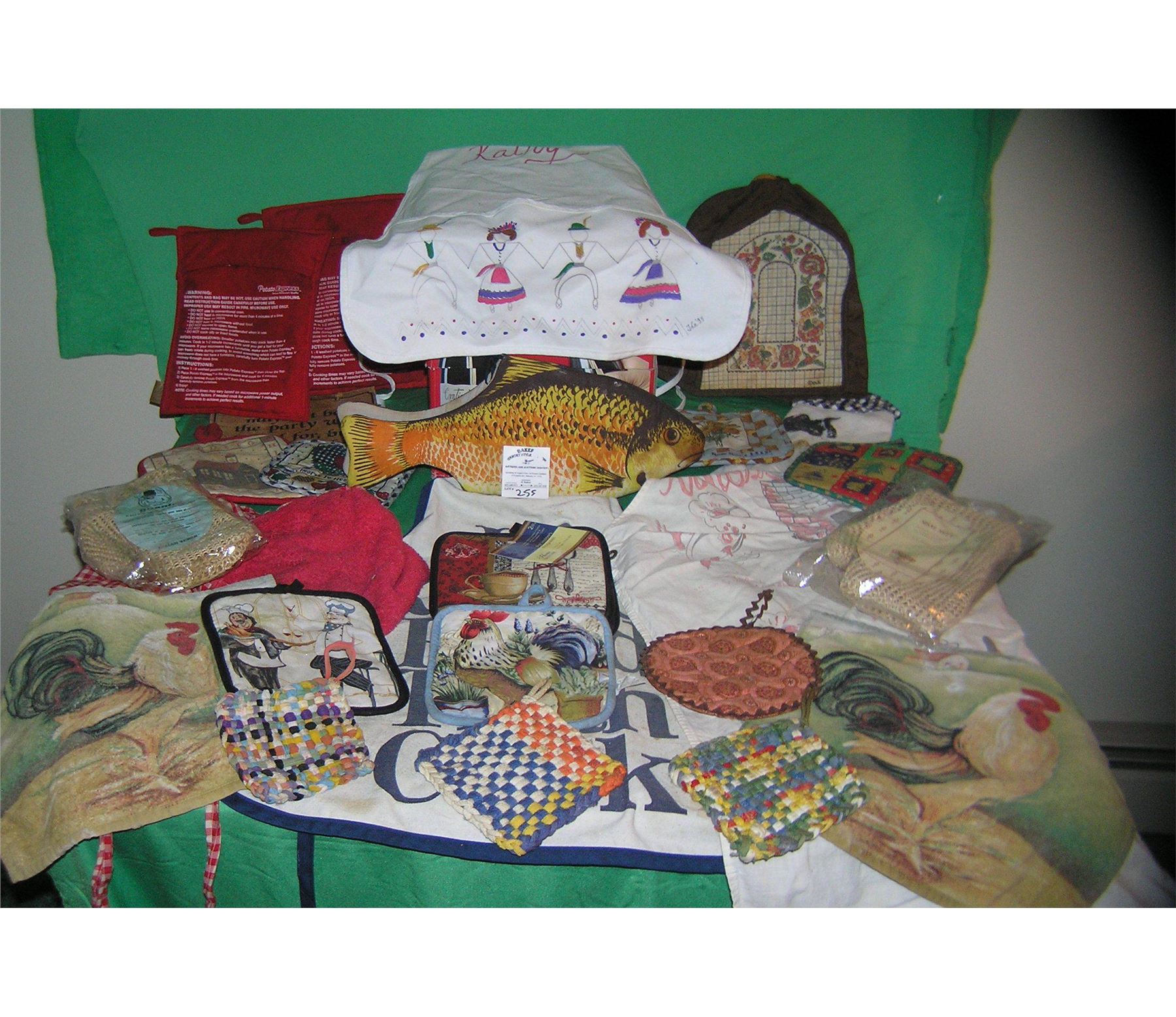 Box full of vintage estate cooking aprons, hot plate mats, pot holders and more est. value $50.00-$60.00