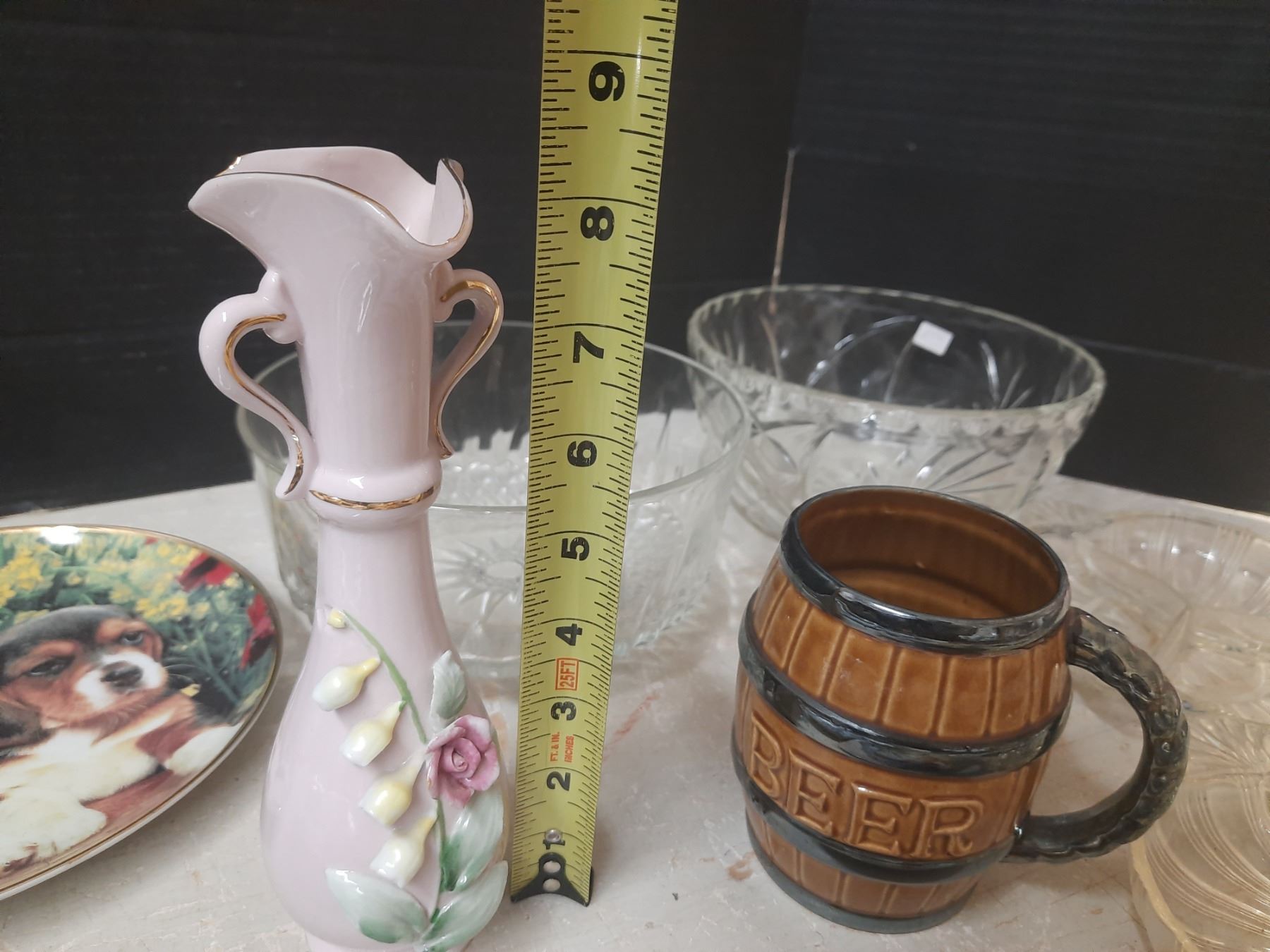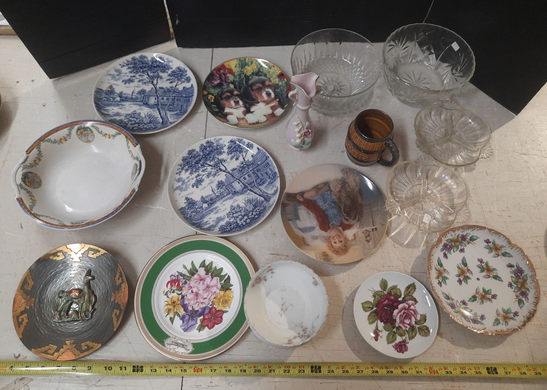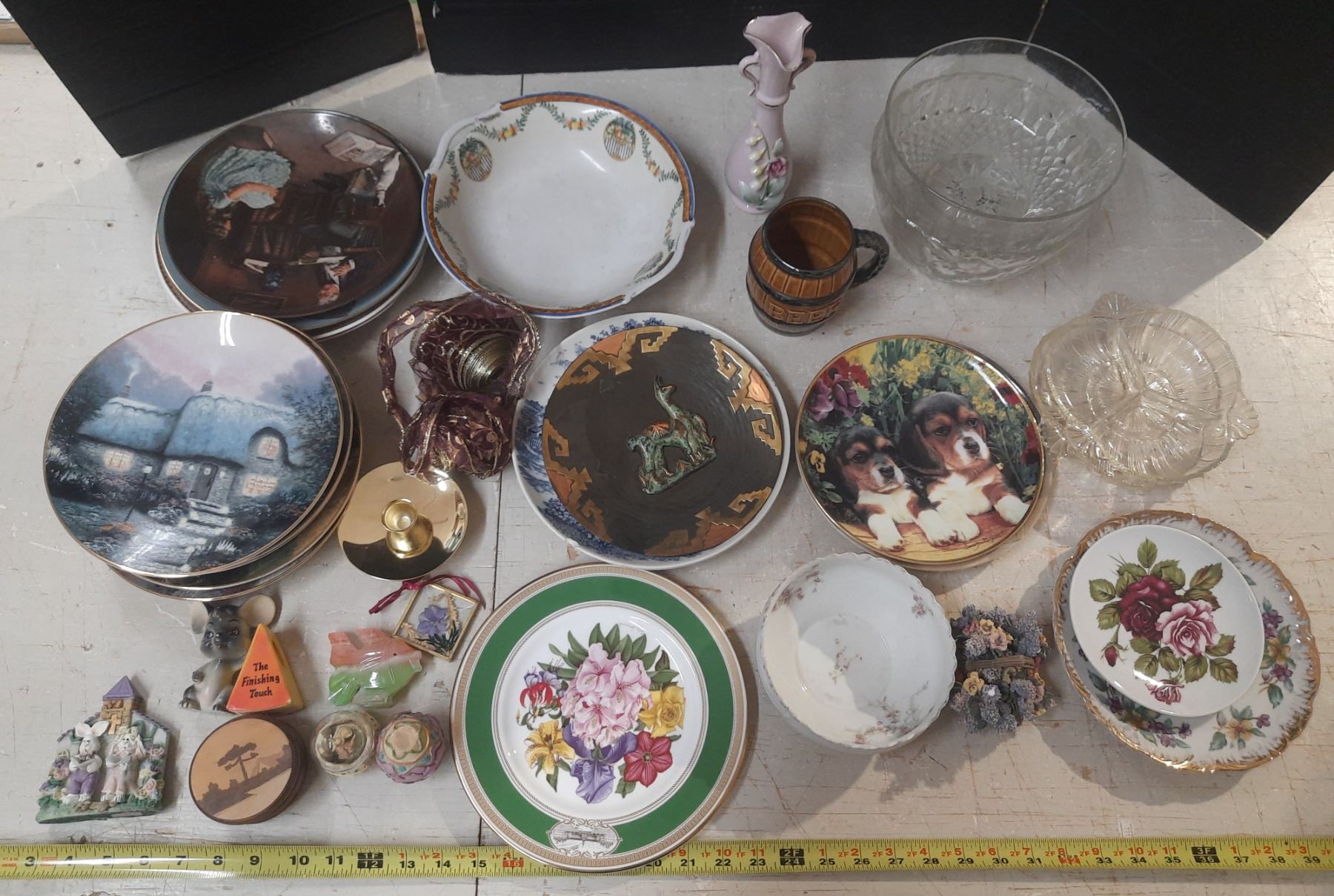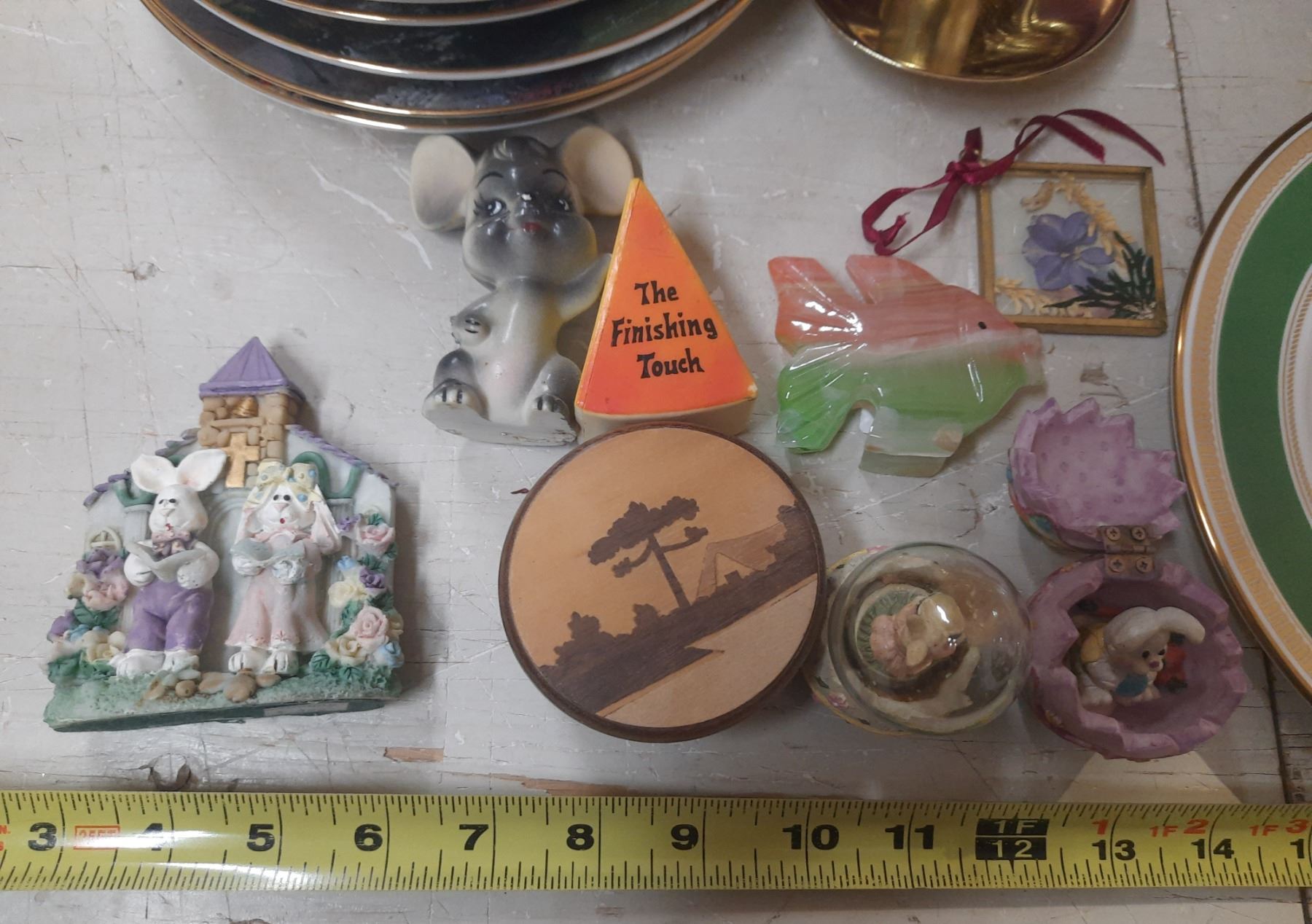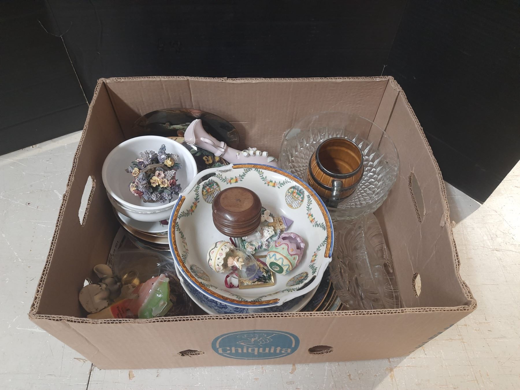 Box of decorative items, plates, small figures, bowls, bear mug, etc.