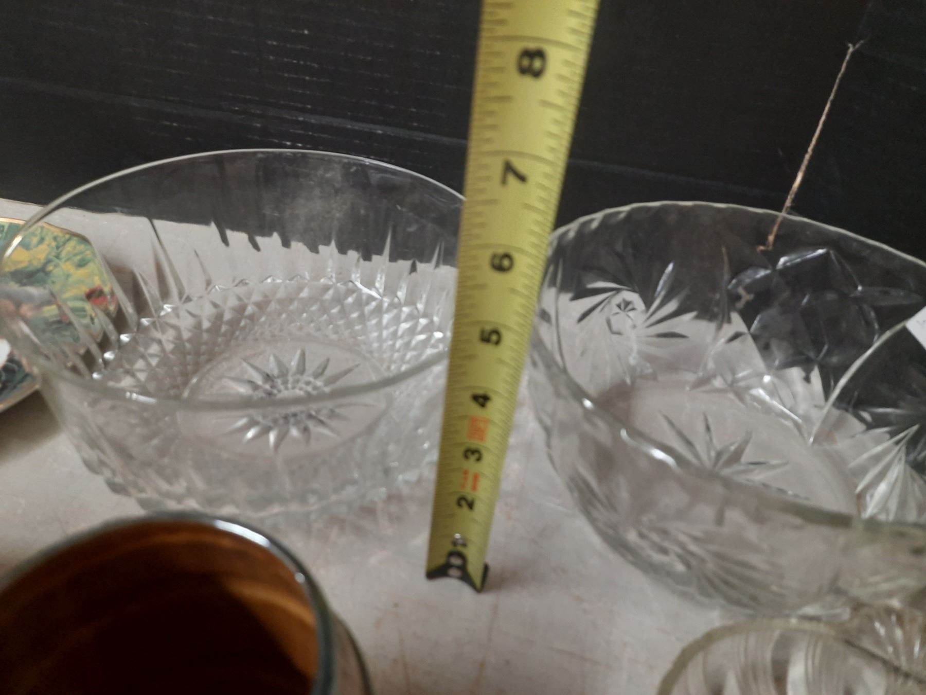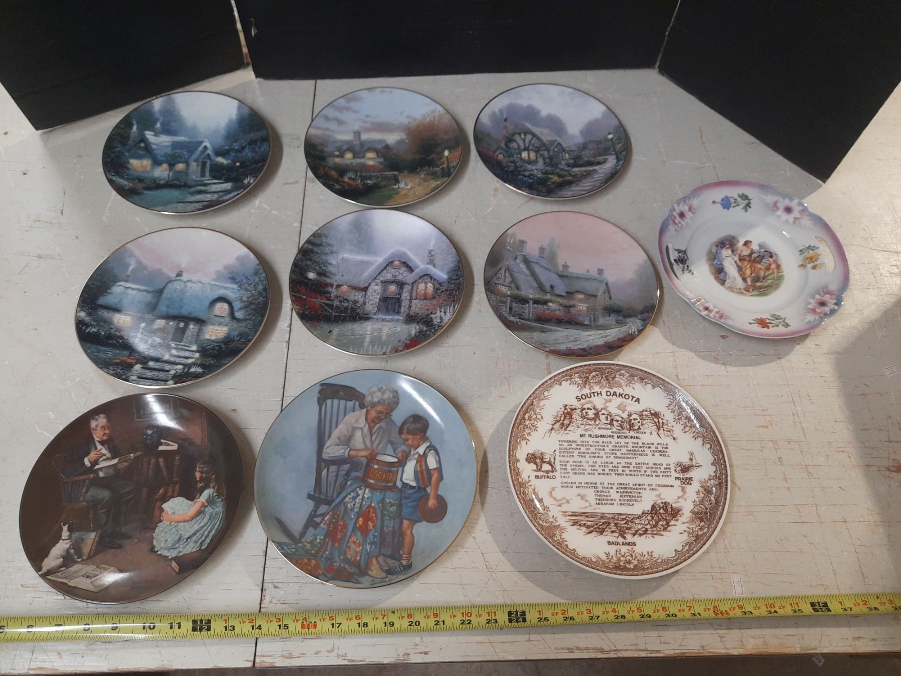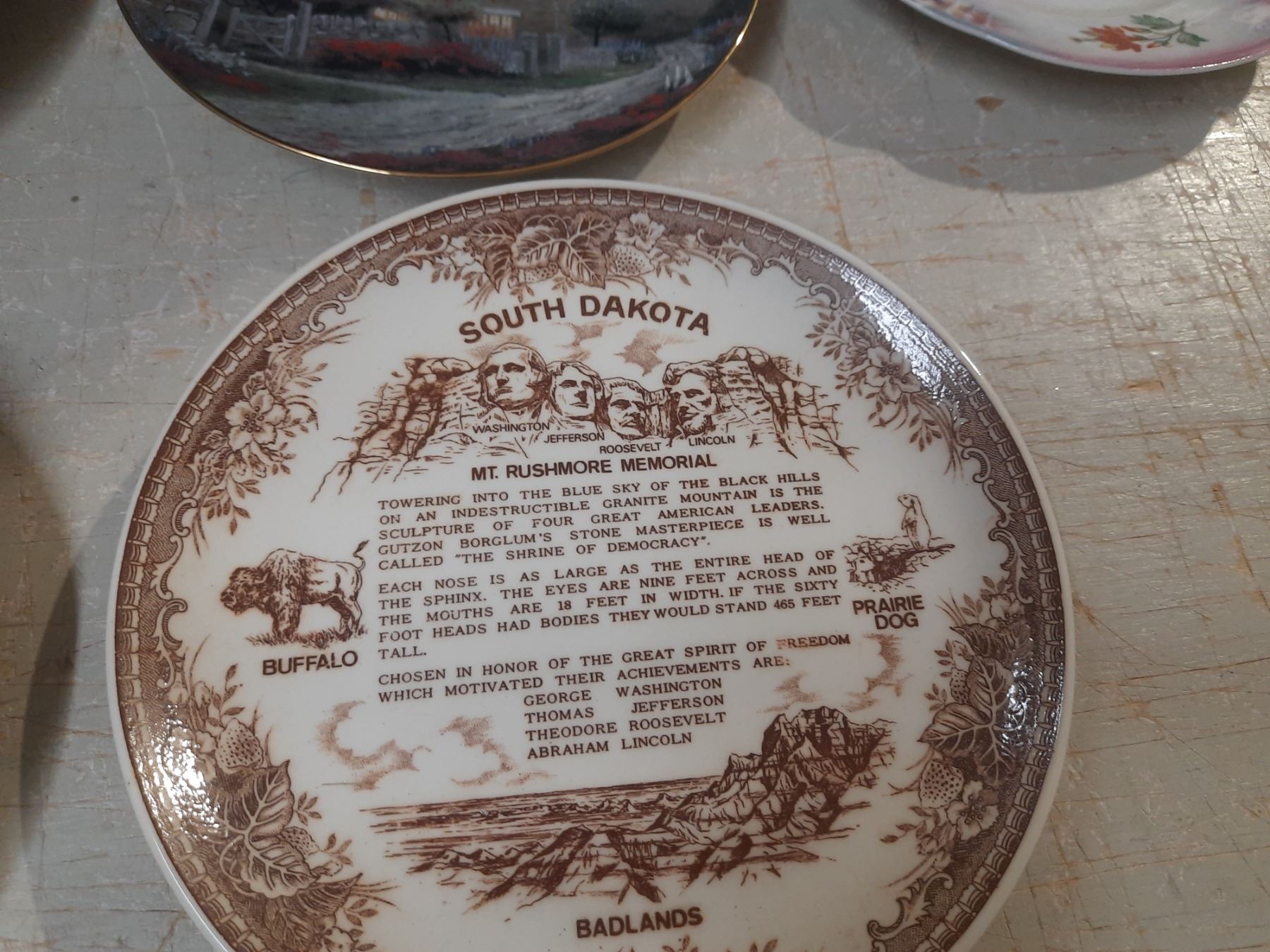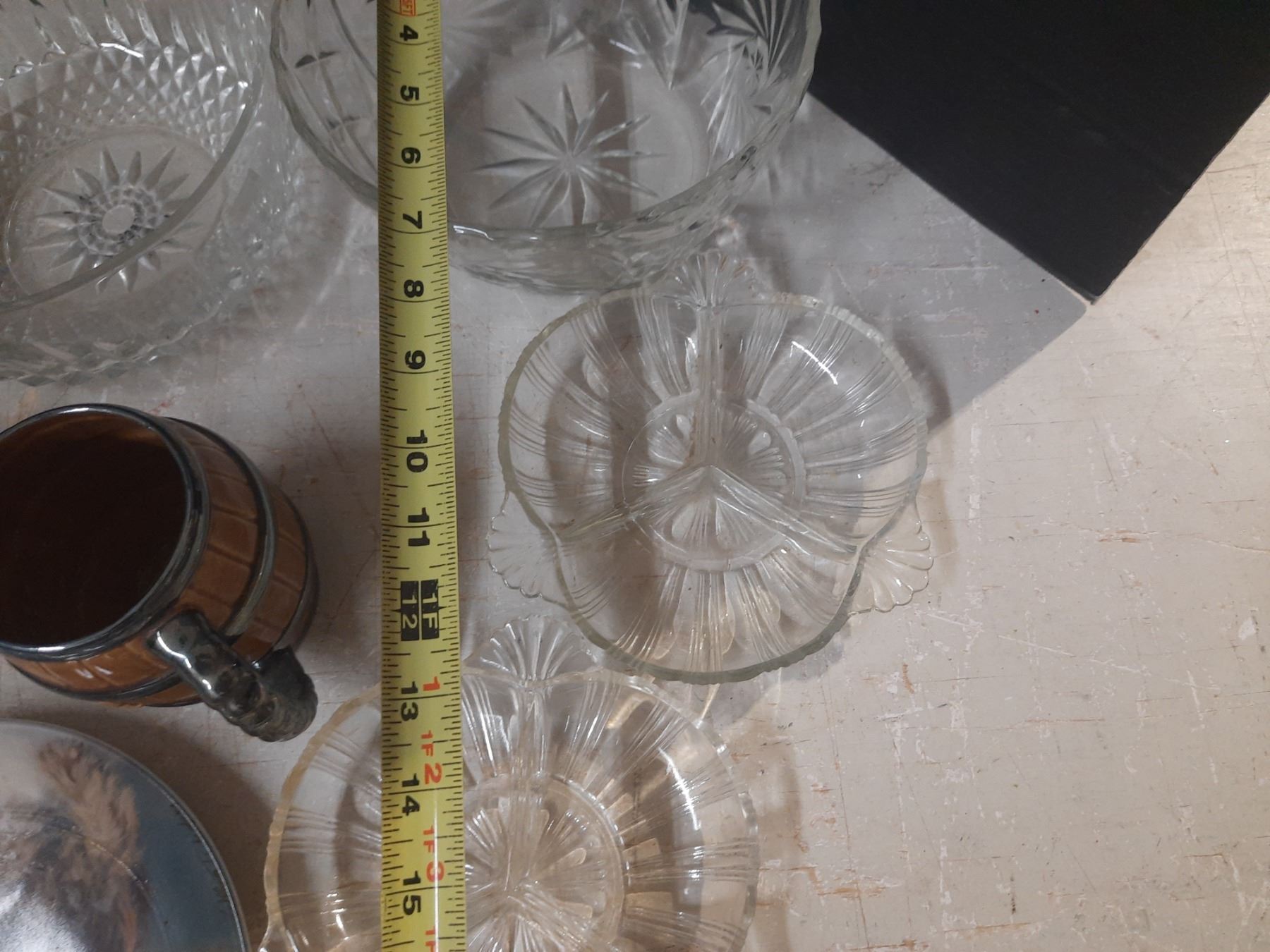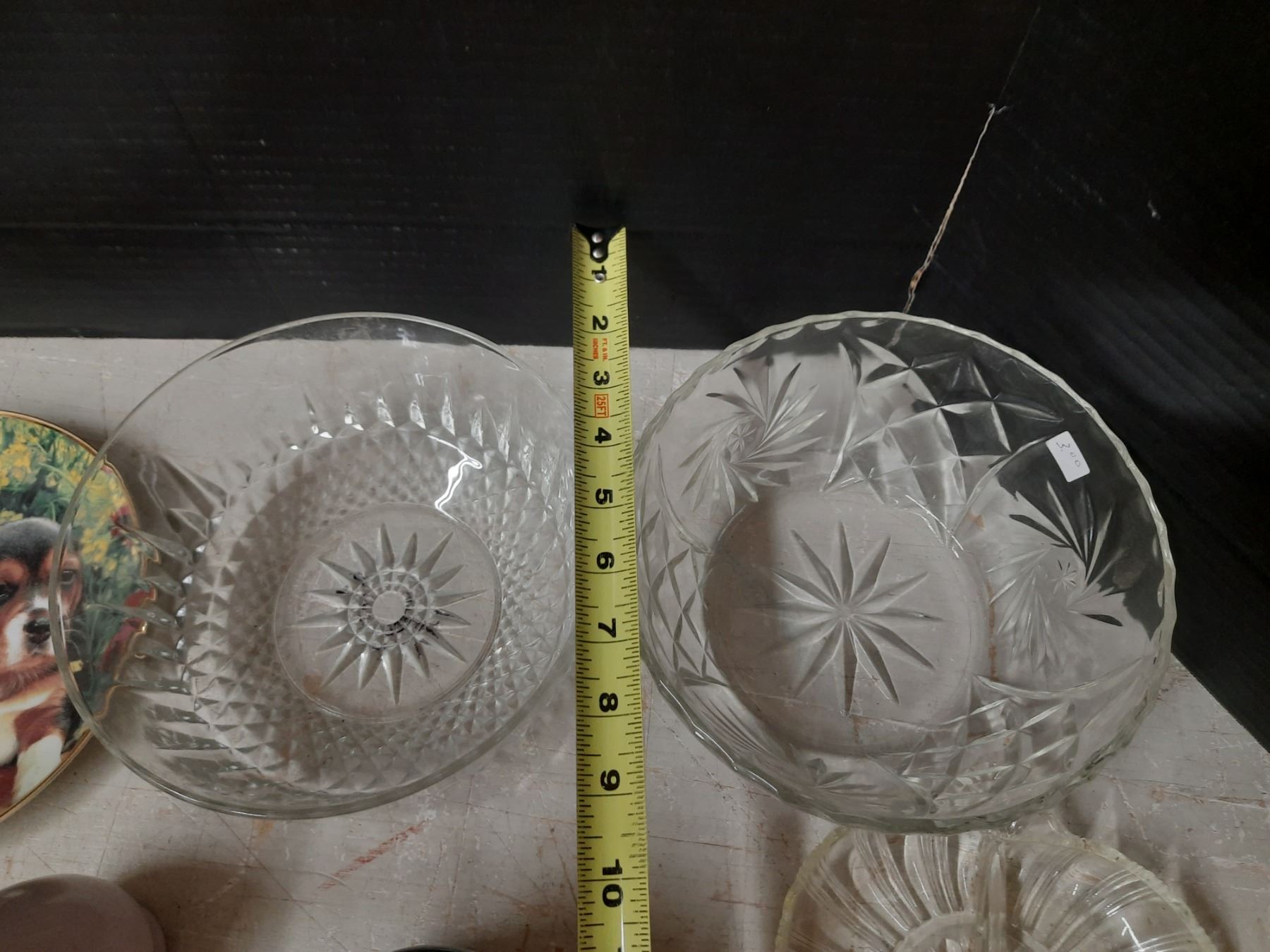 Box of decorative items, plates, small figures, bowls, bear mug, etc.