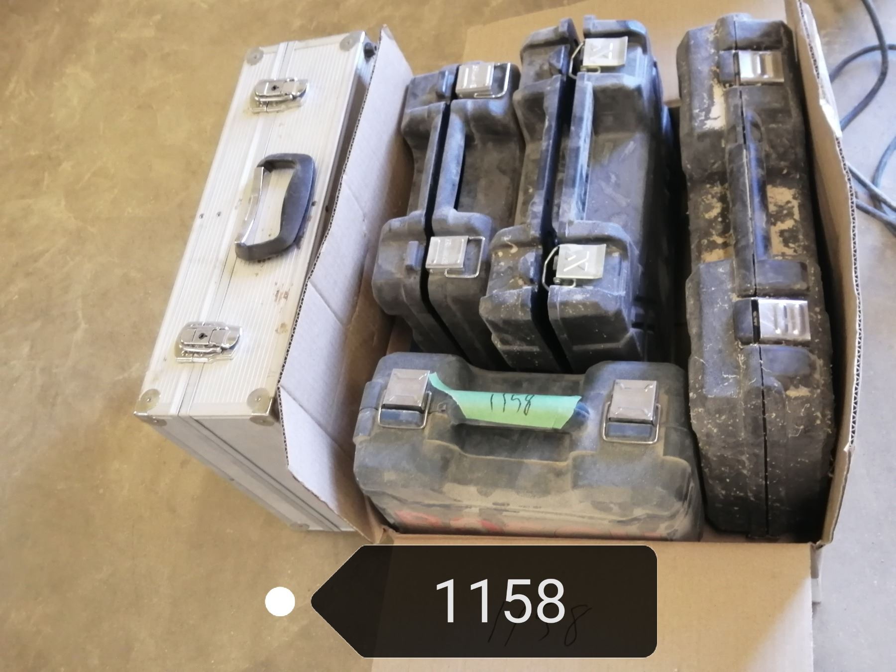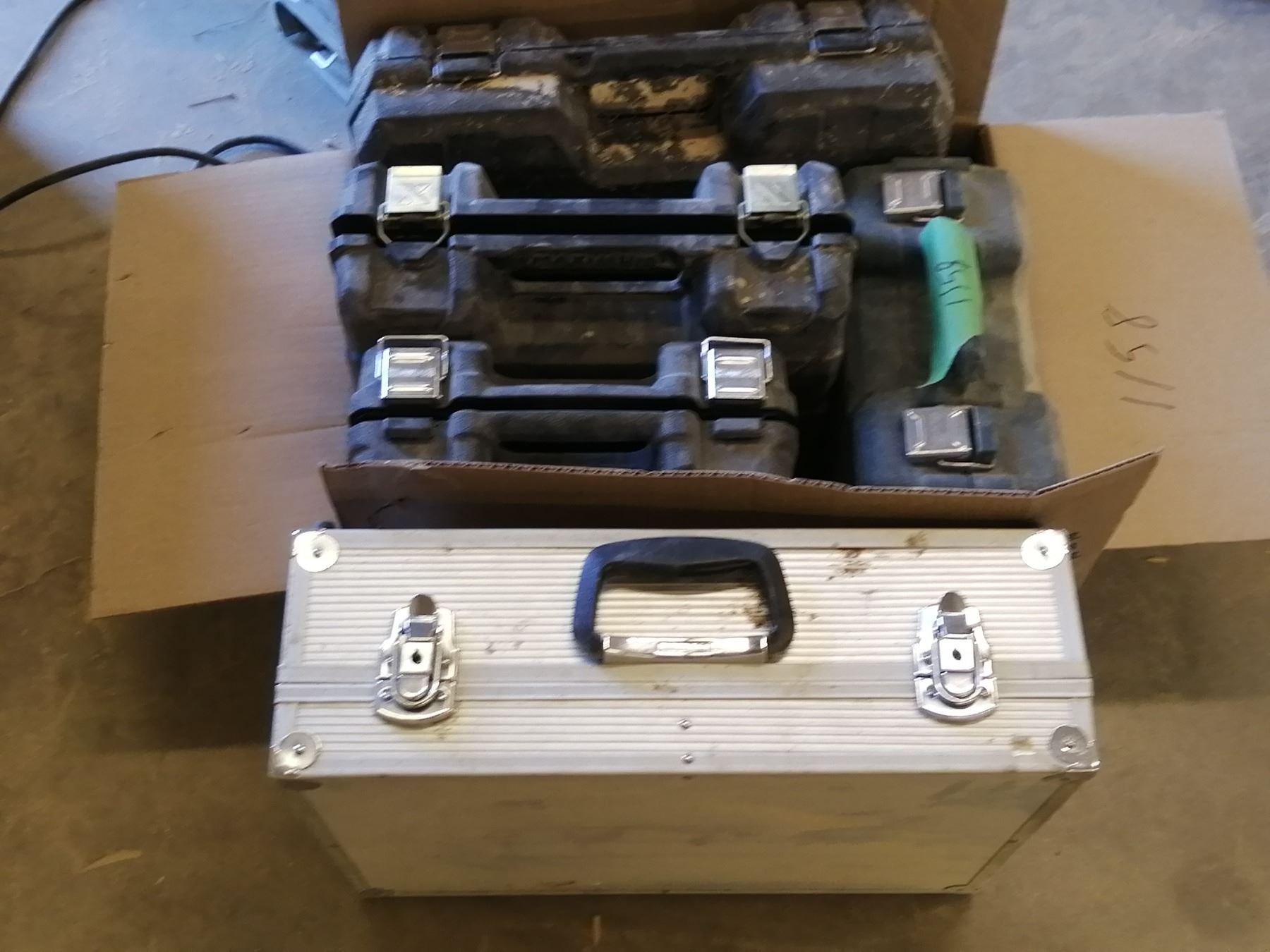 Box of empty power tool boxes & empty metal suitcase style tool carrier