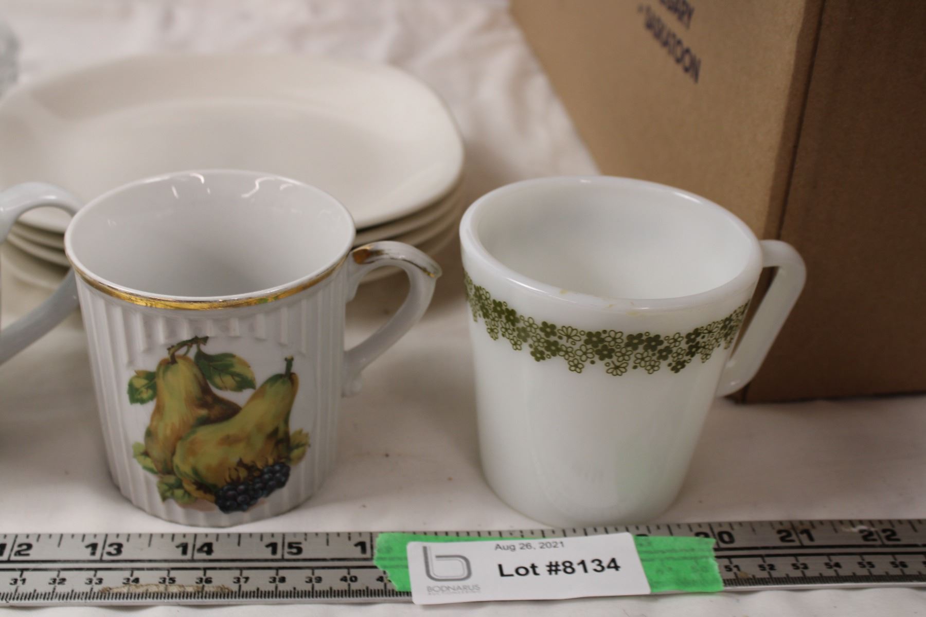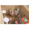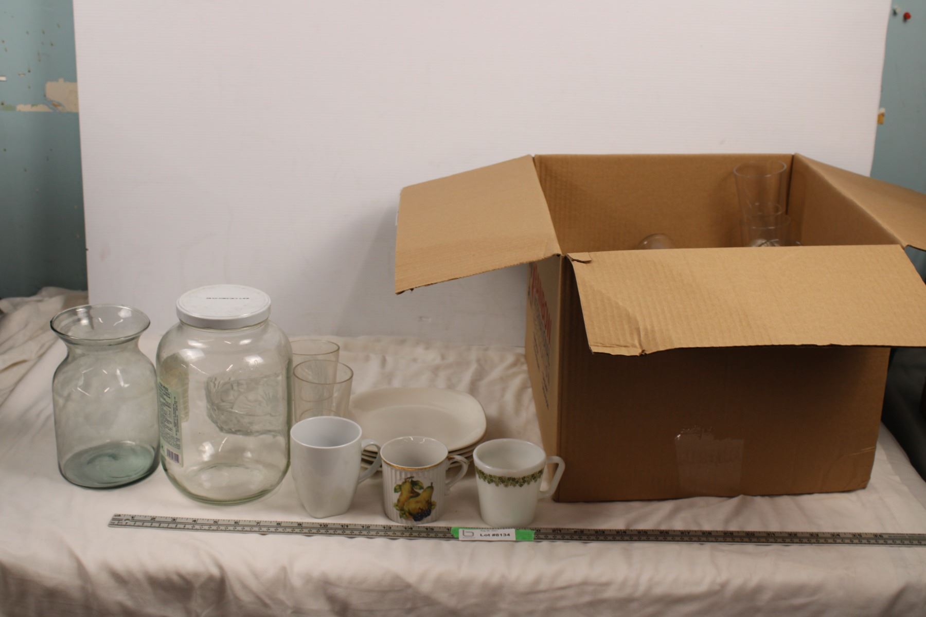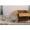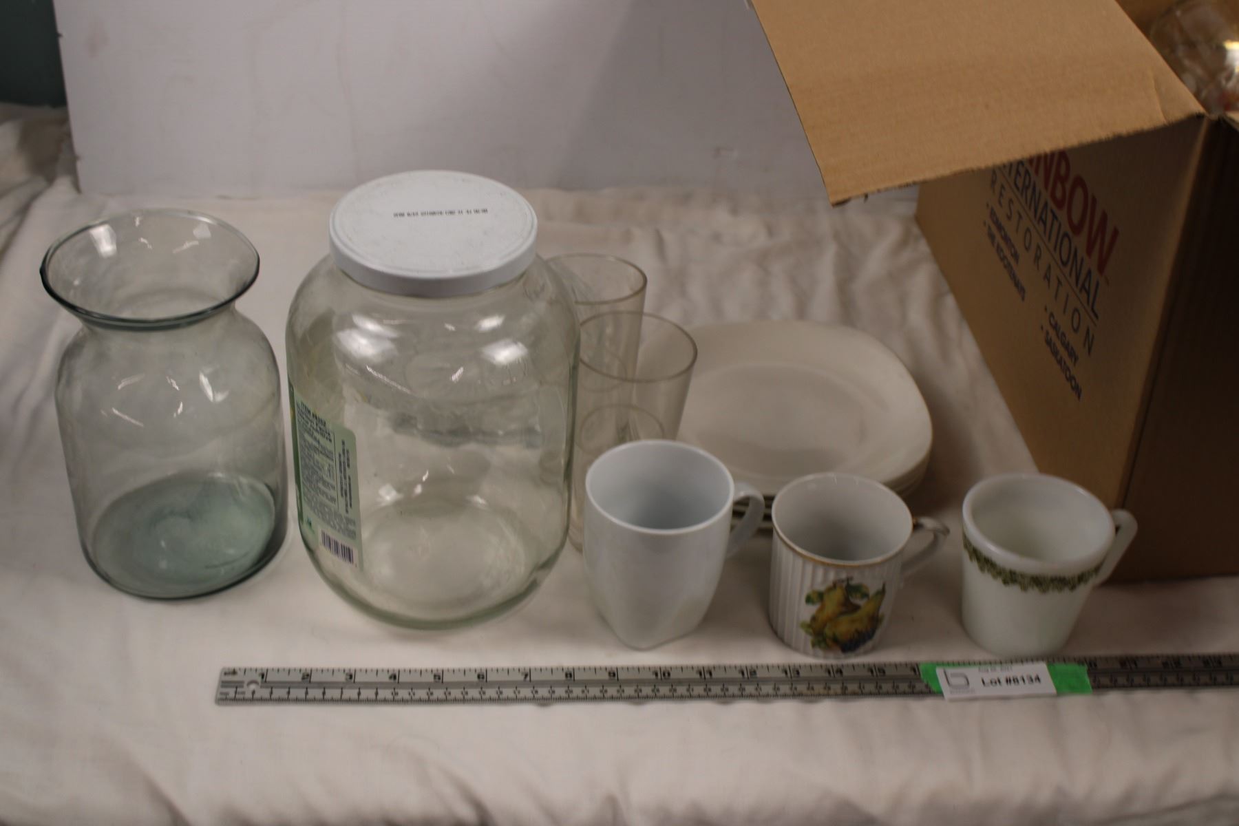 Box of glassware, pickle jars, plastic cups, 1 pyrex cup