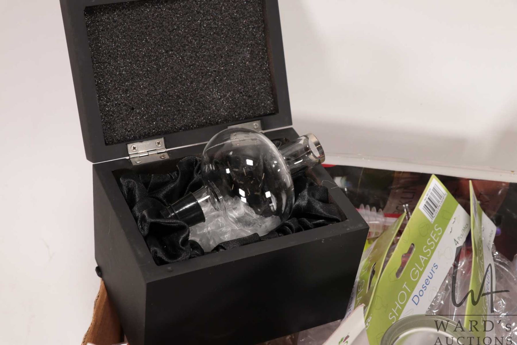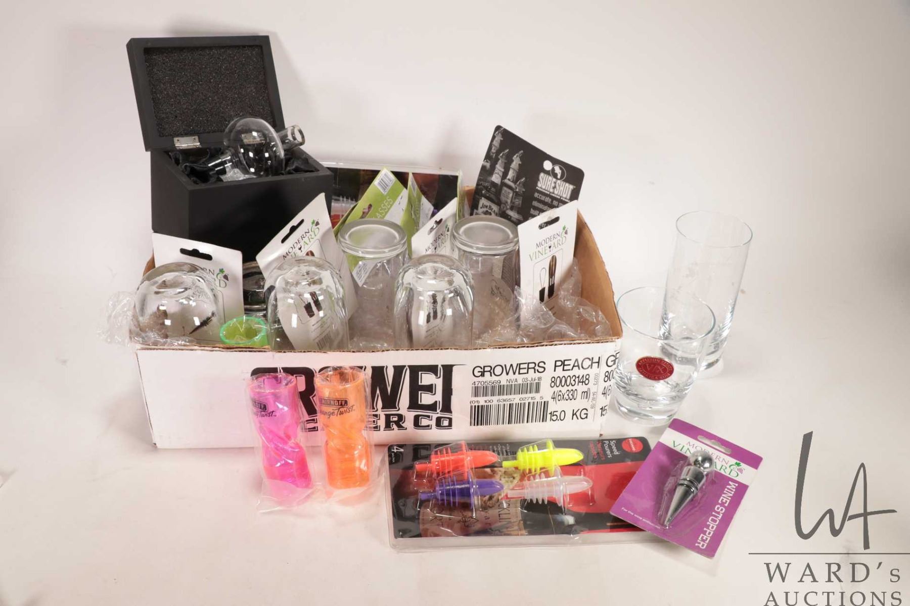 Box of liqour accessories including hand blow globe aerator, liqour pourers, spouts, stoppers, plastic shot glasses, and miscellaneous liqour glasses. Note: Alcohol cannot be insured by any courier in Canada. Local pick up is recommended. Canadian bidders only