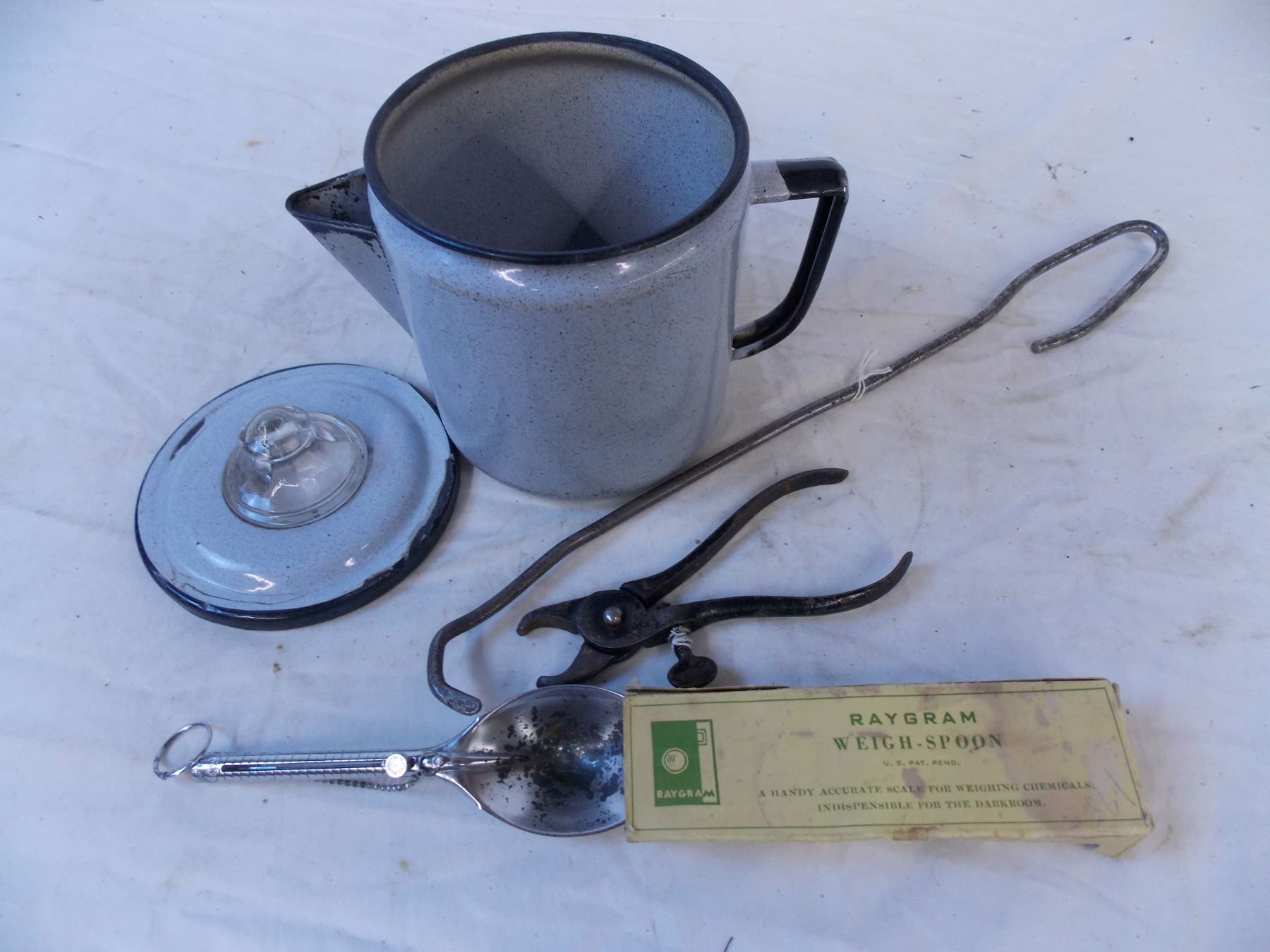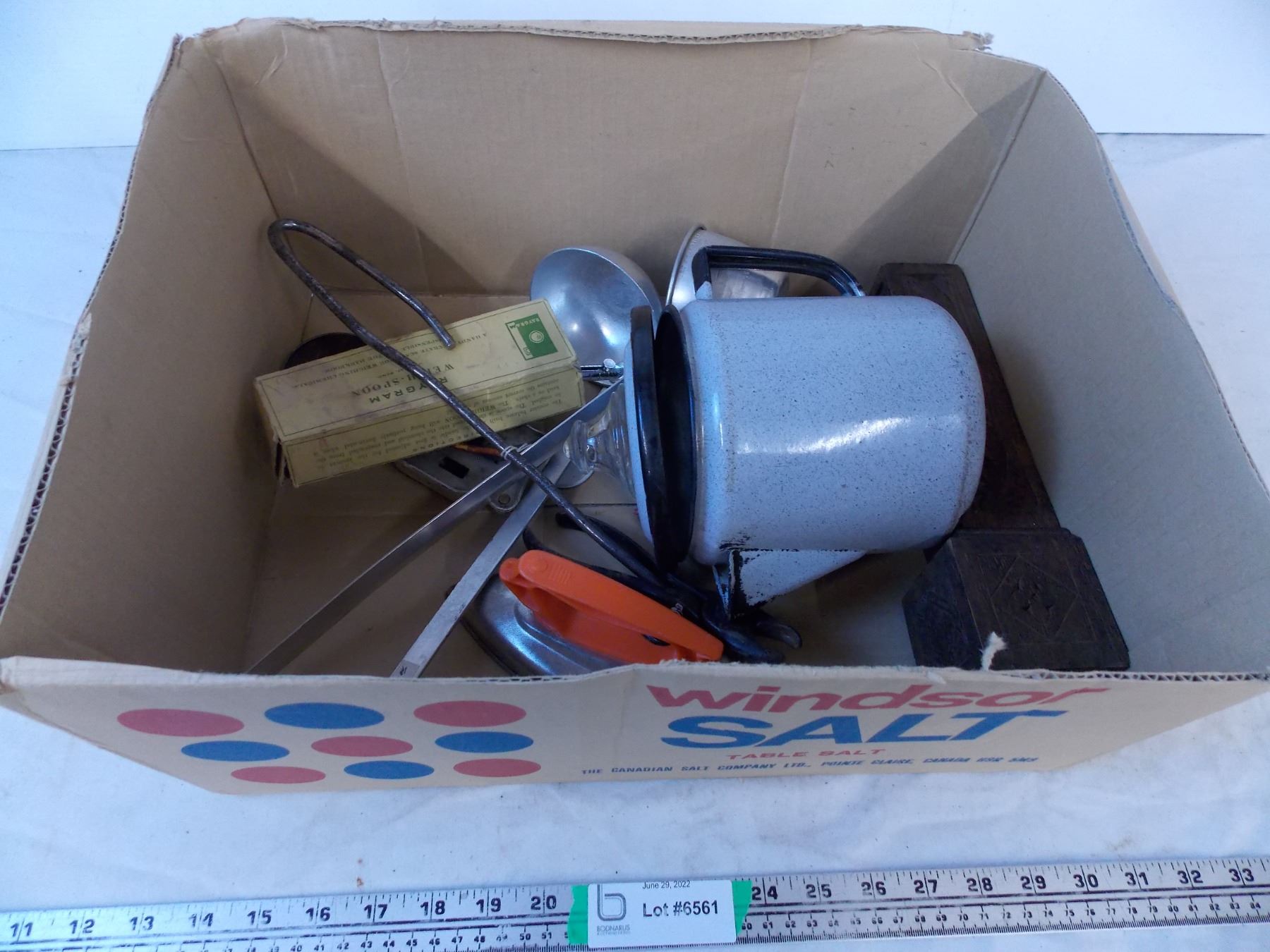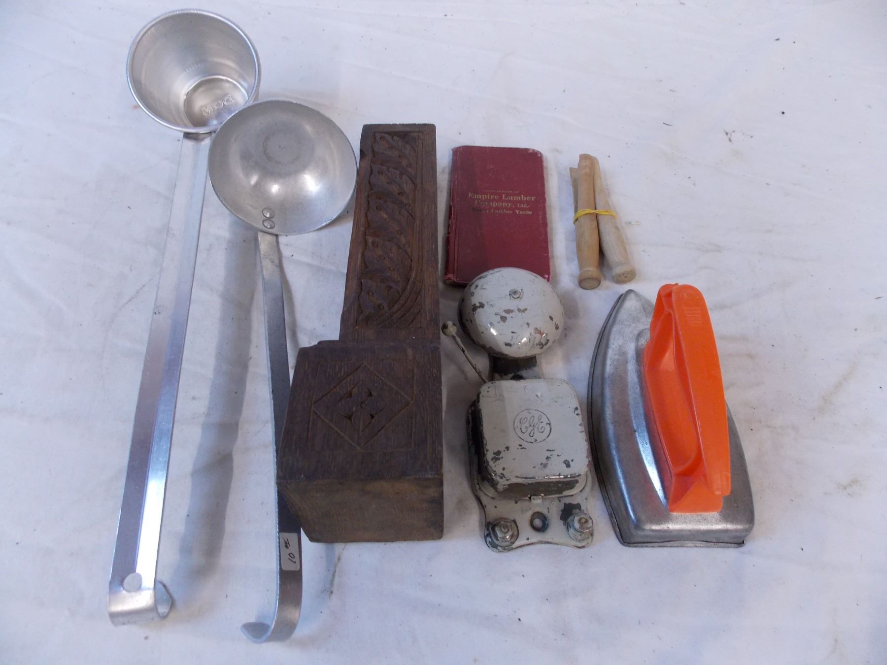 Box of misc. Items kettle, doorbell,ladelsand spoons