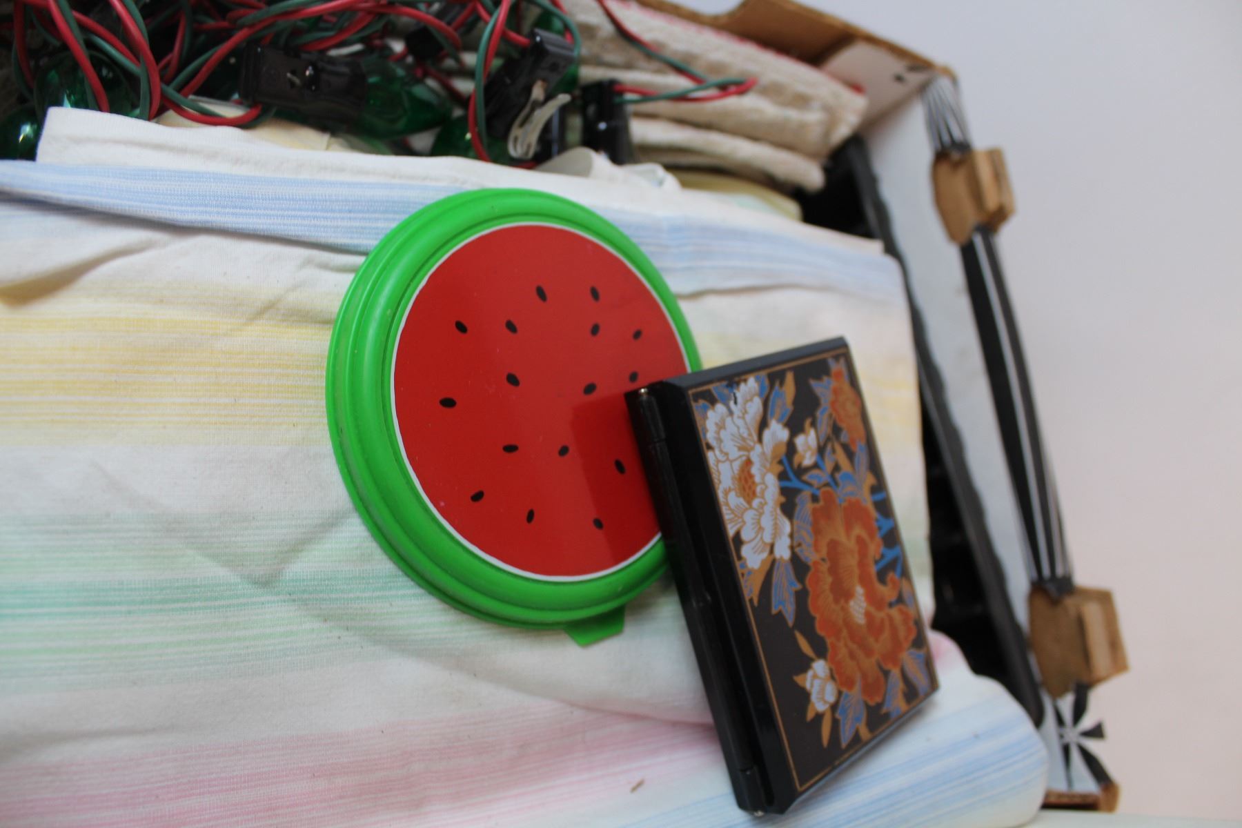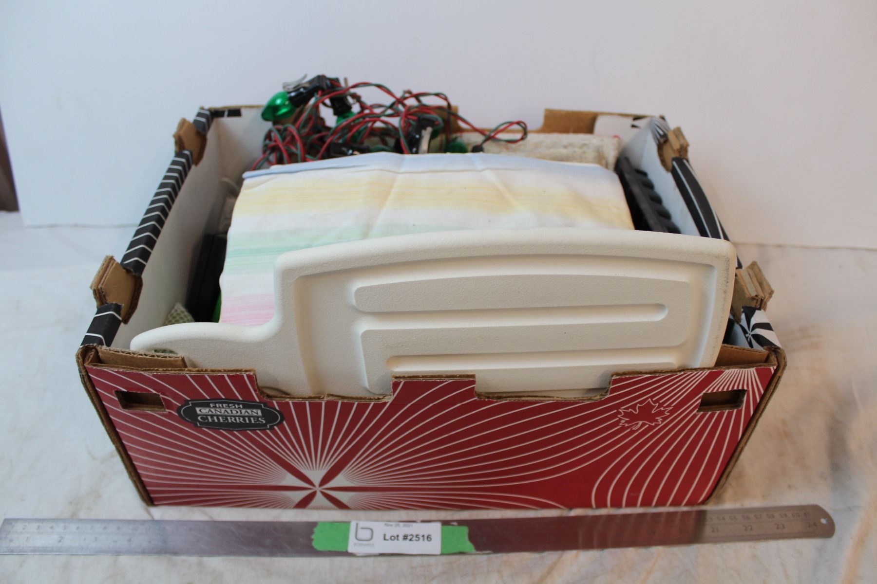 Box of misc house items, sheets, vintage Xmas lights/bulbs, cutting board