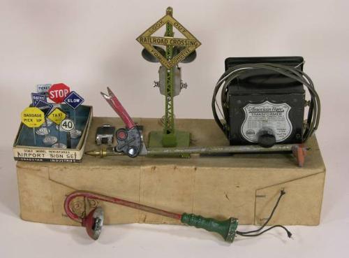 Box of misc. railroad items including Lionel crossing signal, street light, American Flyer #1295 transformer, etc.