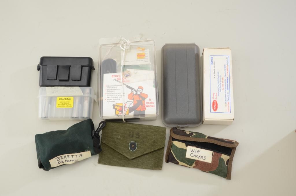 Box of misc. shotgun chokes and snap caps along with a variety of choke and choke tube cases, a shoulder recoil pad and misc. shotgun accessories; great for the gun show table. Est.: $100-$300.