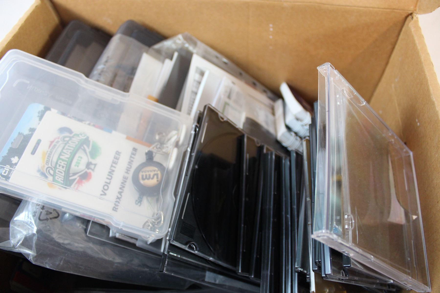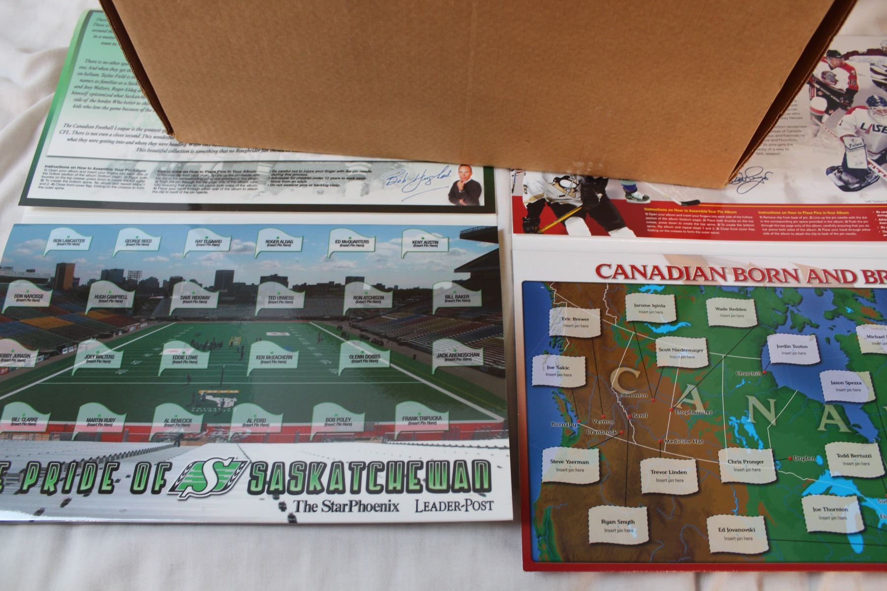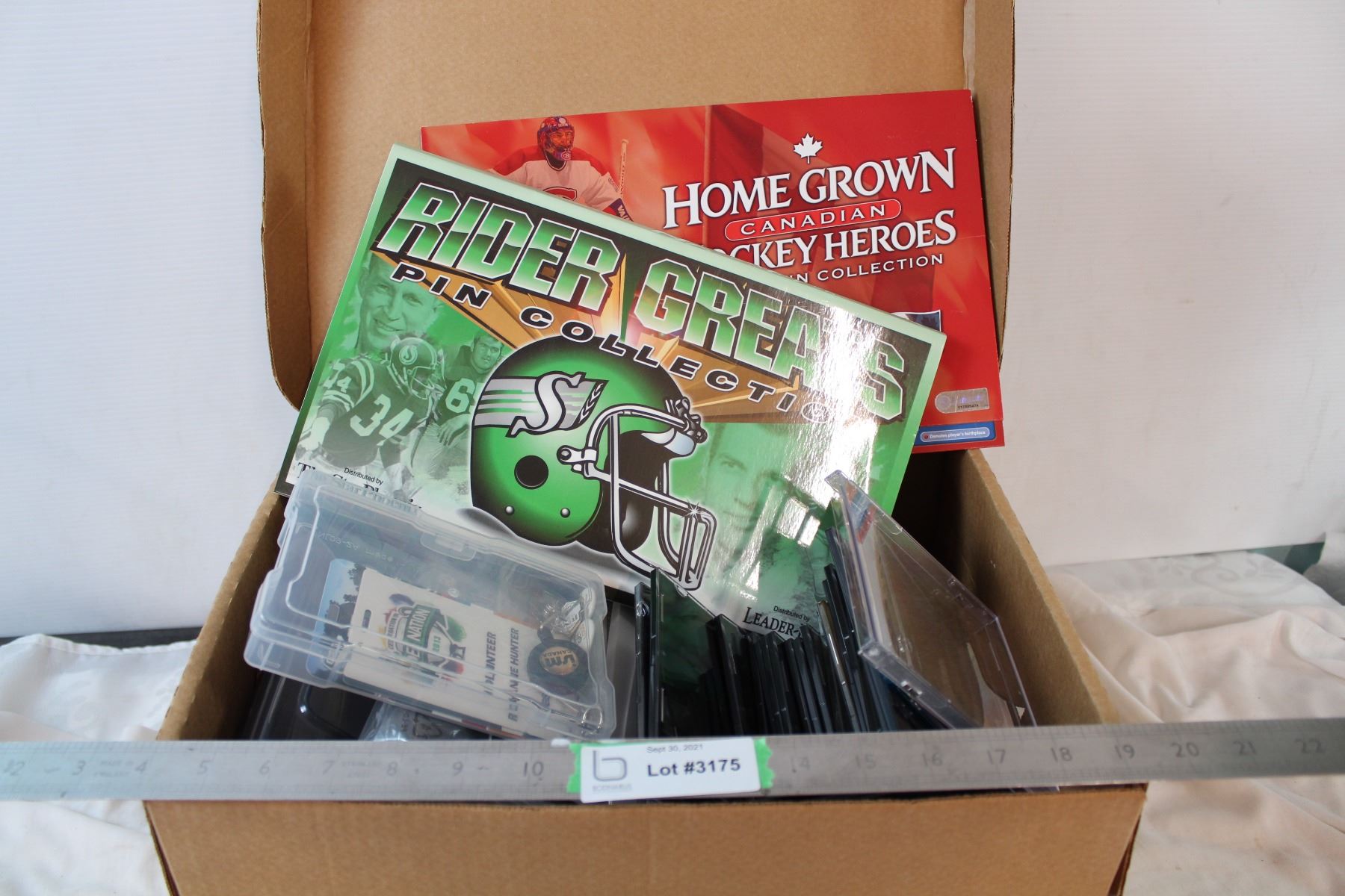 Box of misc with Roughriders + Canadian pin boards