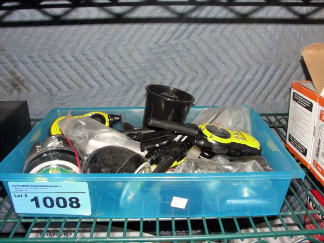Box of motorolla walkie talkies, assorted lights,