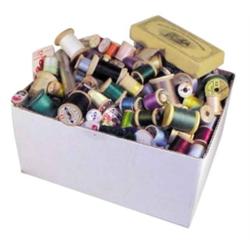 Box of old wooden spools, mostly w/thread, approx. 300 in box.