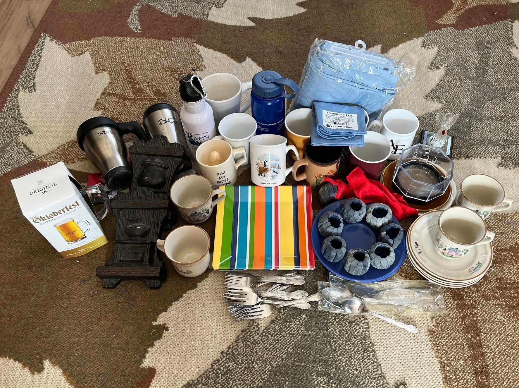 Box of random kitchen items. Plates, mugs, napkin rings, table cloth, travel mugs.