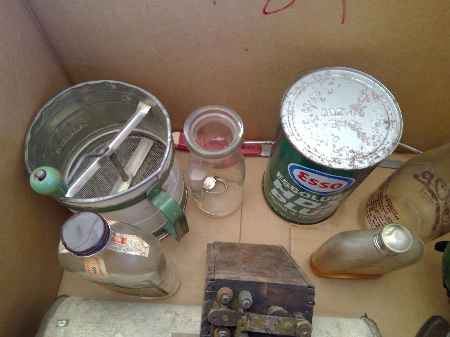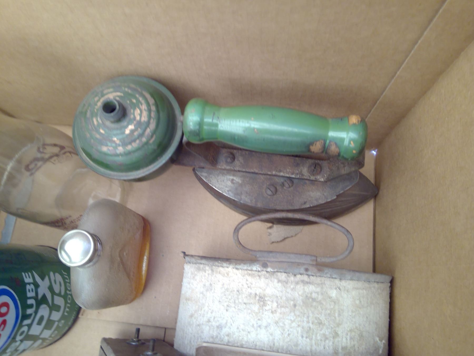 Box of sad iron, bottles, flour sifter and misc.