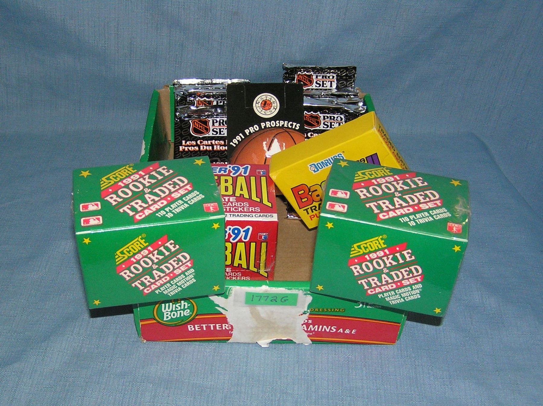 Box of unopened sports packs and boxes includes rookies and all stars baseball, basketball and hockey est. value $250.00-$275.00