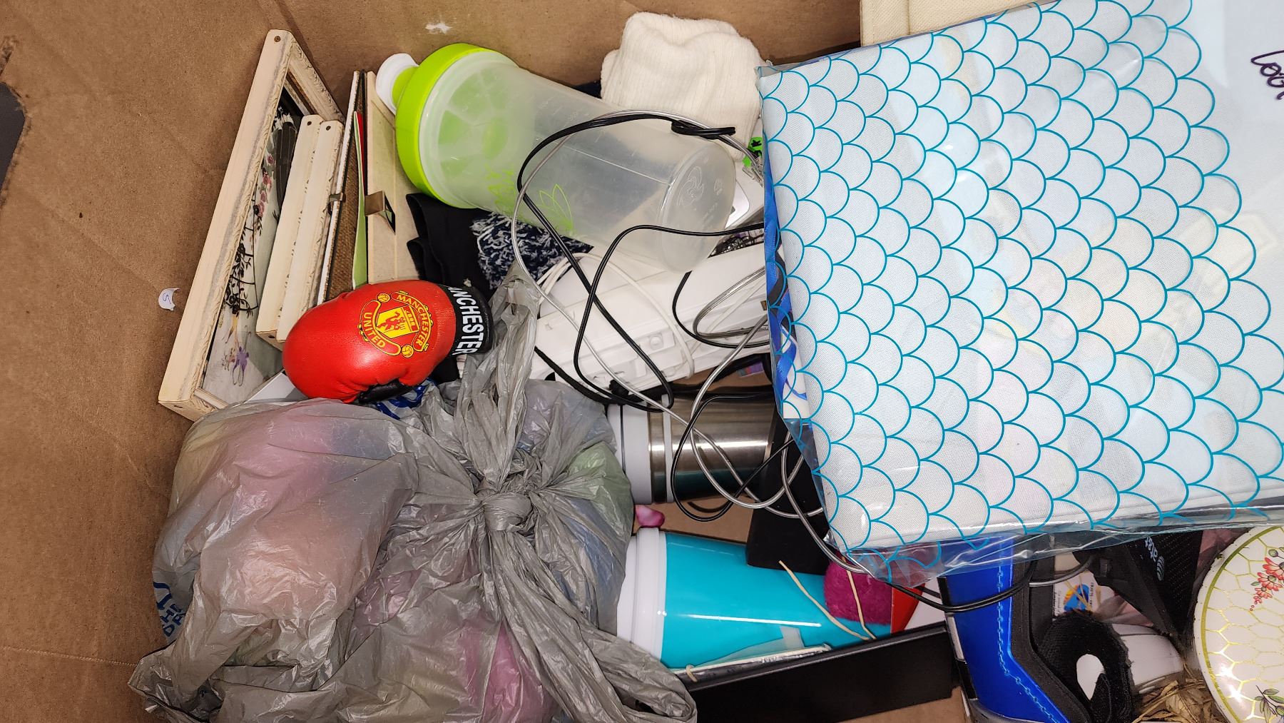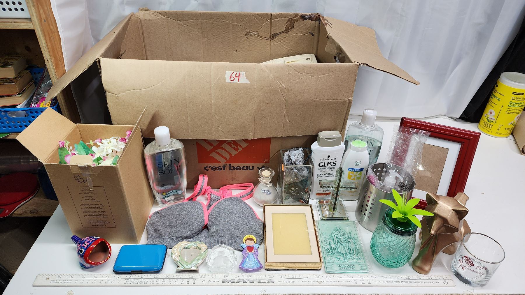 Box of various items - Picture frames, shampoo, ornaments, wireless phones, shaker bottles, etc.