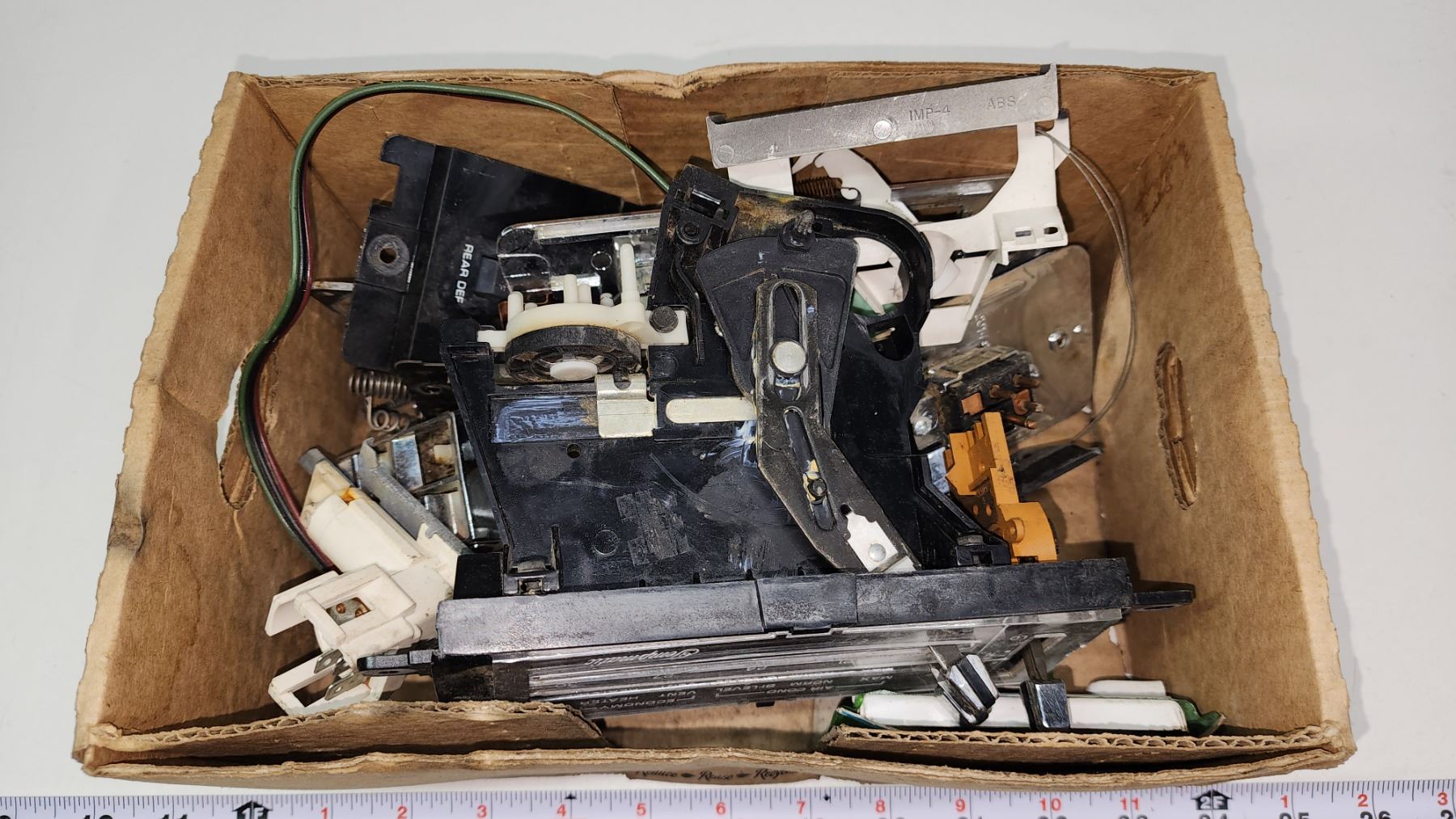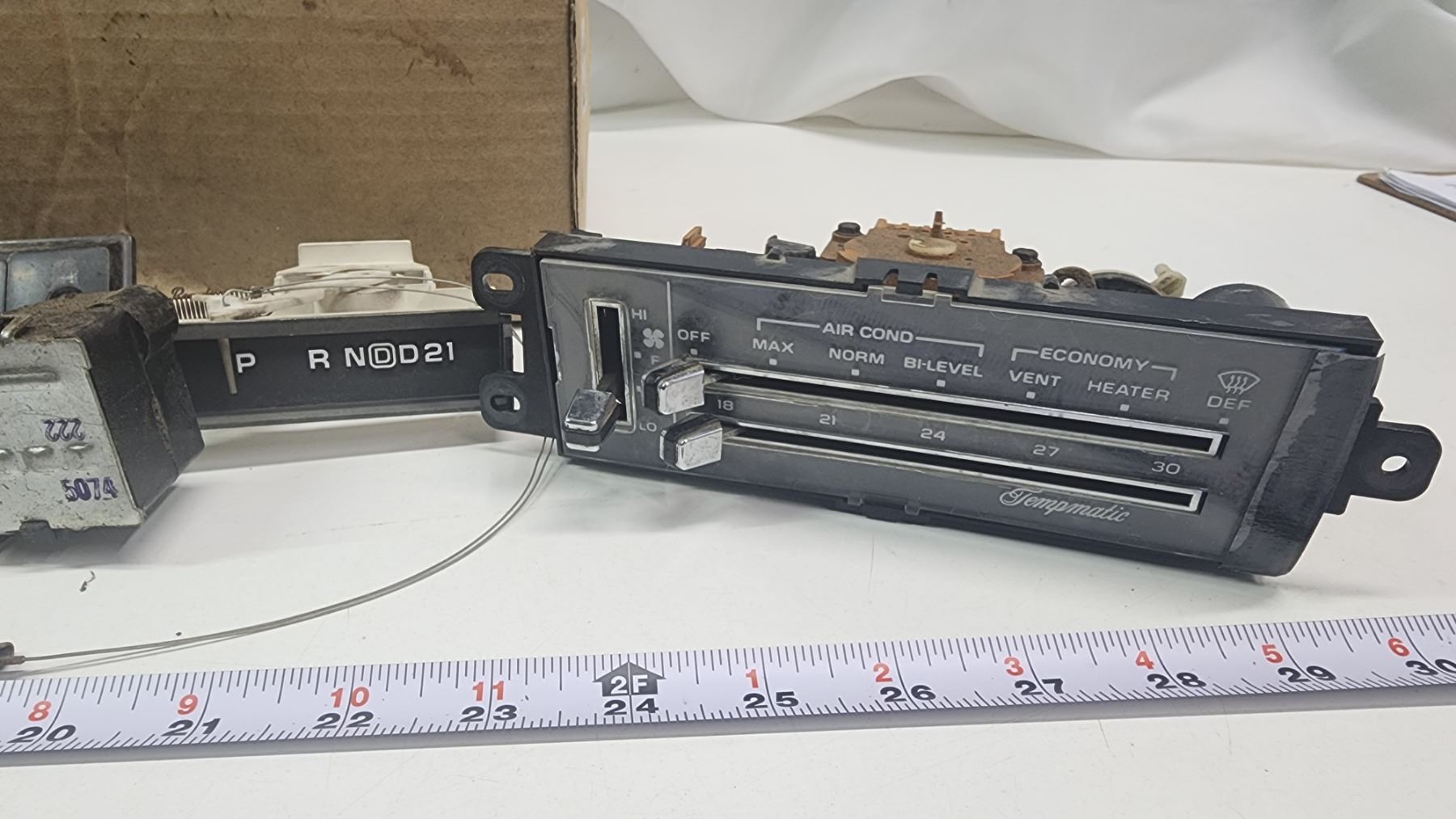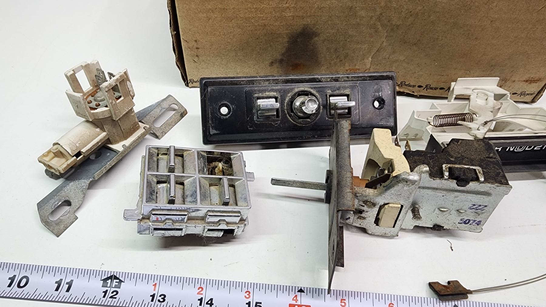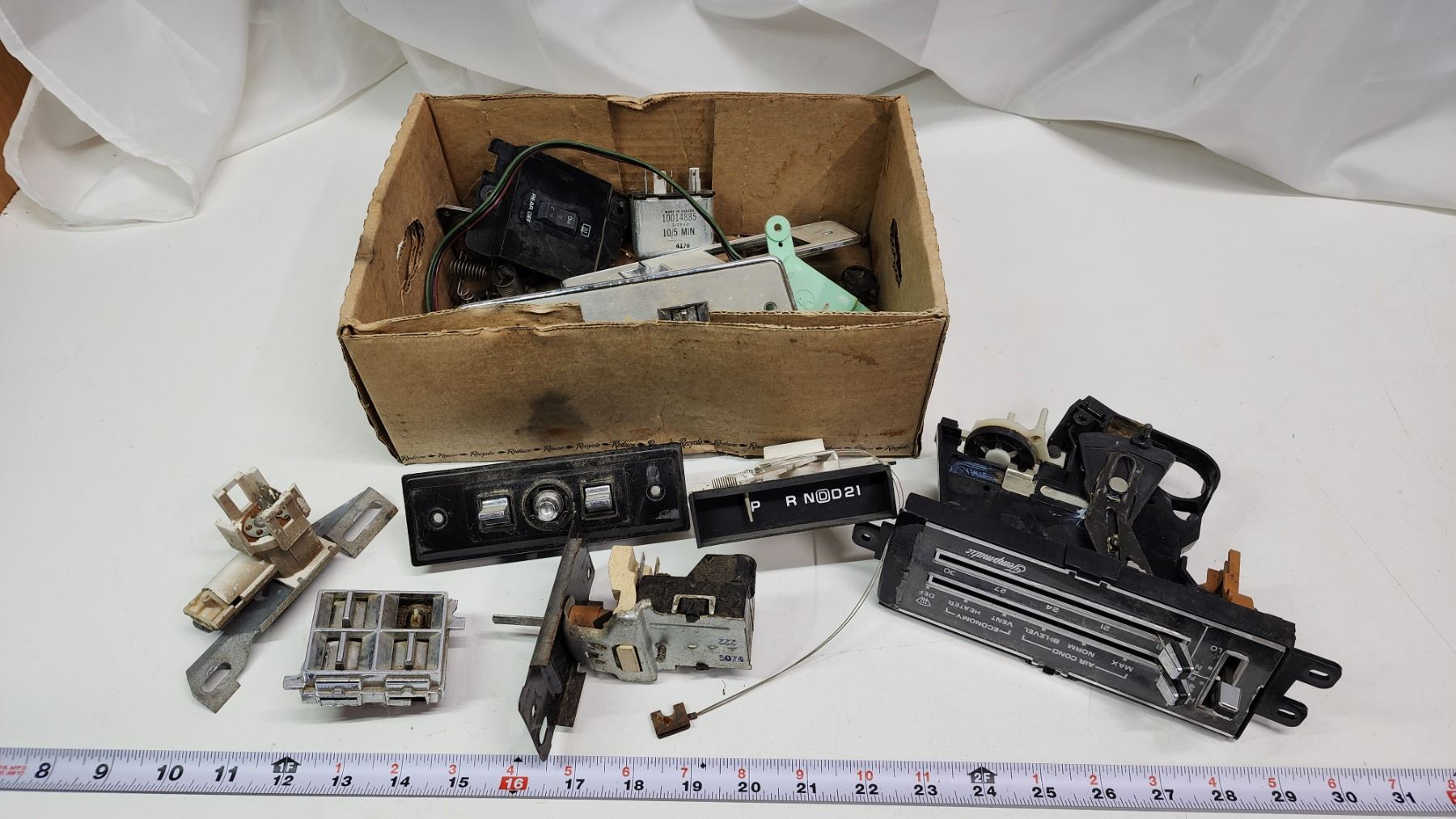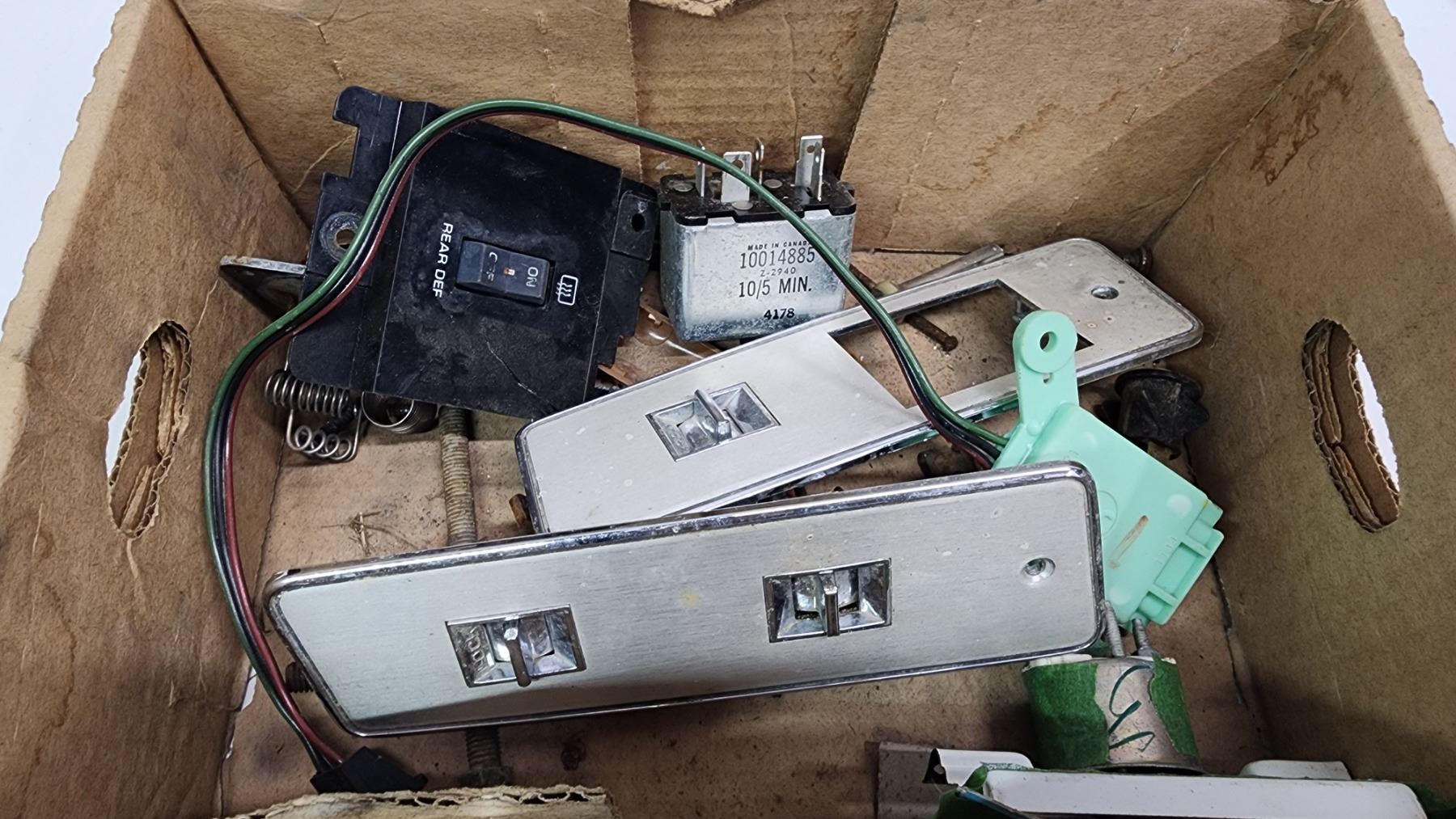 Box of vintage car parts - Climate control module, power window module, etc.