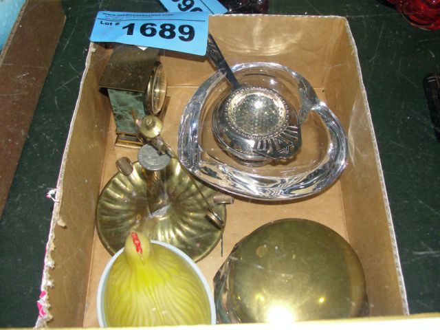 Box of vintage collectables; brasswares, glass