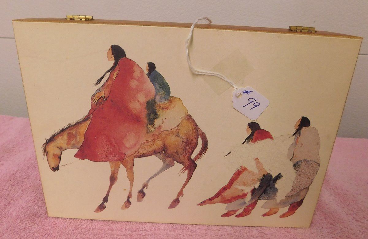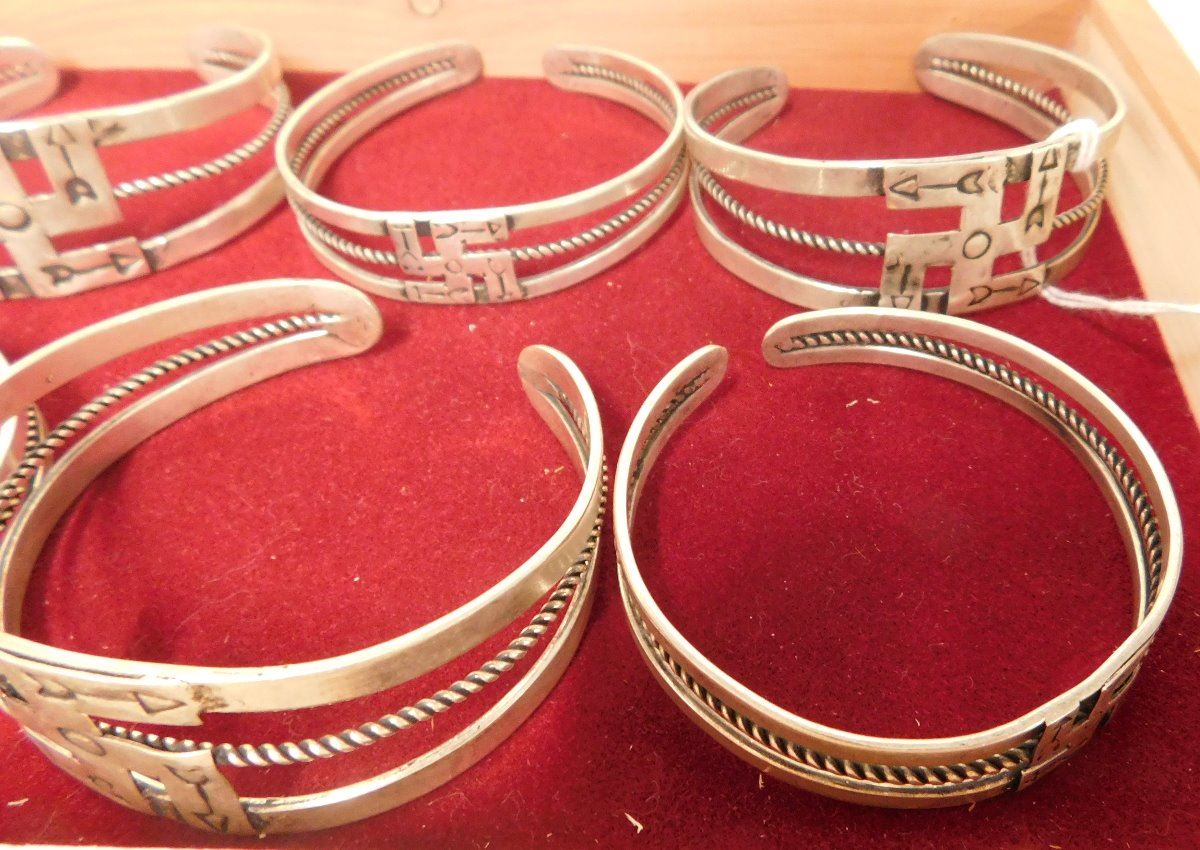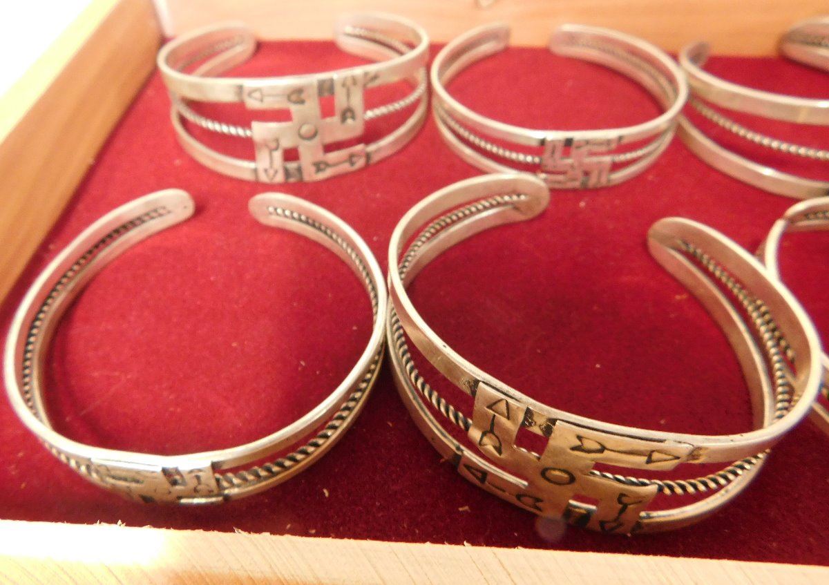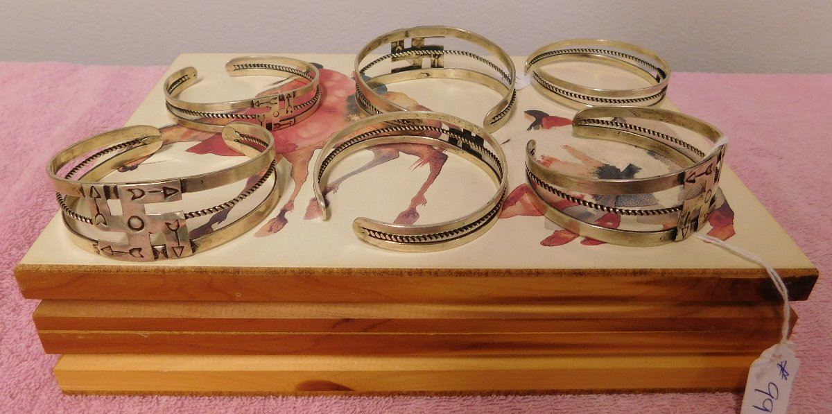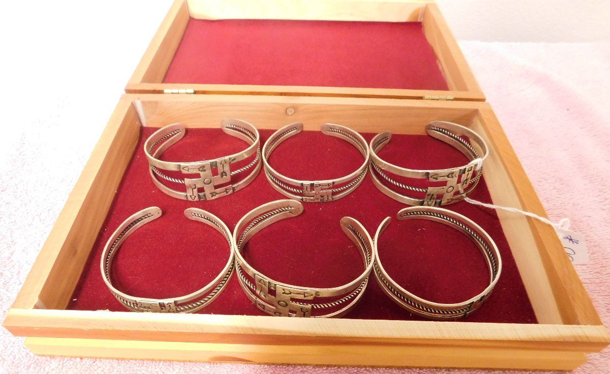 Box w/6 Fred Harvey-style Bracelets, circa 1930s. Made of sterling silver, the cuffs are of various sizes. The box measures 9.25" x 6.5" x 2.25". Navajo, Santa Fe, New Mexico. Nice group of bracelets. Condition: Good, see images. Shipping: $24.50.