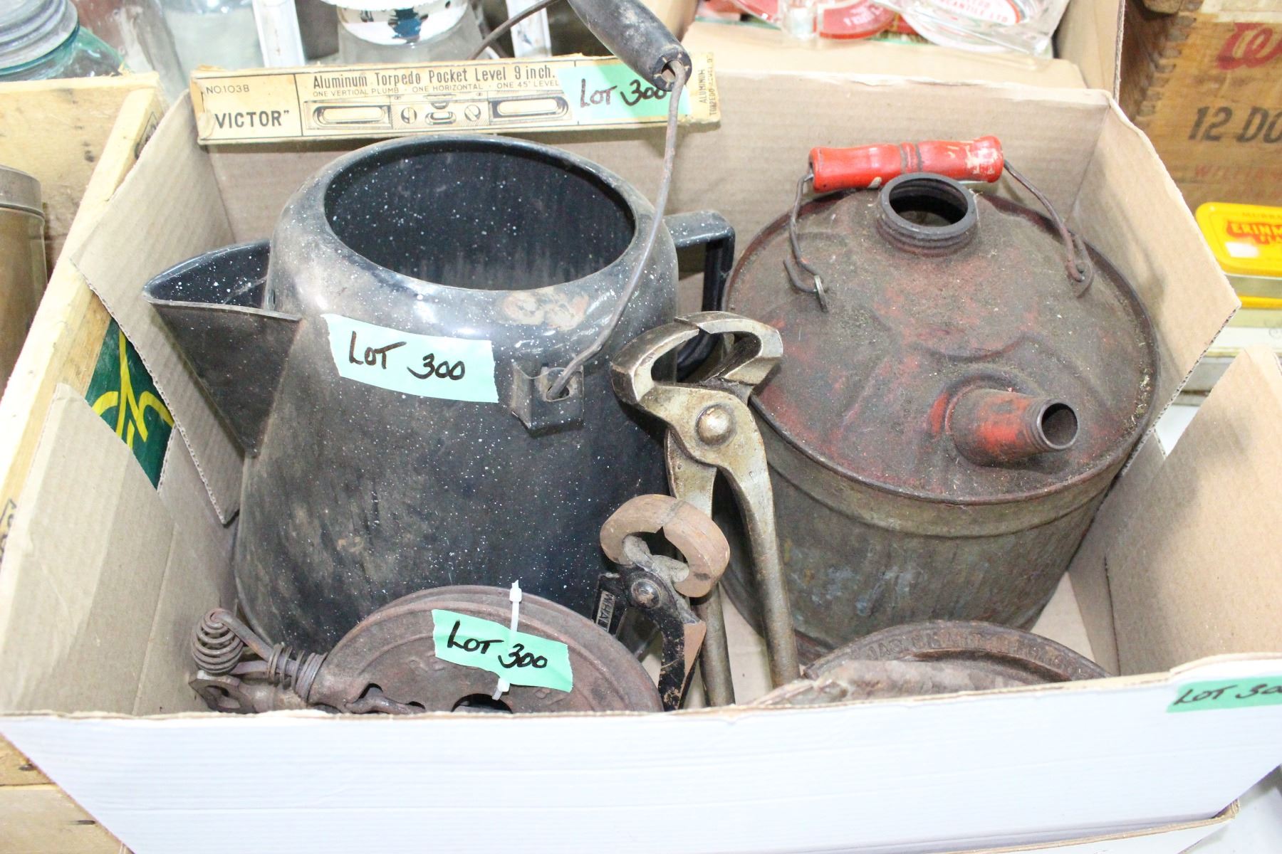Box w/Level, Stove Dampers, Sad Irons, Old Nippers, Kettle & a Gas Can