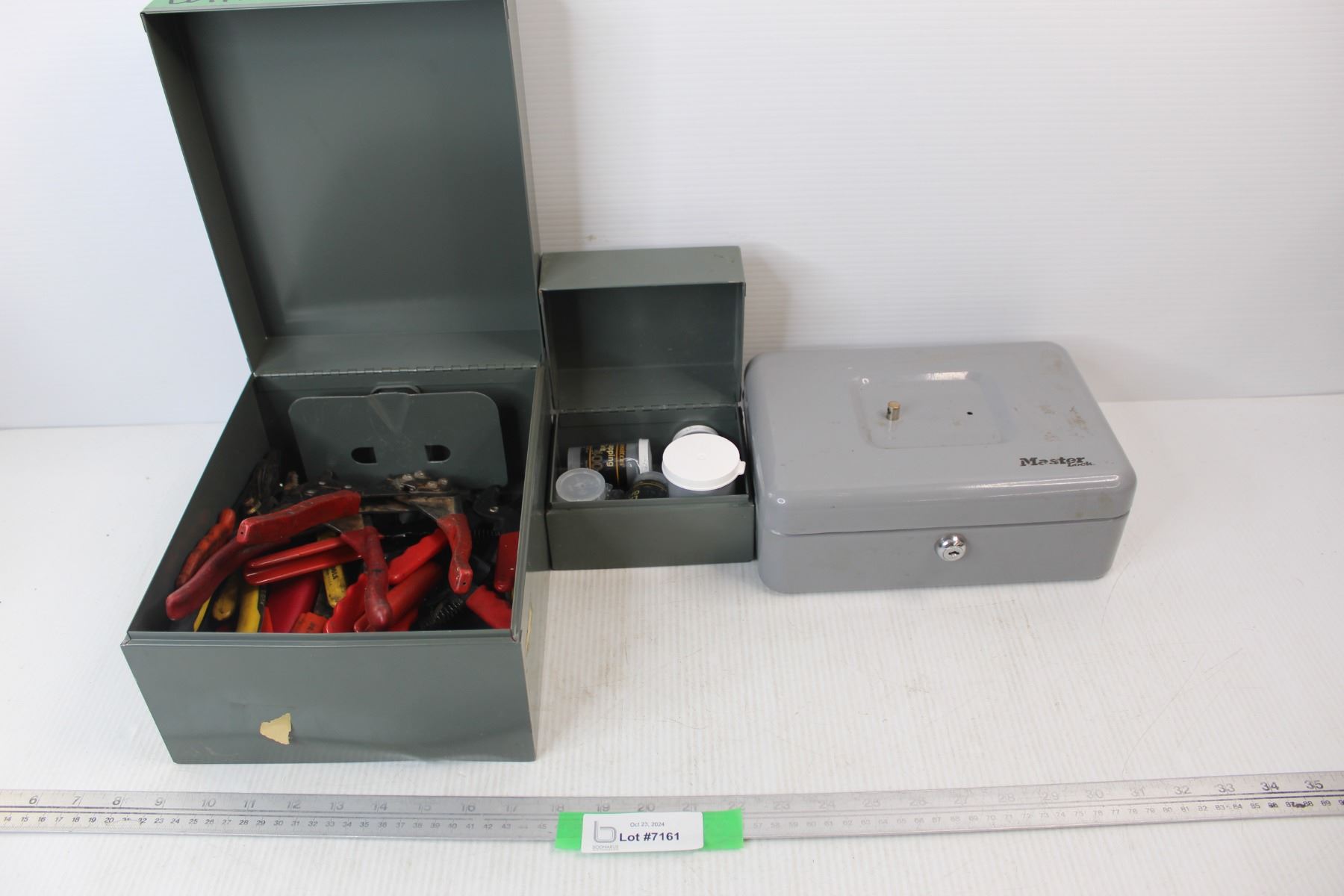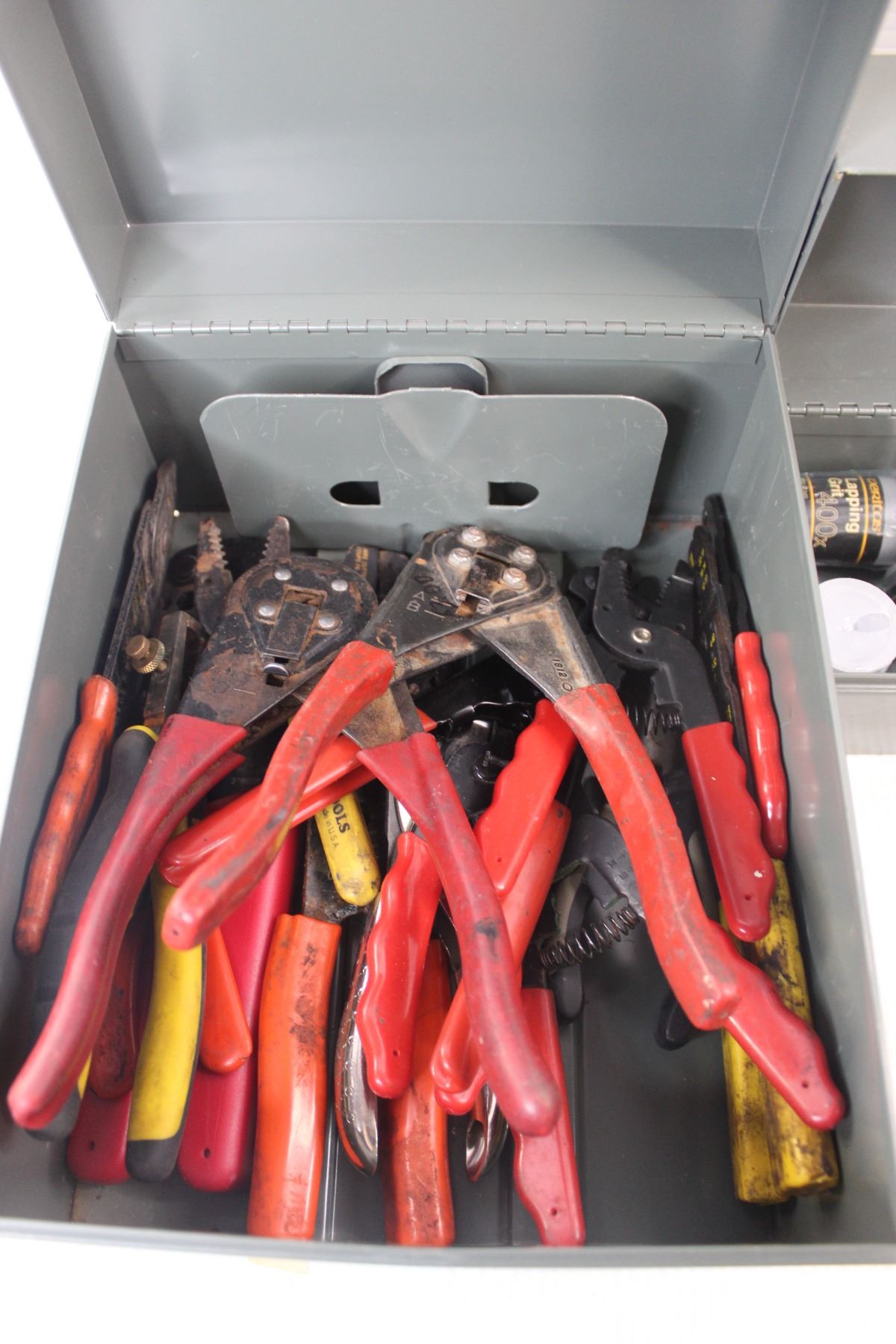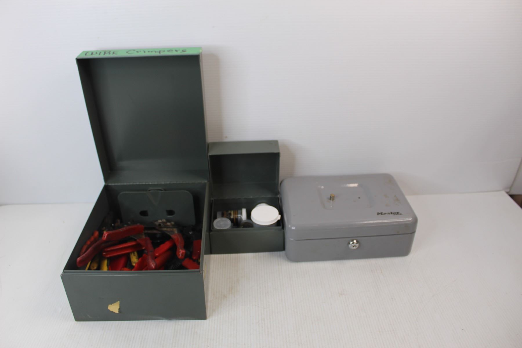 Box w/ Various Wire Crimpers/ Strippers, Lapping Grit, Cash Box