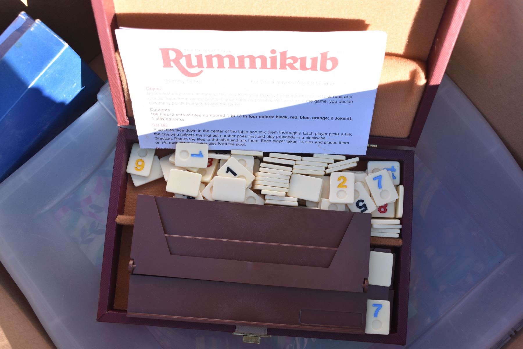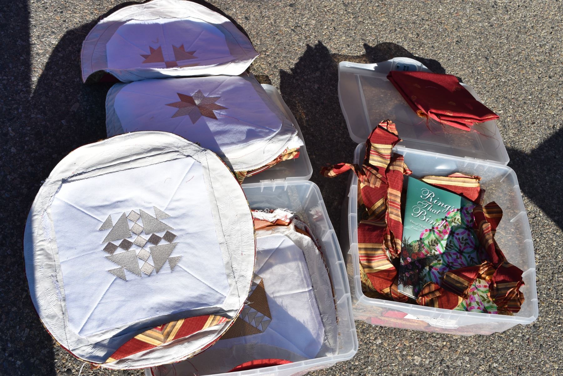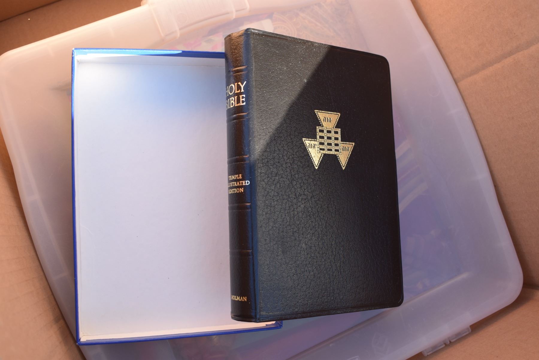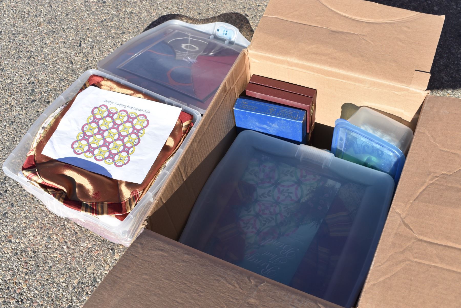 Box with 2 storage containers of crafting fabric + Holy Bible